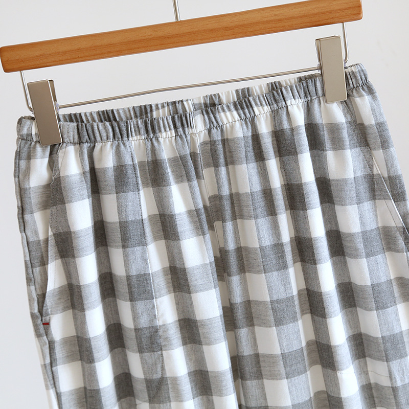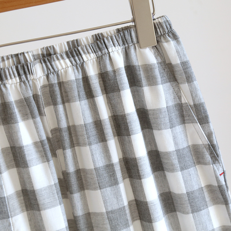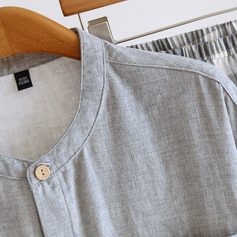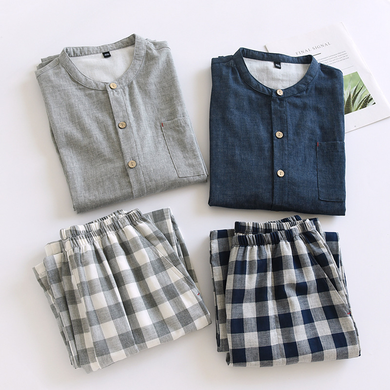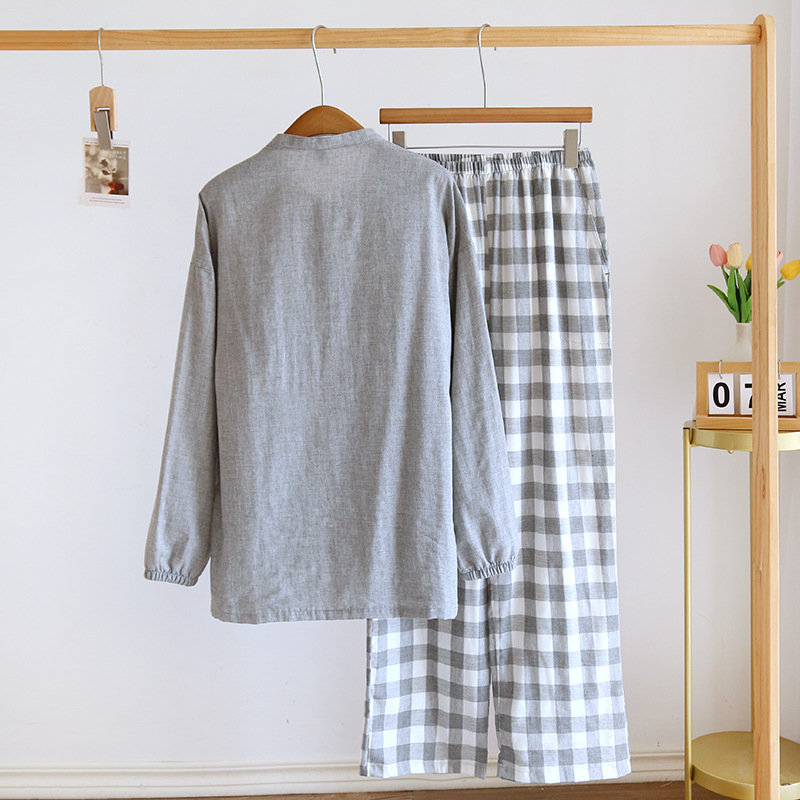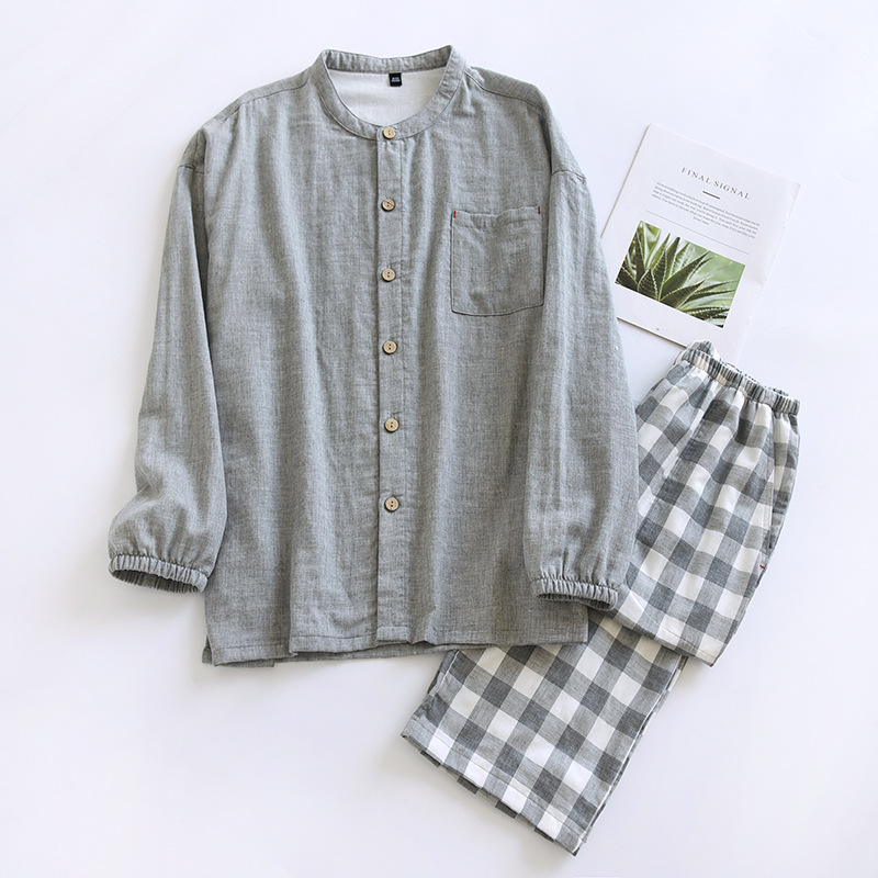 남자의 잠옷 봄과 가을 여름 간단한 인쇄되지 않은 스타일 색상 회전 순면 거즈 얇은 긴 소매 새로운 스타일 가정 옷 세트스토어 가기
