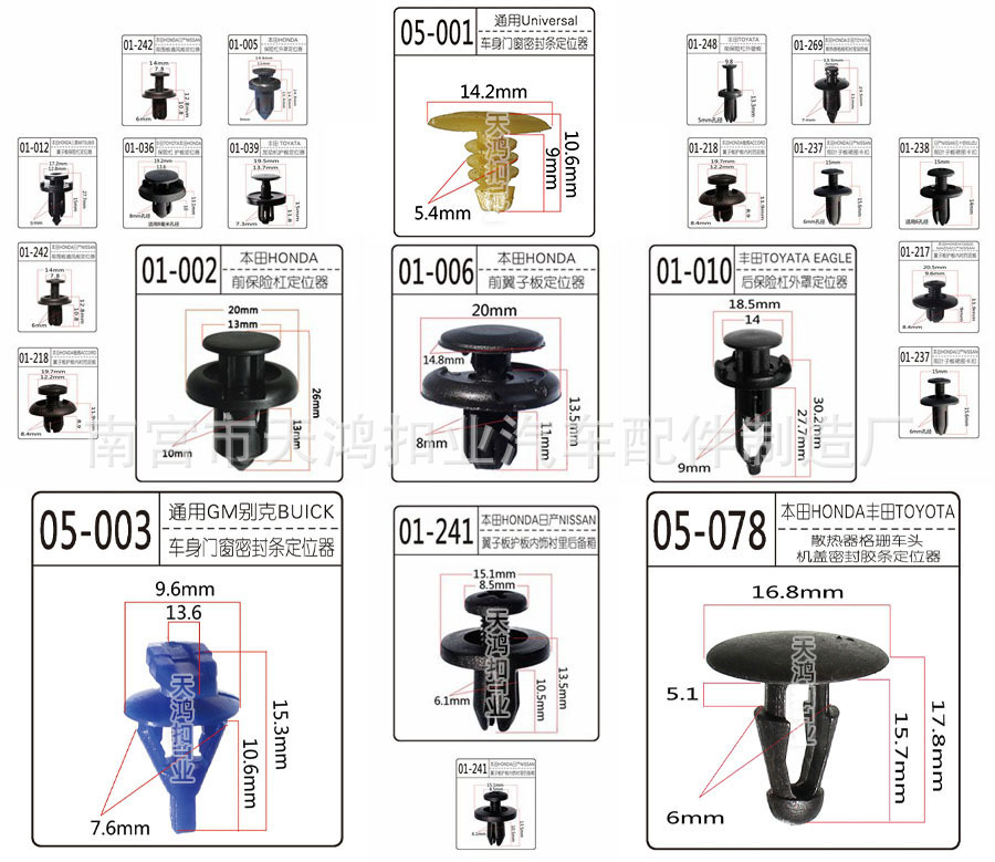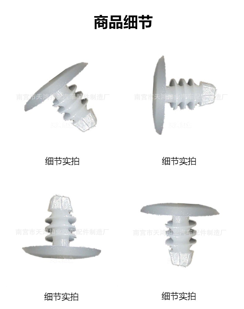 河北省南宫市天鸿扣业汽车配件制造厂,主要对汽车卡扣、汽车塑料卡扣、塑料紧固件,塑料铆钉等产品的生产加工。我们拥有完整的质量管理体系。南宫市天鸿扣业汽车配件制造厂的诚信、服务和产品质量获得业界认可。欢迎各界朋友莅临参观、指导和业务 。
