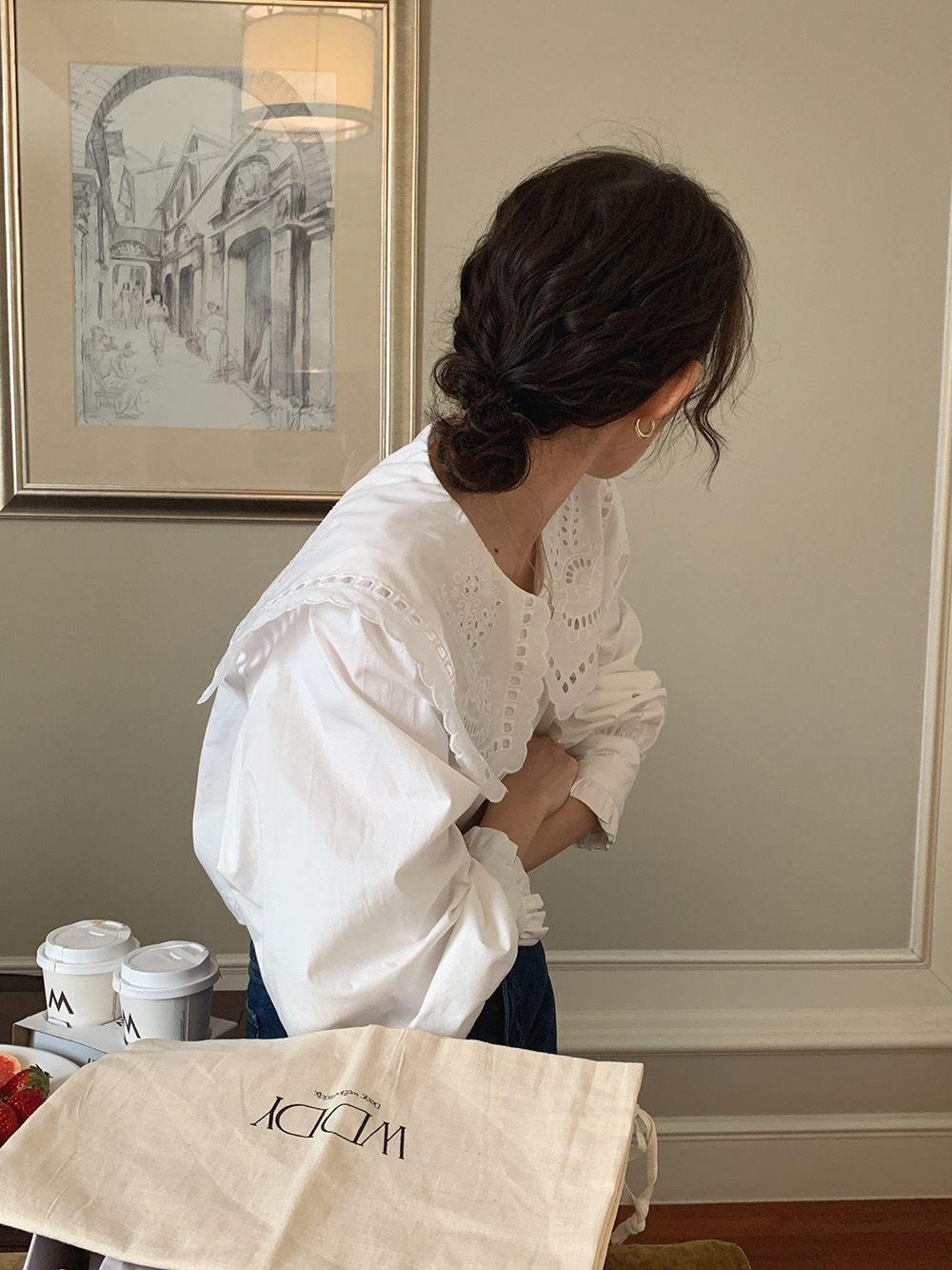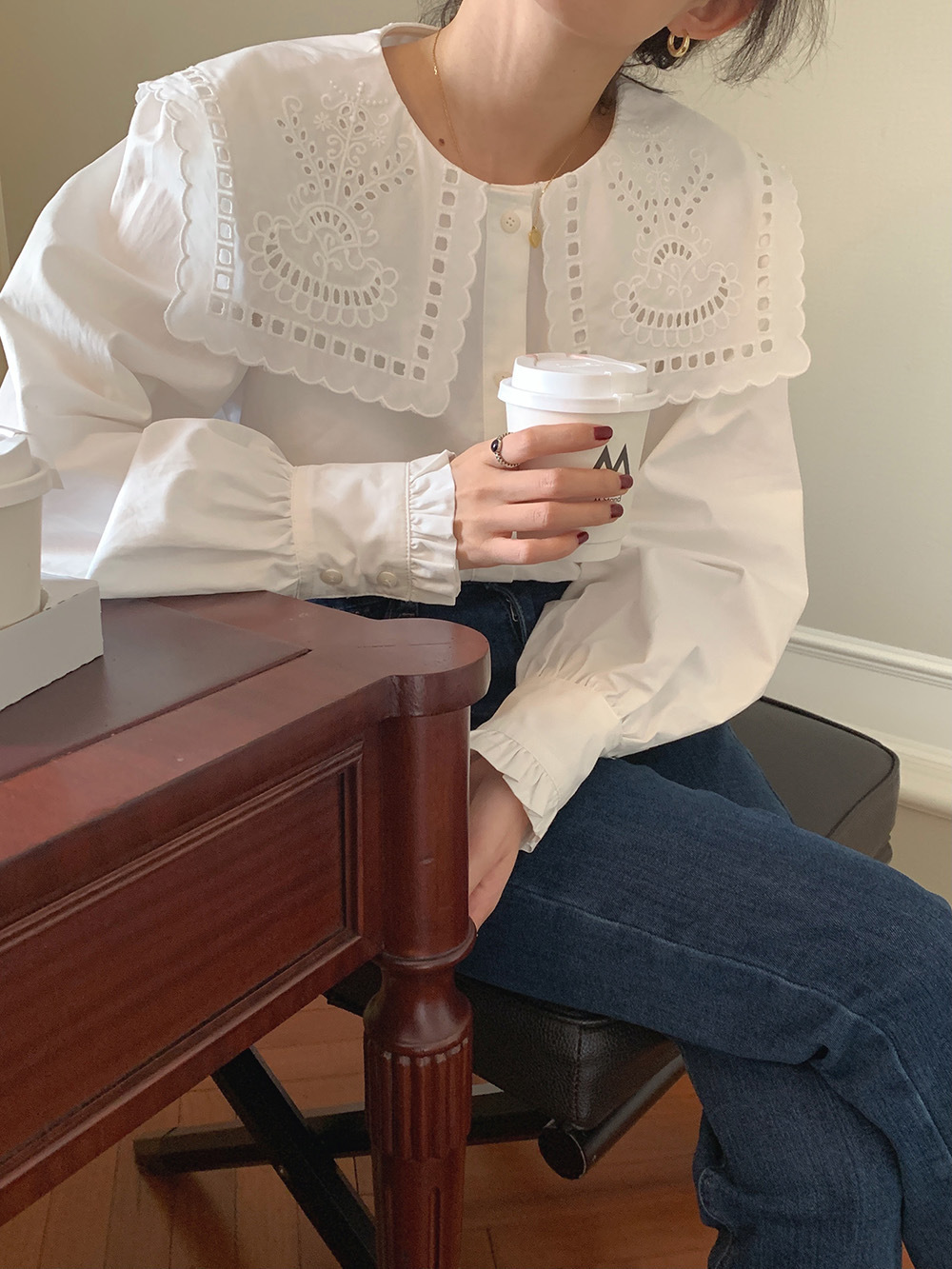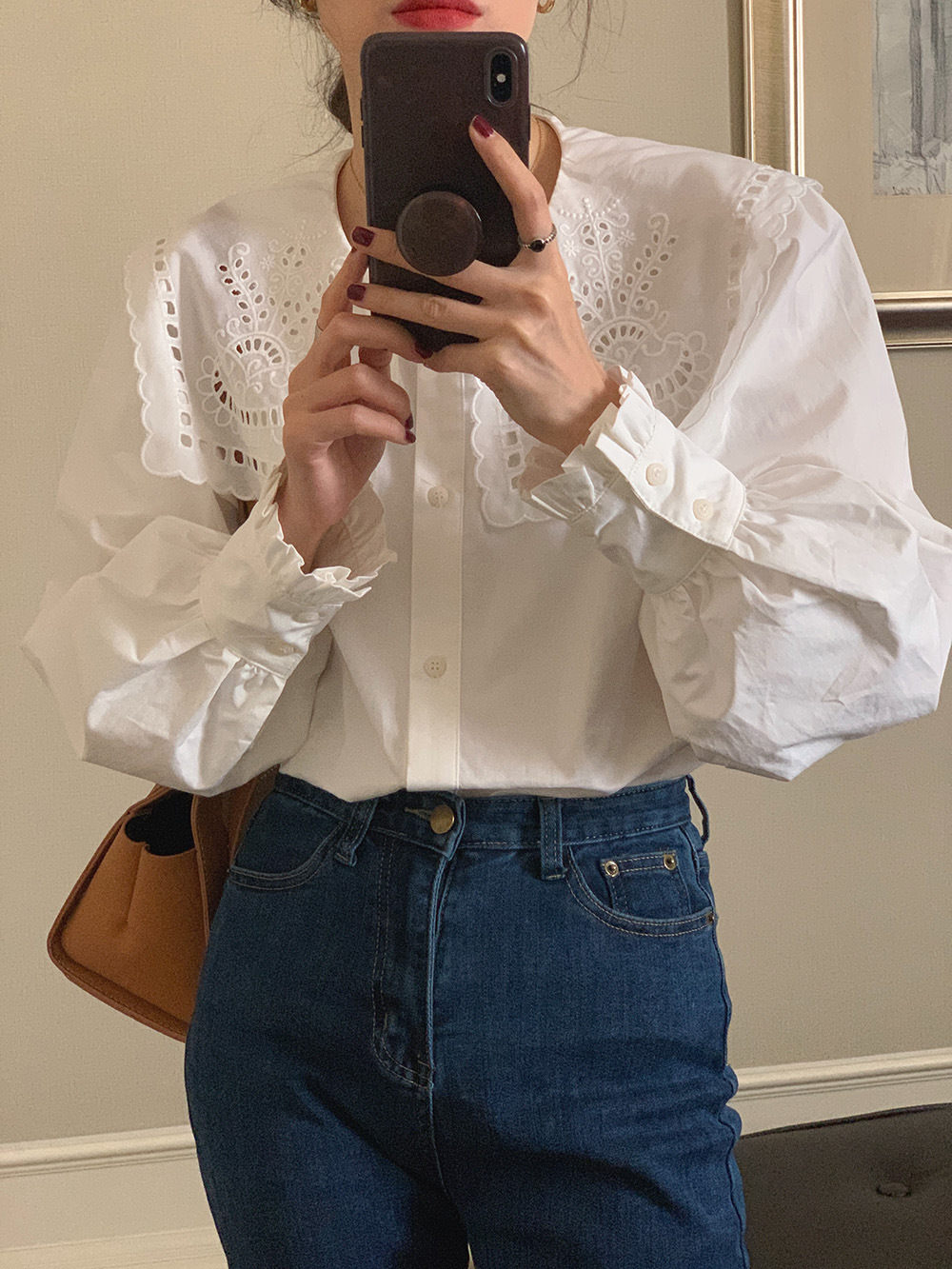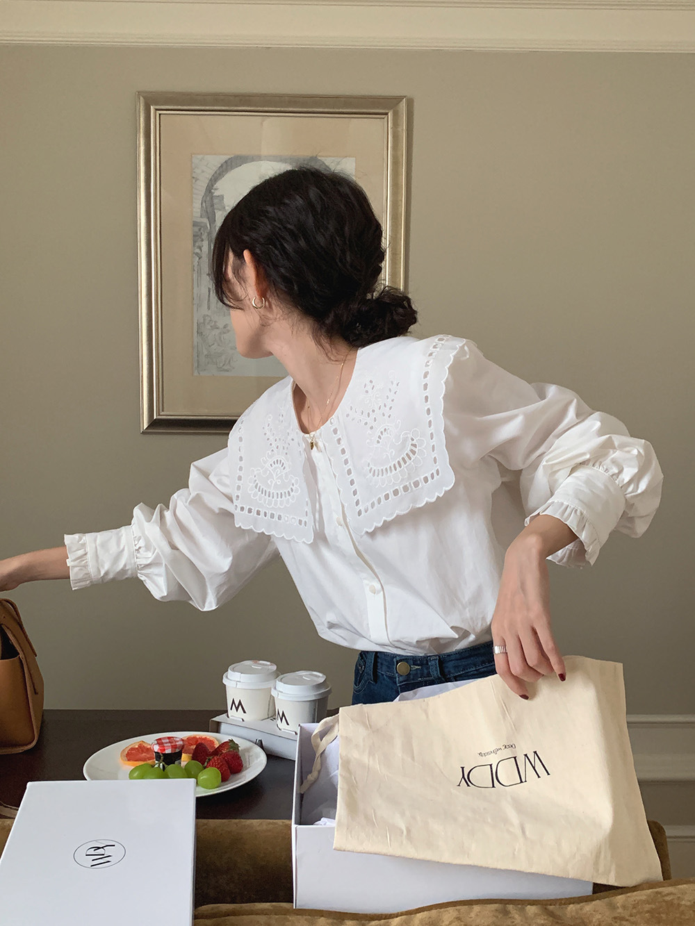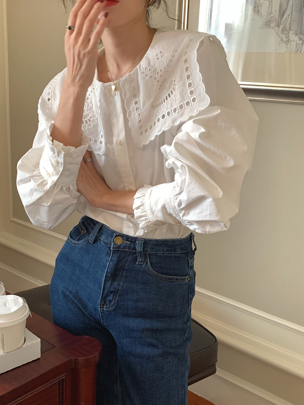 한국 세련된 스위트 팰리스 스타일 중공 대형 옷깃 싱글 브레스트 루즈 올 매치 여성용 귀 테두리 랜턴 슬리브 셔츠