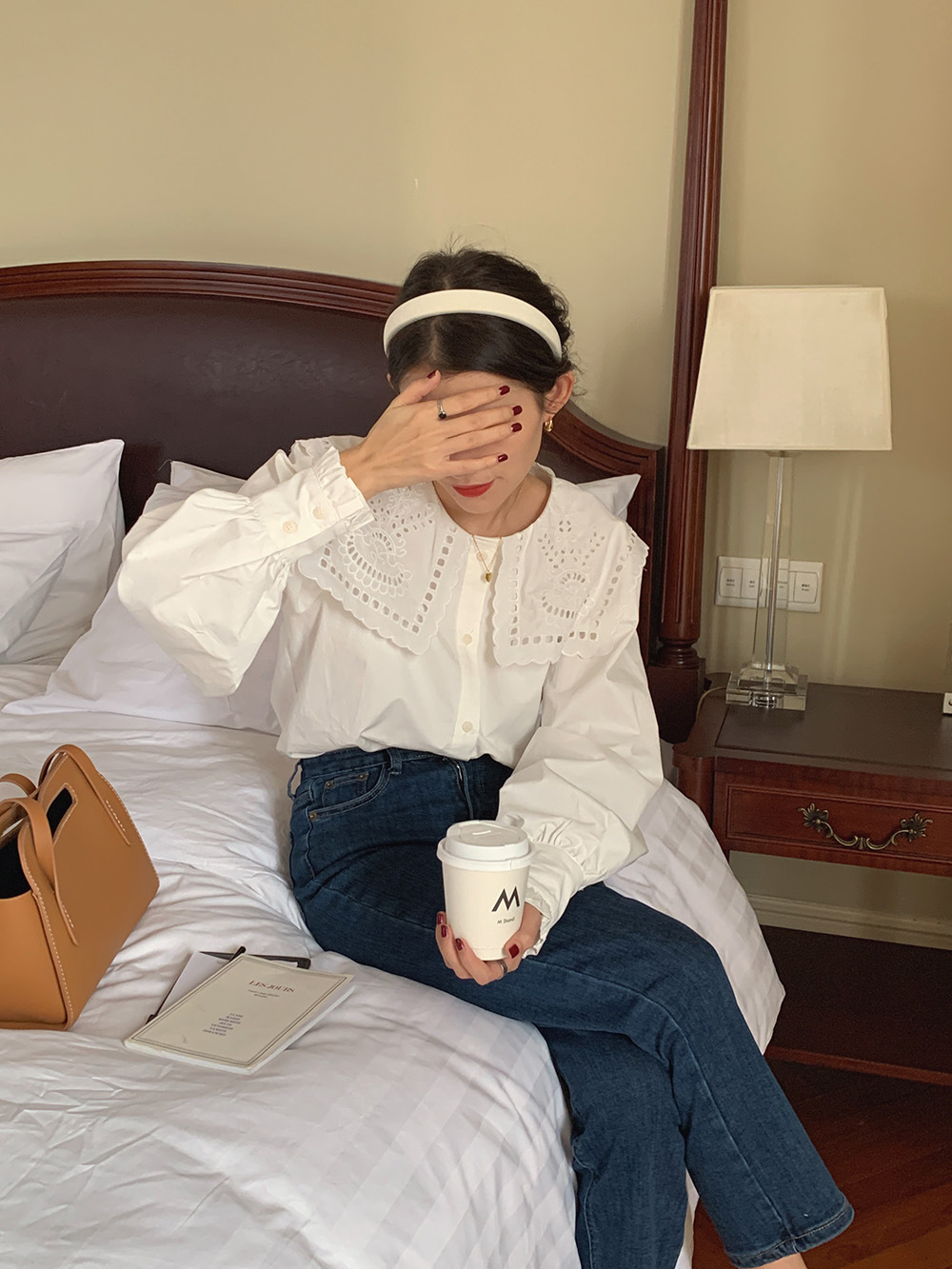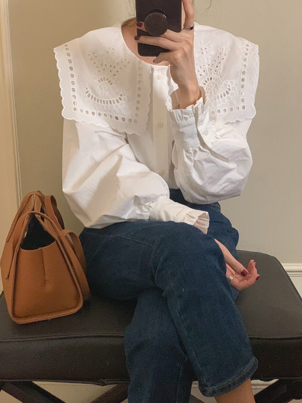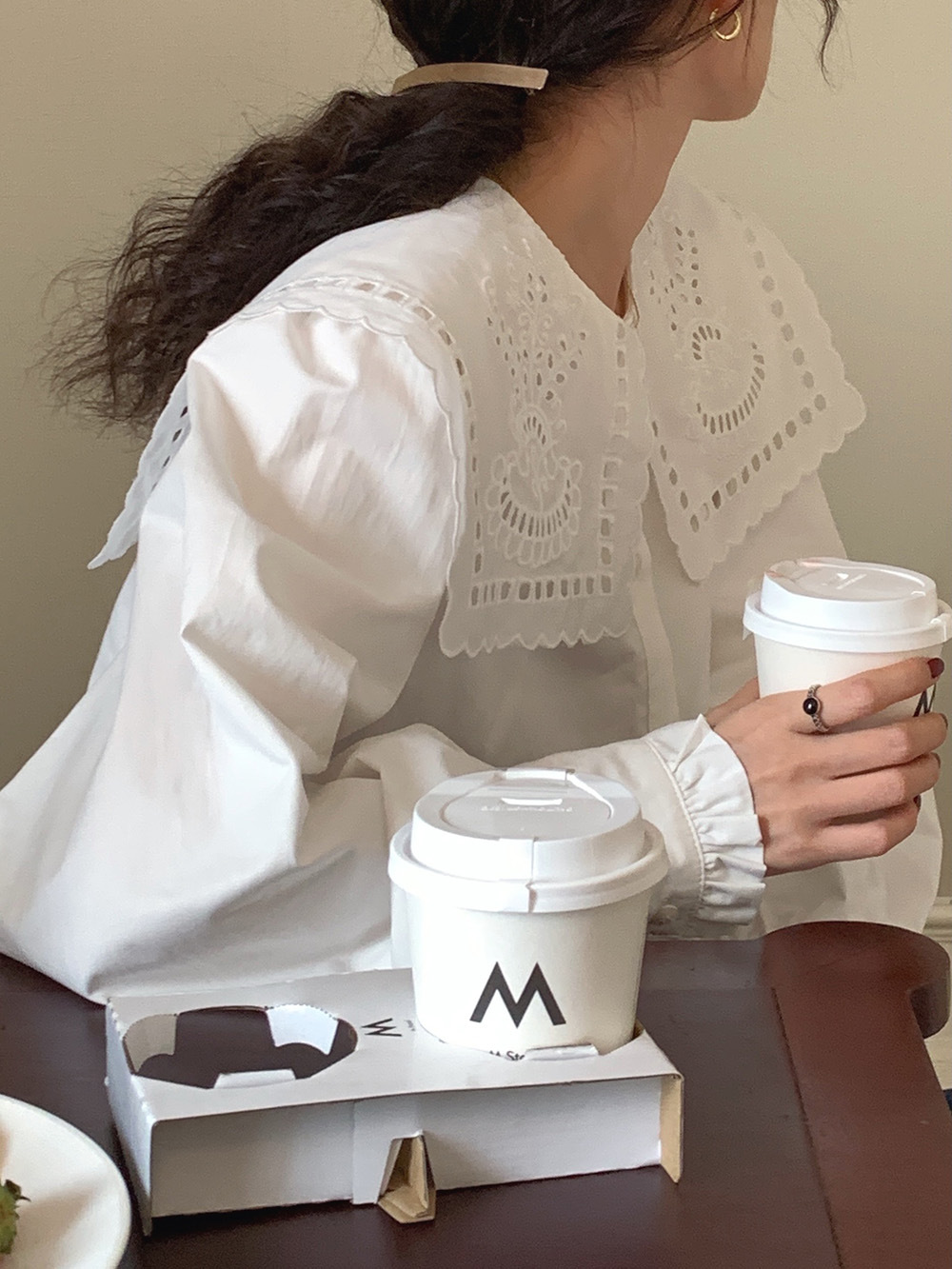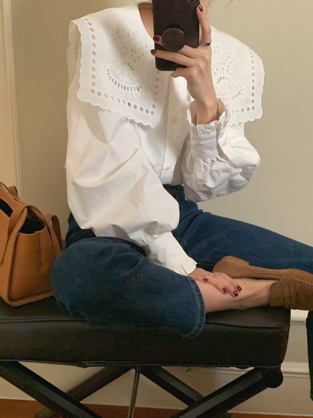한국 세련된 스위트 팰리스 스타일 중공 대형 옷깃 싱글 브레스트 루즈 올 매치 여성용 귀 테두리 랜턴 슬리브 셔츠