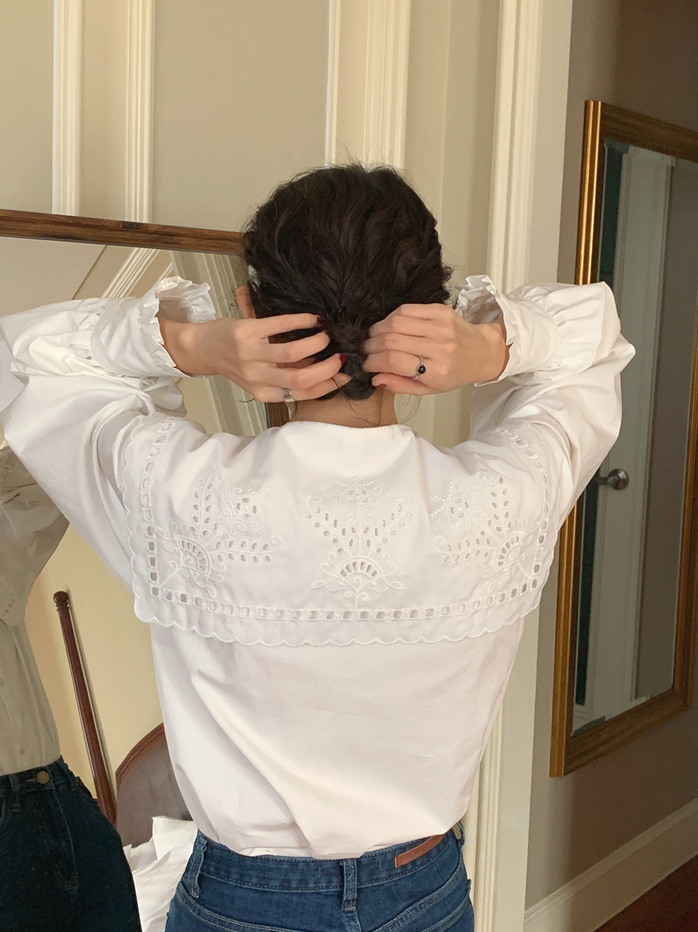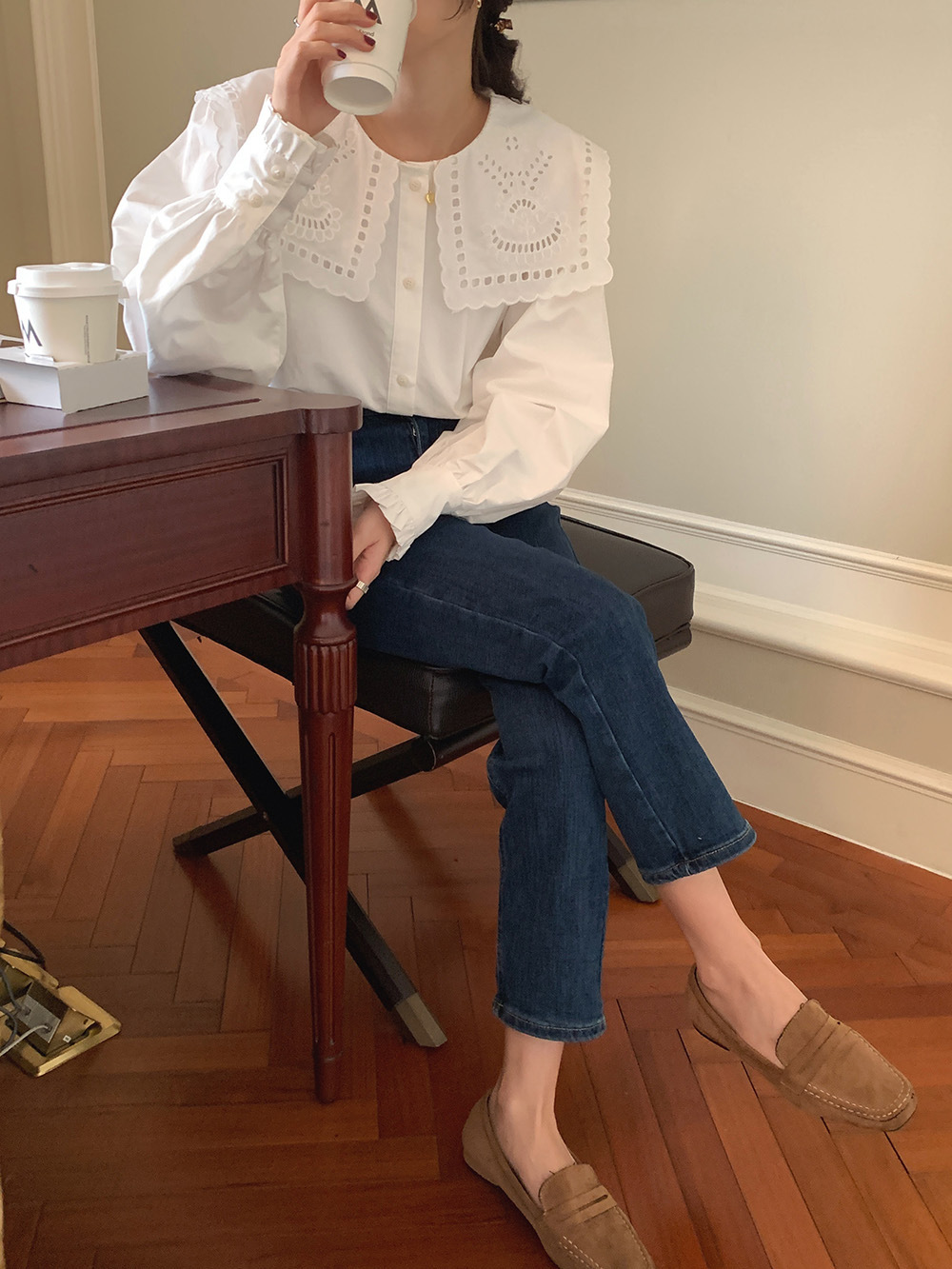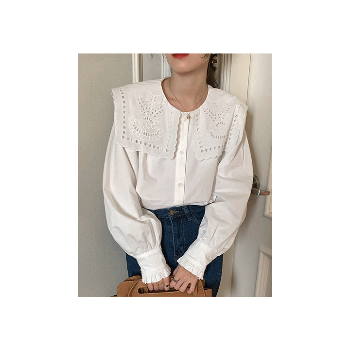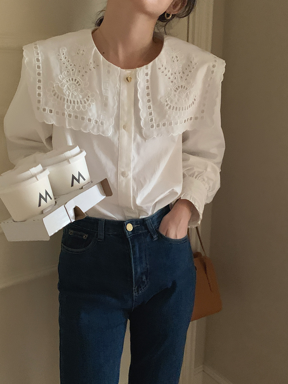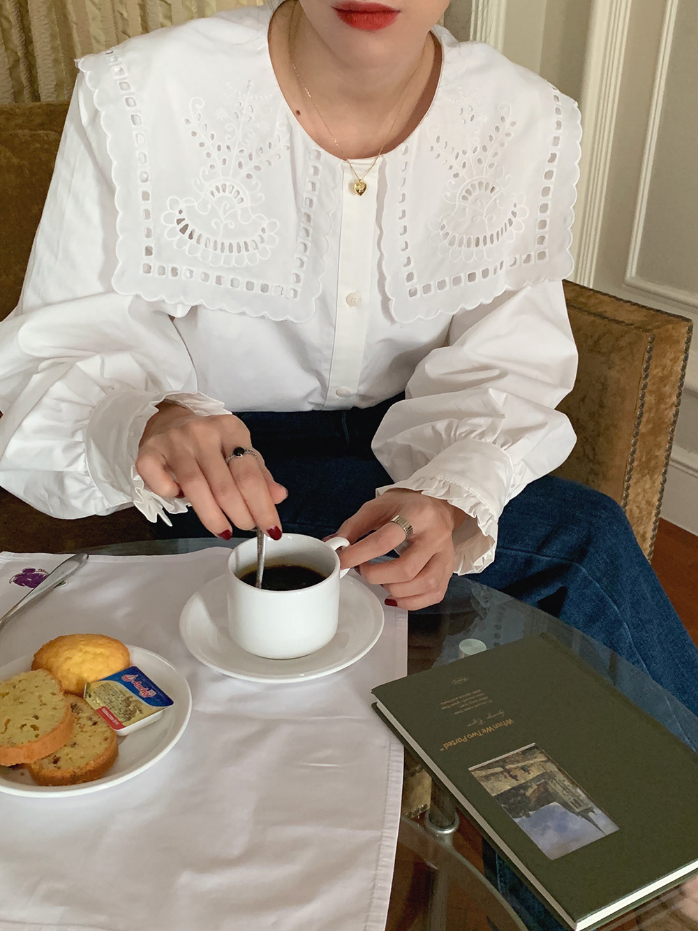한국 세련된 스위트 팰리스 스타일 중공 대형 옷깃 싱글 브레스트 루즈 올 매치 여성용 귀 테두리 랜턴 슬리브 셔츠