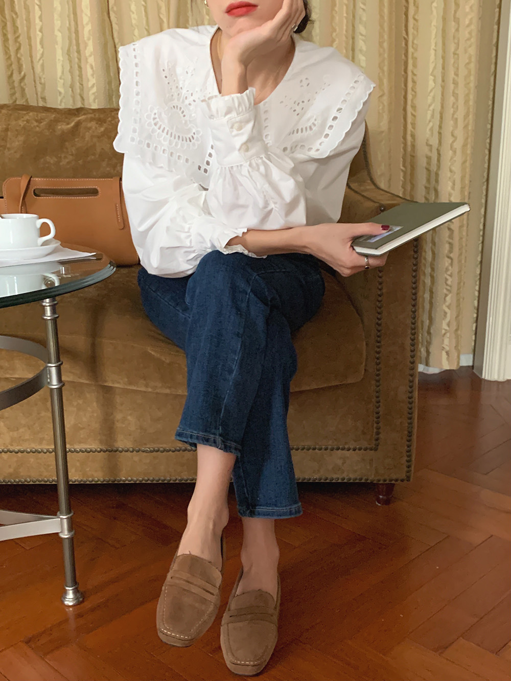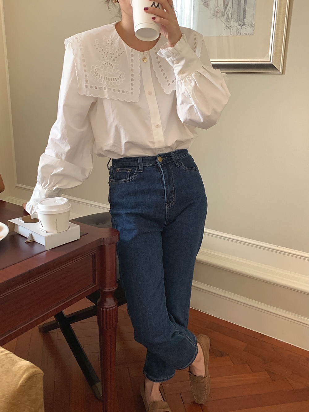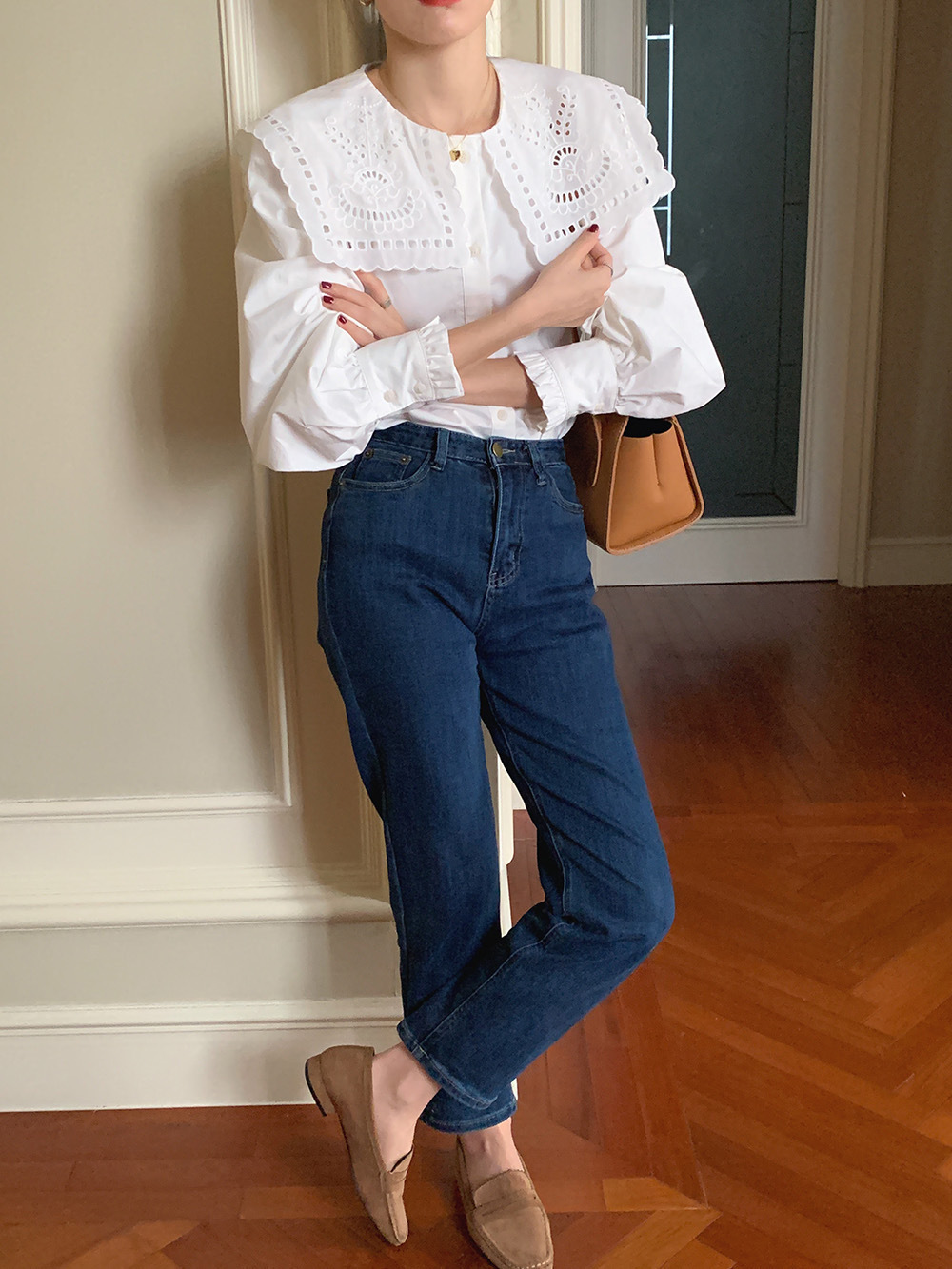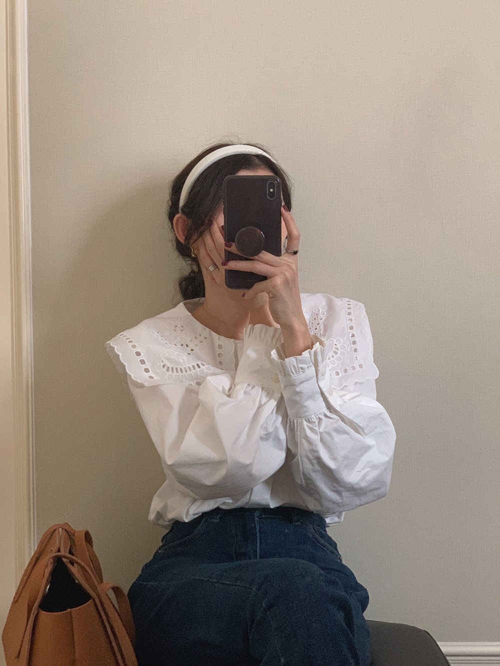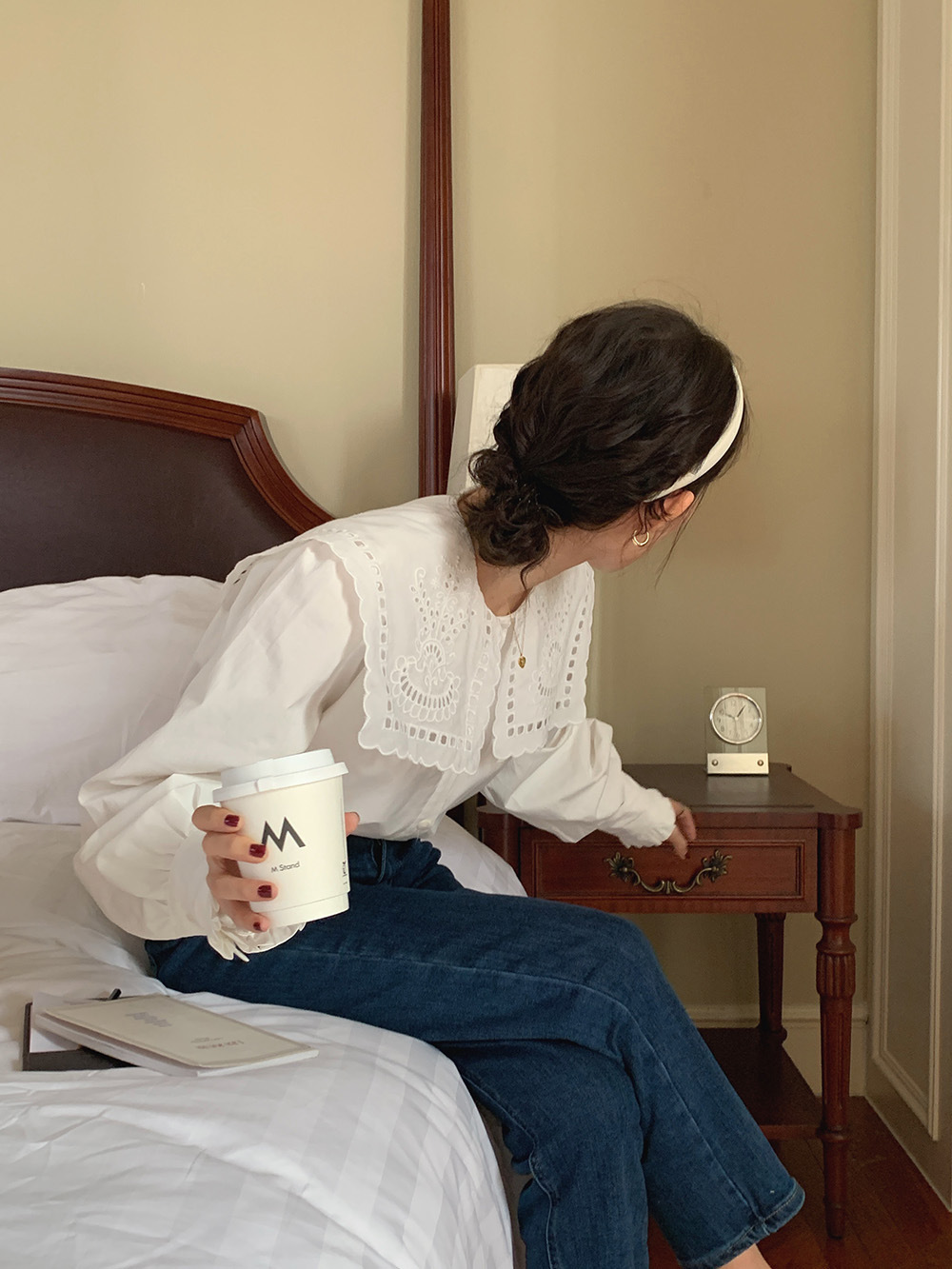 한국 세련된 스위트 팰리스 스타일 중공 대형 옷깃 싱글 브레스트 루즈 올 매치 여성용 귀 테두리 랜턴 슬리브 셔츠