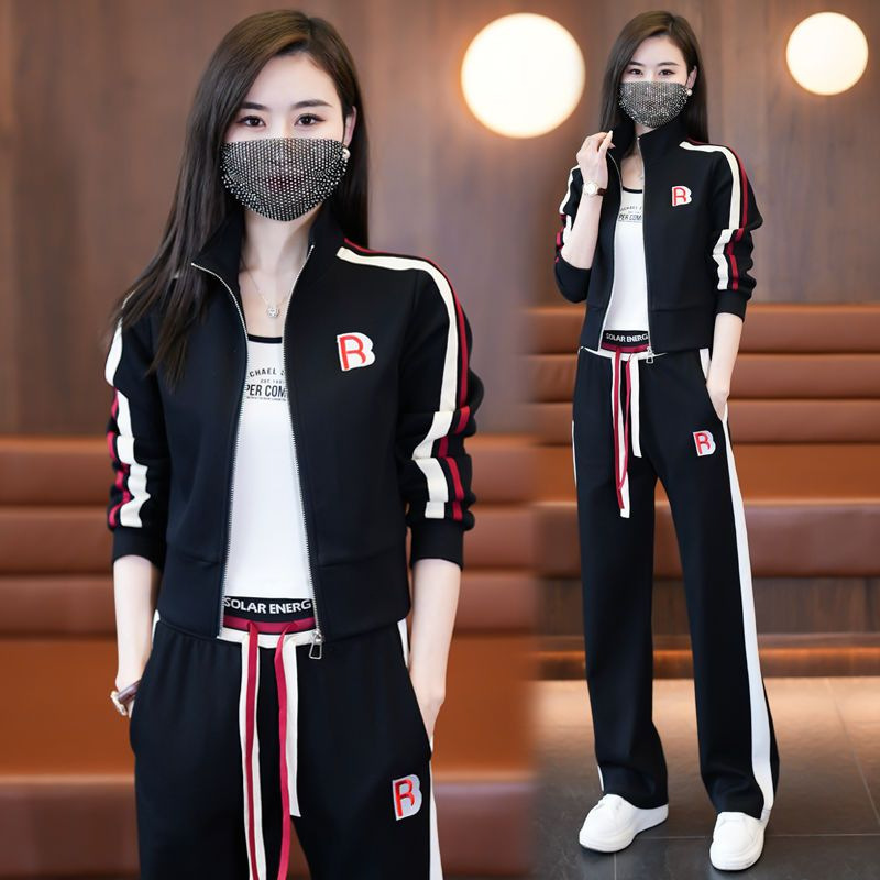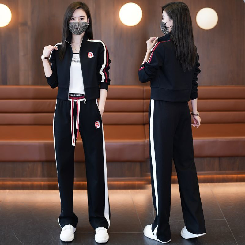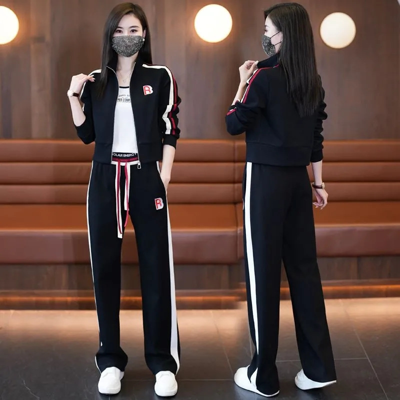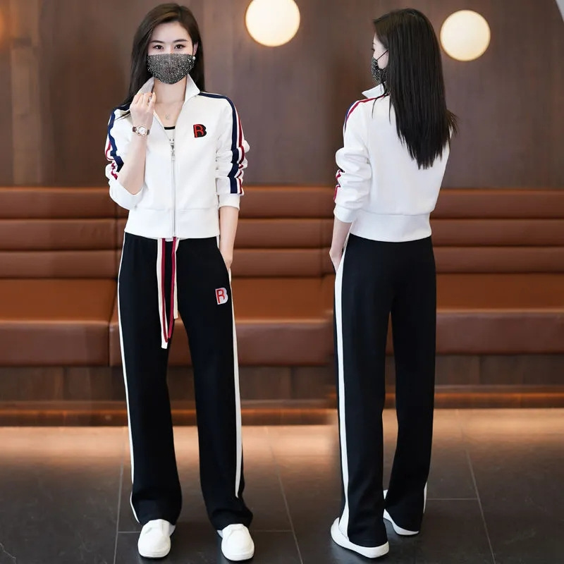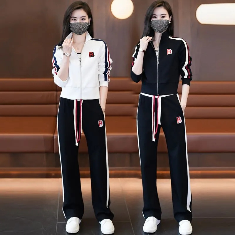 여성 캐주얼 스포츠 슈트 2024 봄 가을 신상 패션 젊어보이는 스타일 스탠드 칼라 재킷 와이드 팬츠 투피스 세트스토어 가기