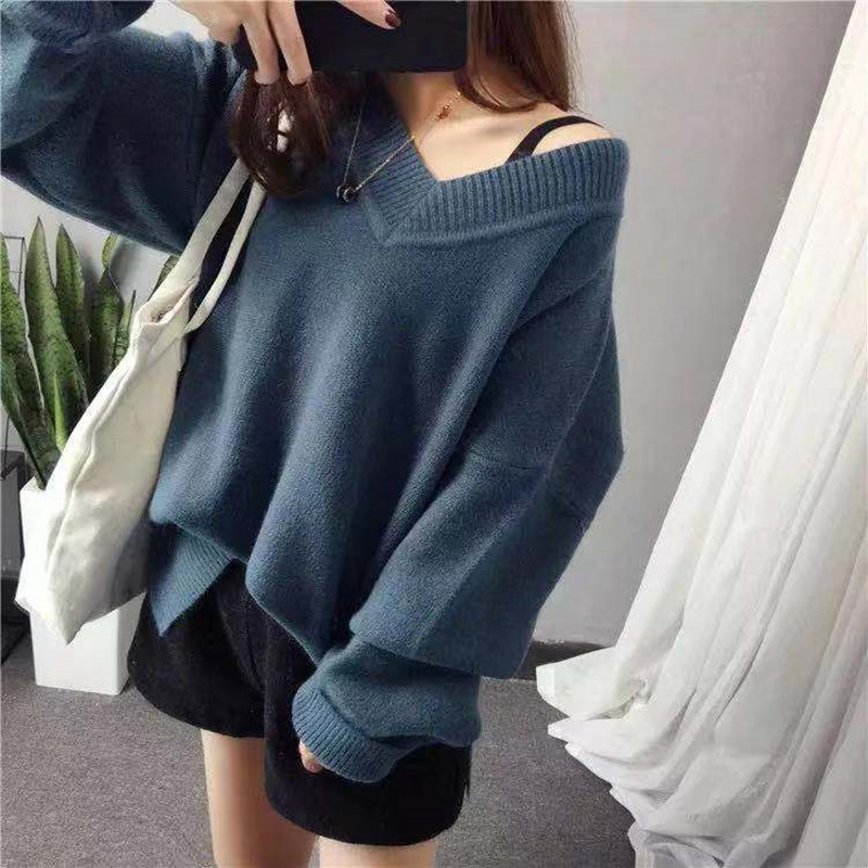 게으른 스타일 모든 매치 디자인 센스 V-넥 여성용 스웨터 가을과 겨울 기본 셔츠 풀오버 여성용 스웨터 단색 탑스토어 가기