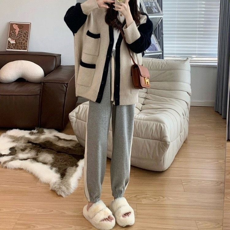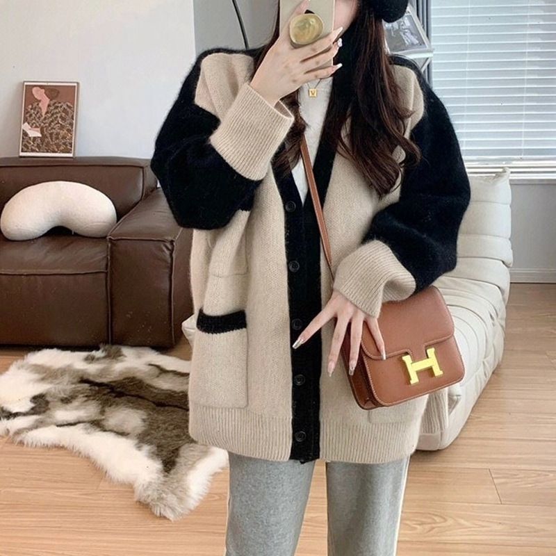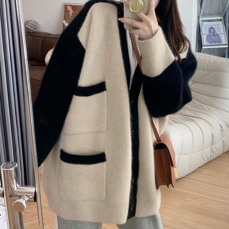 달콤한 레트로 스타일의 배색 포켓 달린 여유로운 니트 가디건 여성용 25년 봄 부드럽고 헐렁한 스웨터 재킷 상의스토어 가기