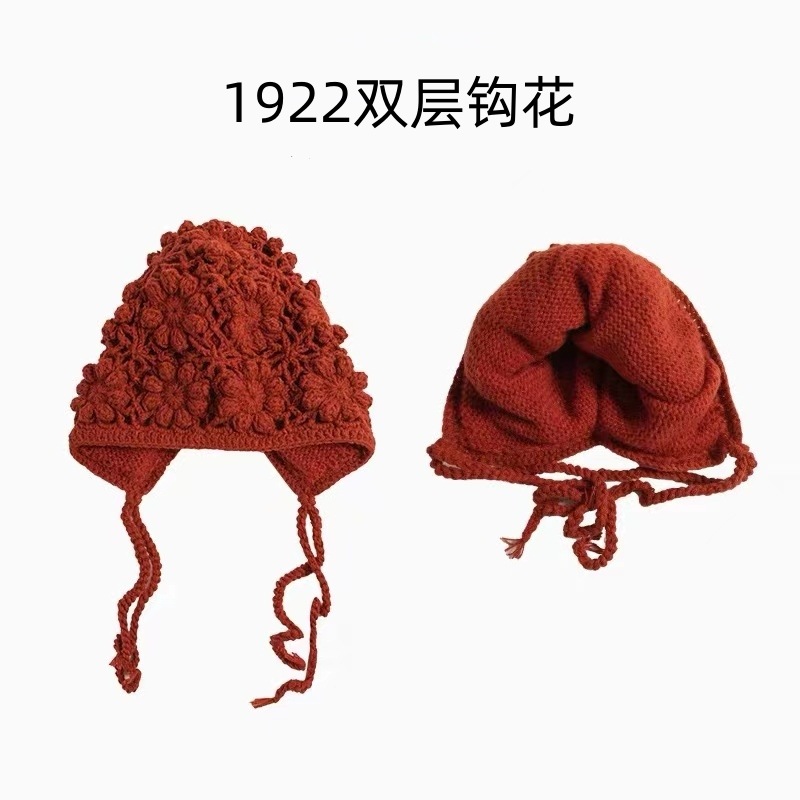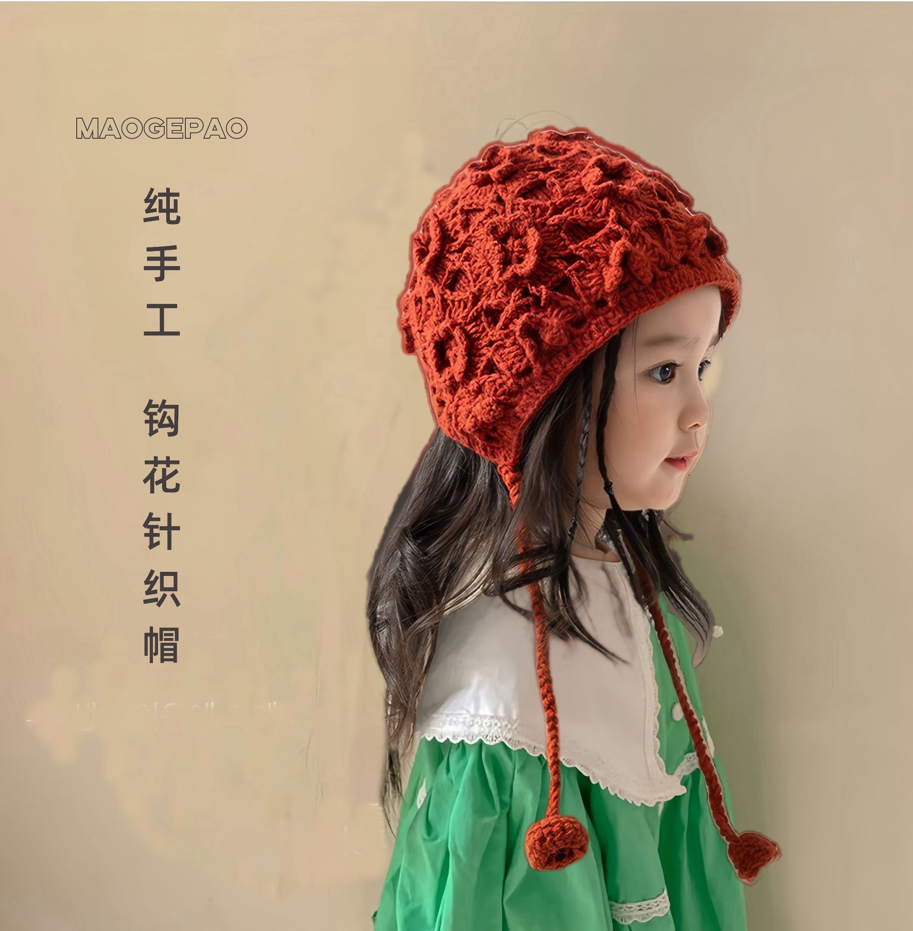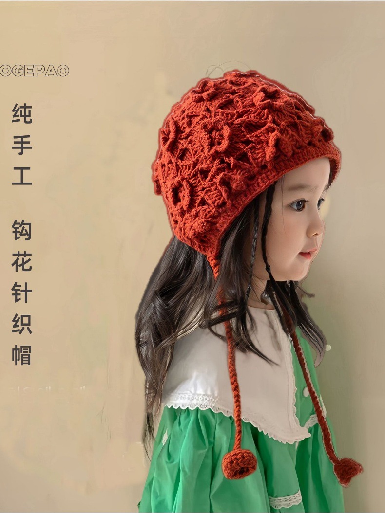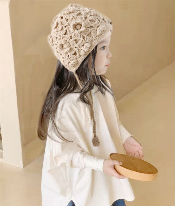 2024 새로운 어린이 모자 가을, 겨울 중공 꽃 양모 모자 소녀 니트 귀 보호 모자 아기 소녀 풀오버 모자