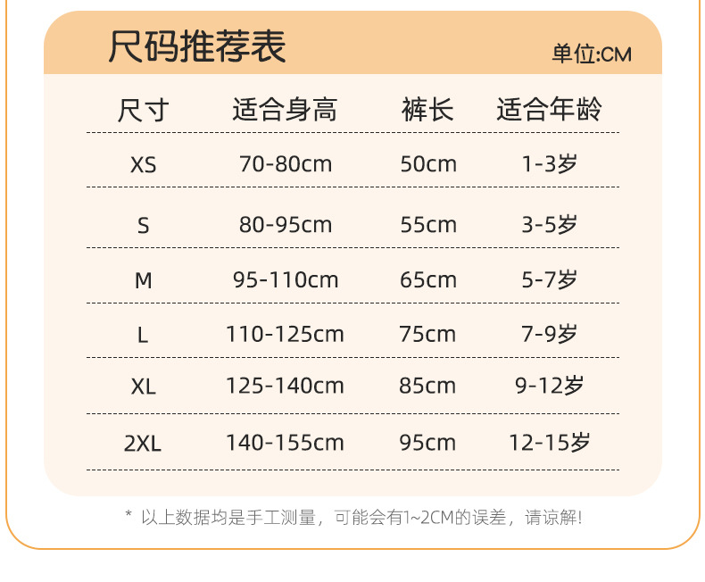 XS:身高70-80,裤长50,适合1-3岁