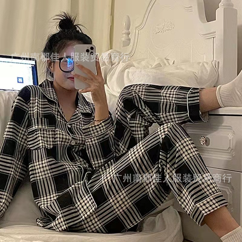새로운 격자 무늬 잠옷 여자의 일본식 한국식 귀여운 긴팔 봄과 가을 가정복 겉옷 투피스 세트 크로스 보더 도매스토어 가기