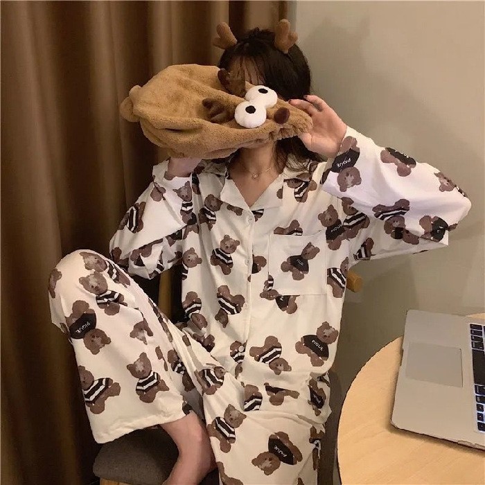새로운 격자 무늬 잠옷 여자의 일본식 한국식 귀여운 긴팔 봄과 가을 가정복 겉옷 투피스 세트 크로스 보더 도매