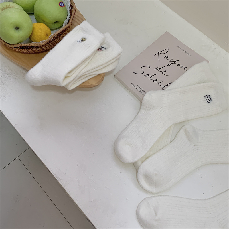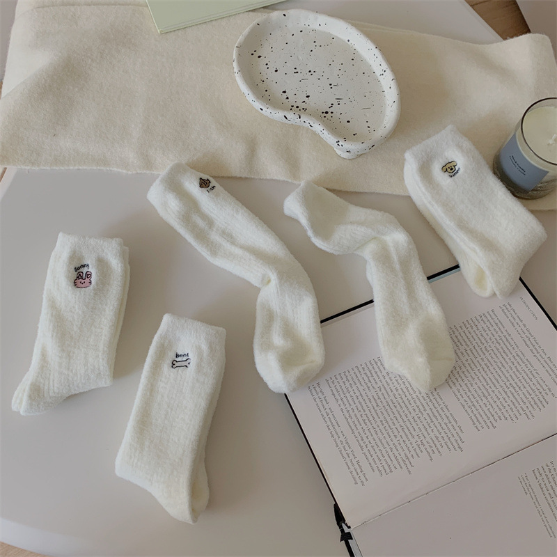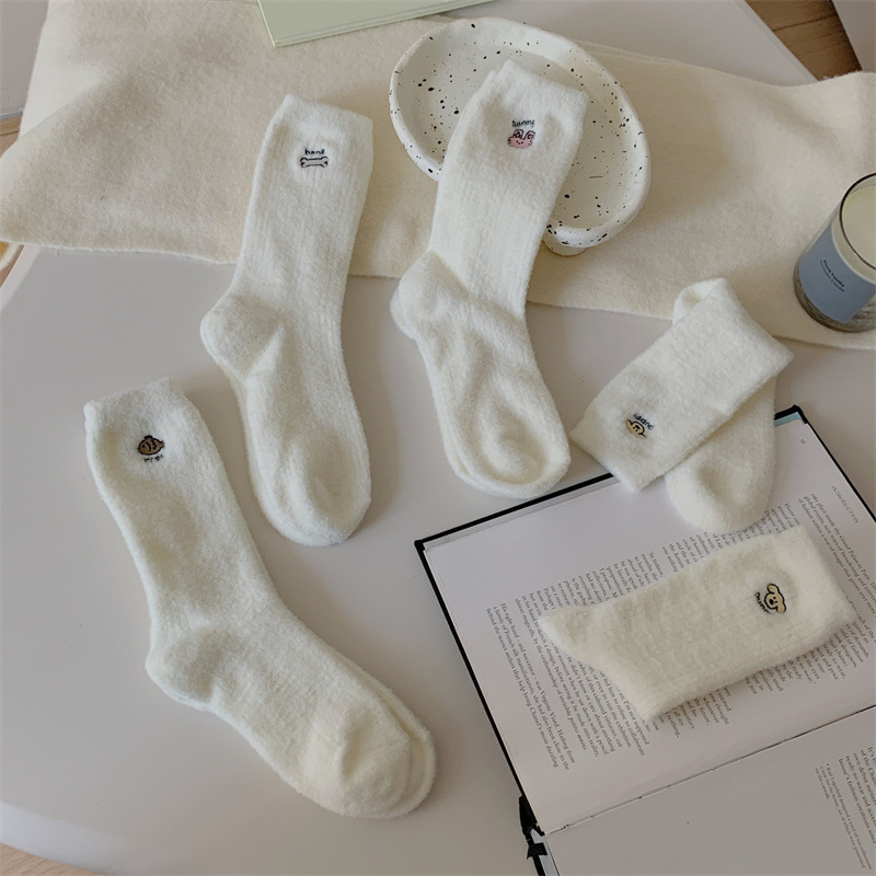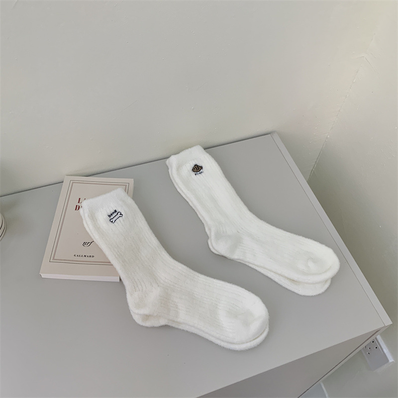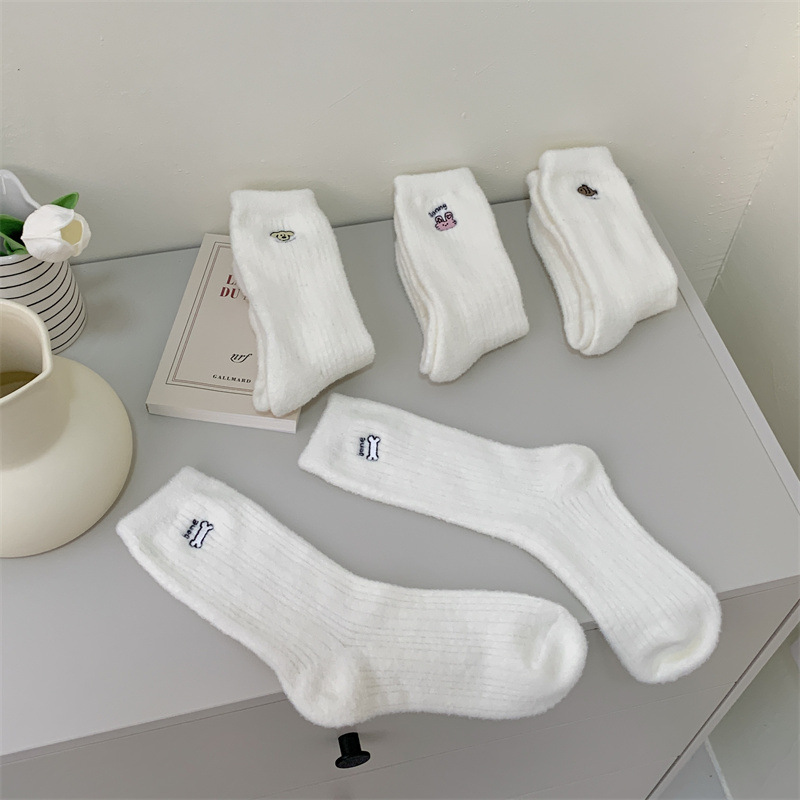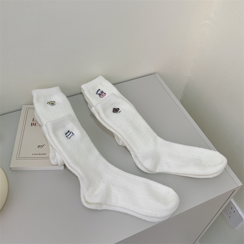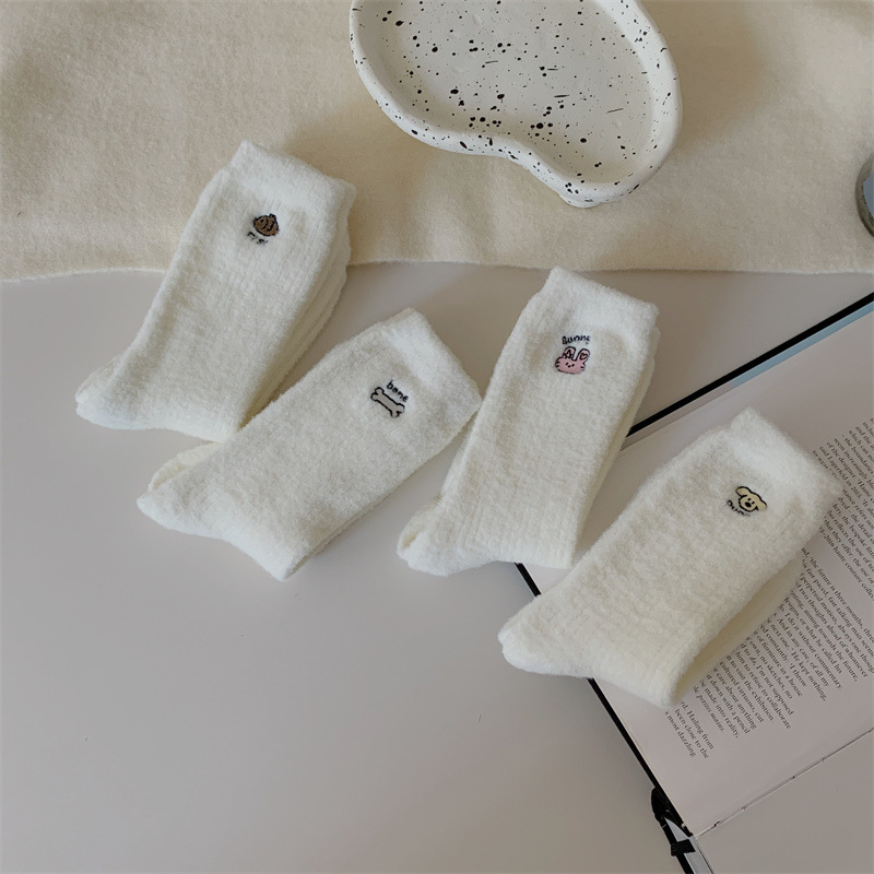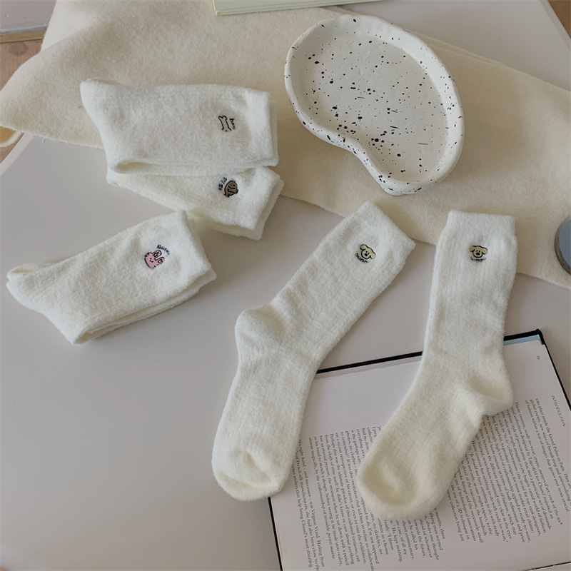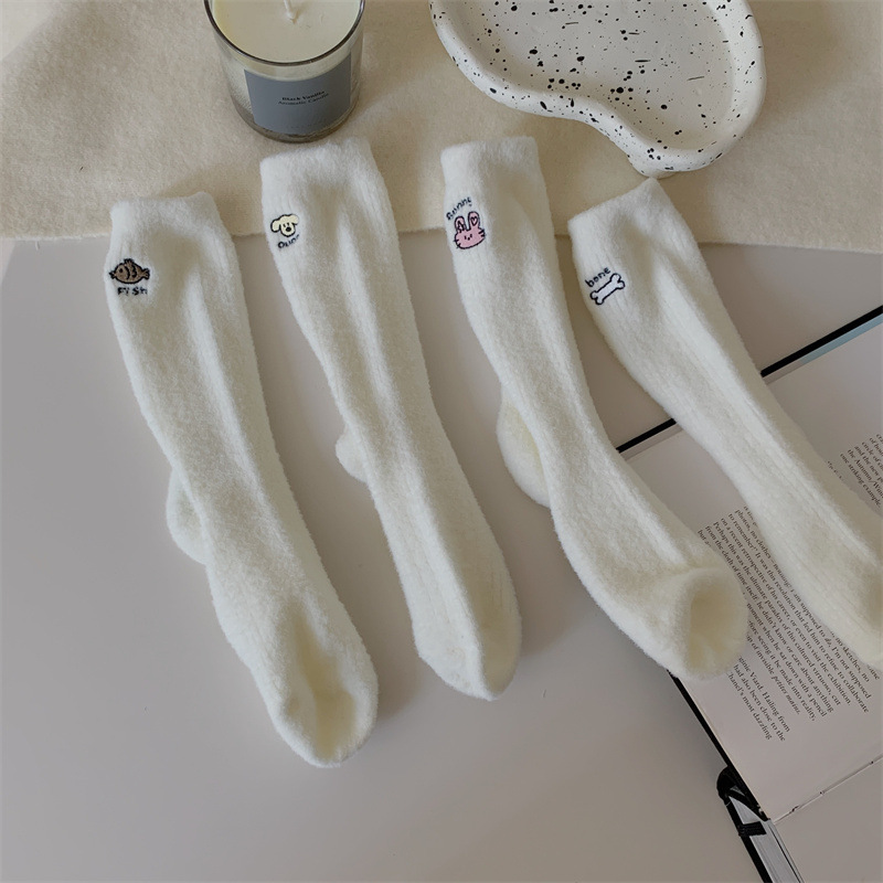 일본 단색 귀여운 두꺼운 흰색 만화 자수 중간 튜브 가을과 겨울 양말 여성용 모조 밍크 벨벳 홈 바닥 양말스토어 가기
