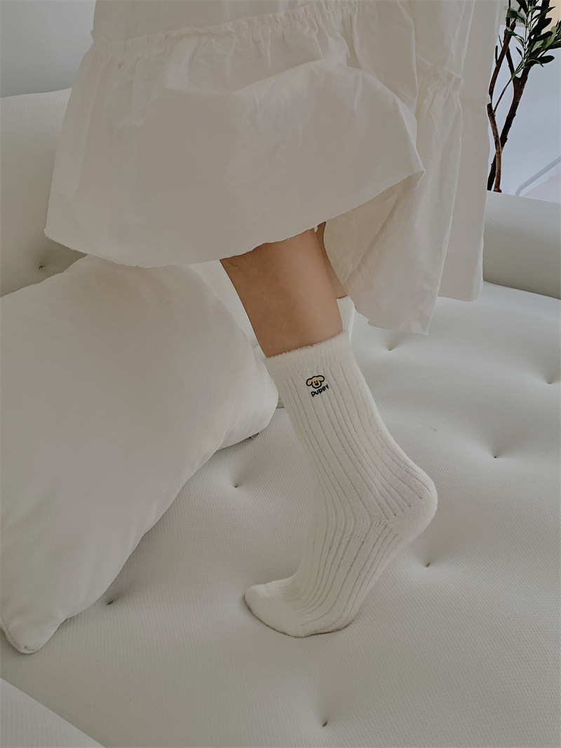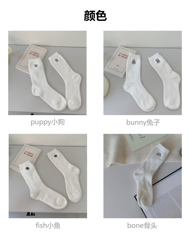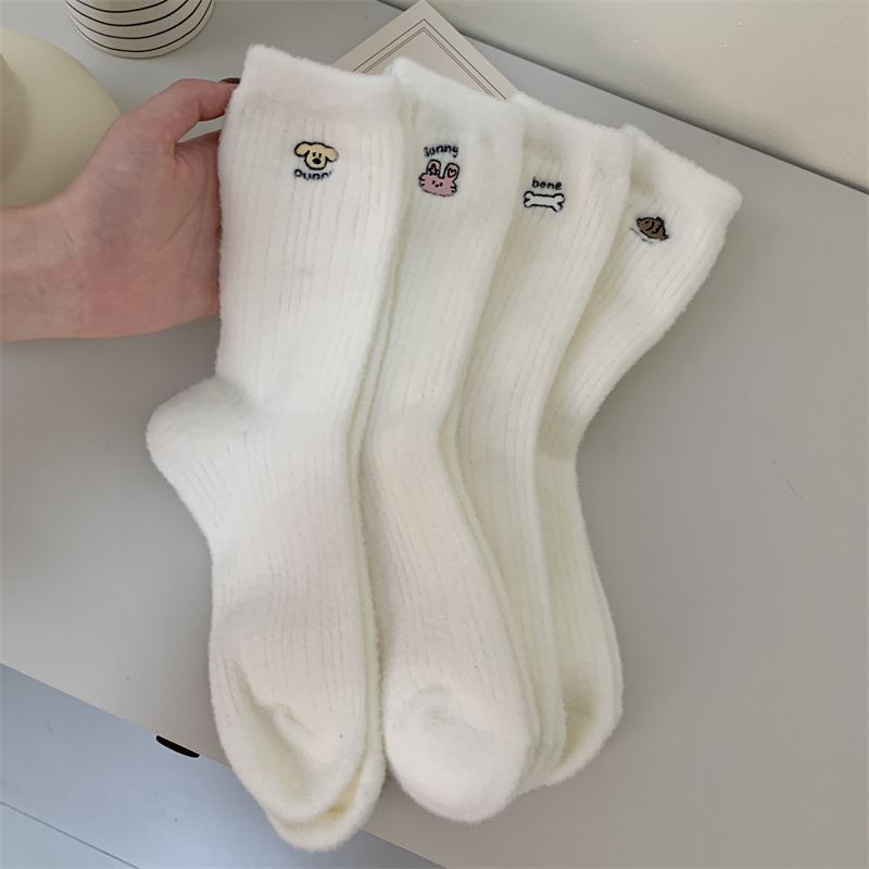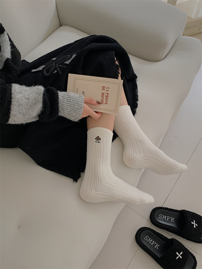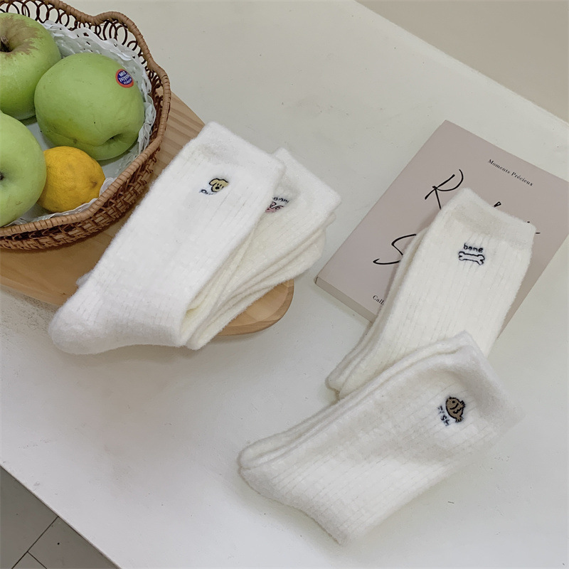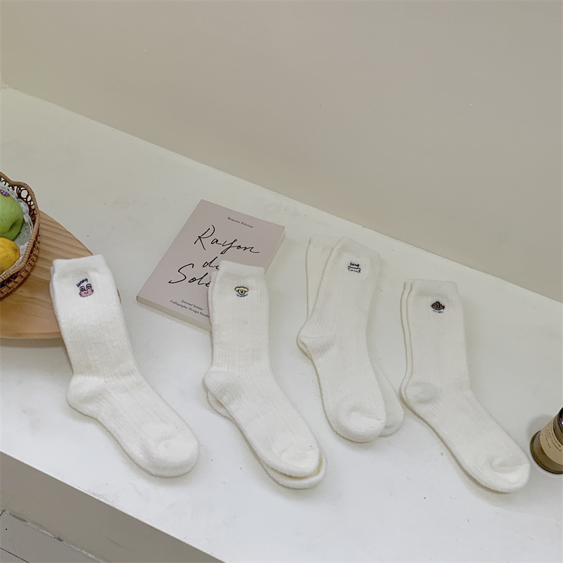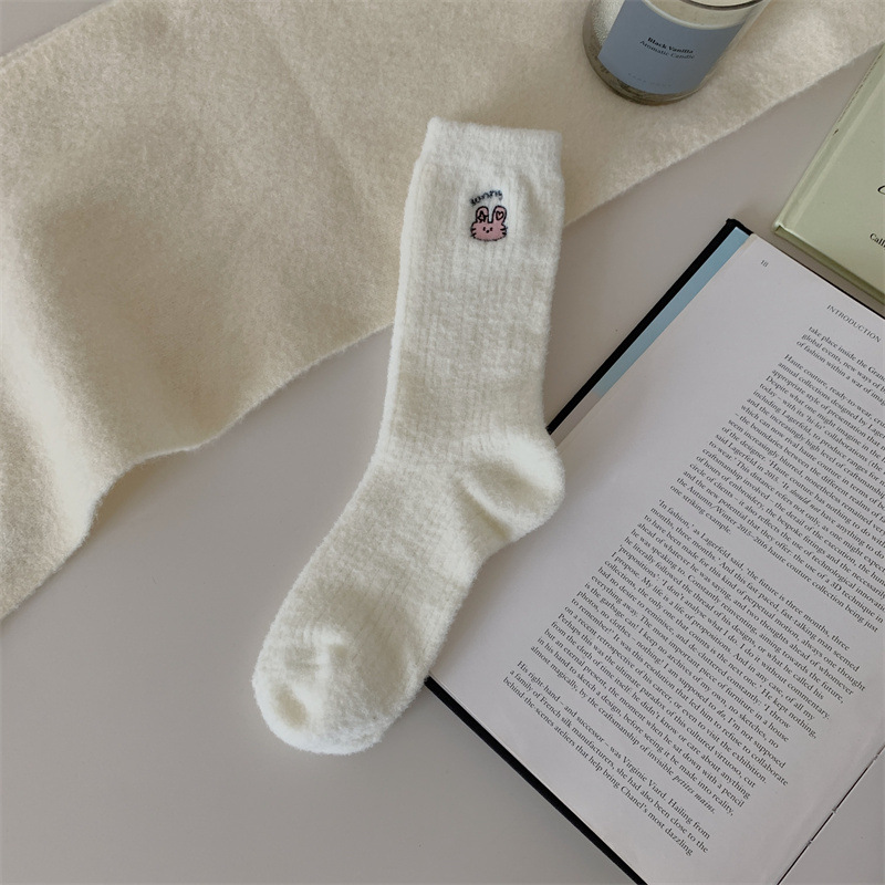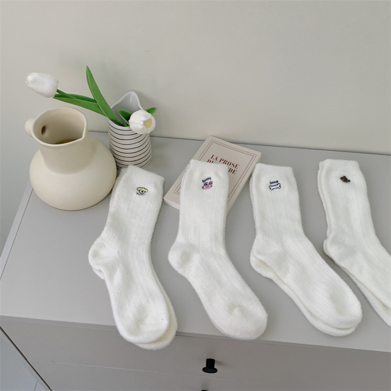 일본 단색 귀여운 두꺼운 흰색 만화 자수 중간 튜브 가을과 겨울 양말 여성용 모조 밍크 벨벳 홈 바닥 양말스토어 가기