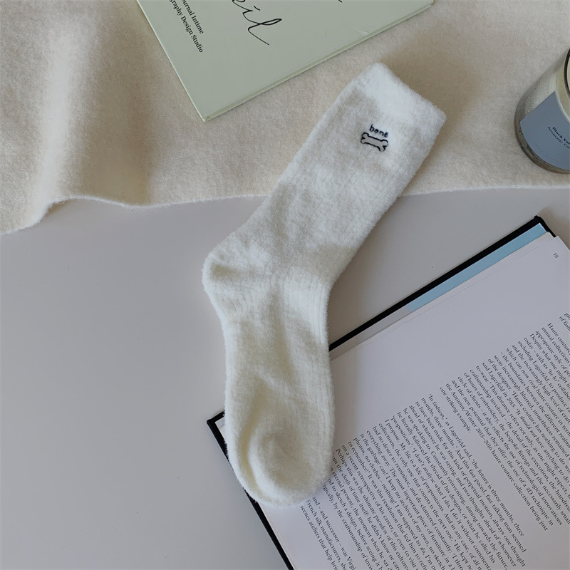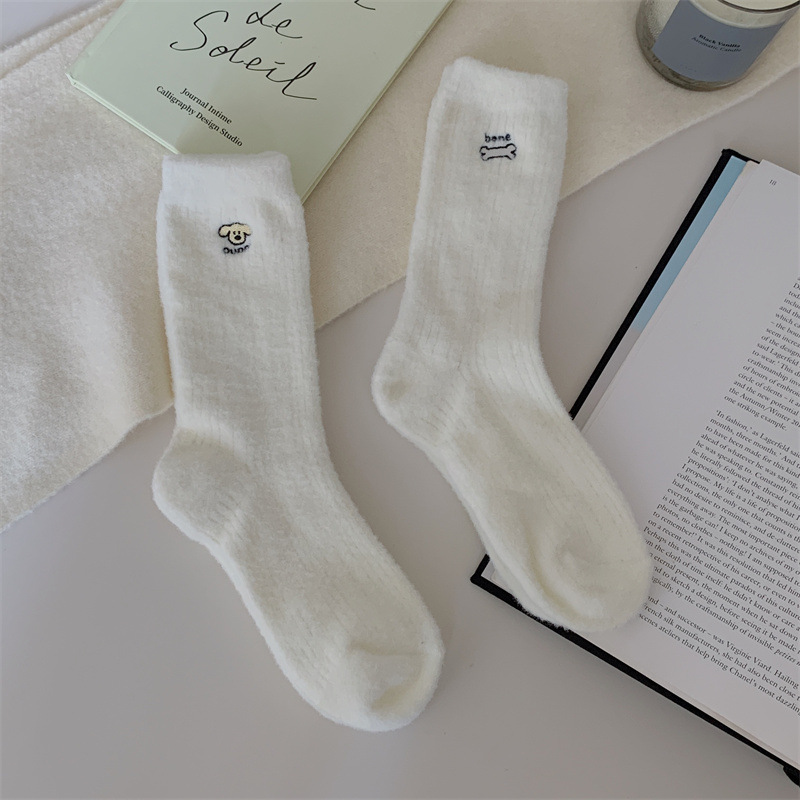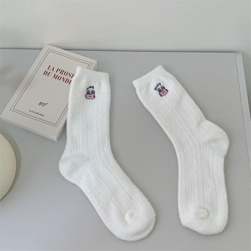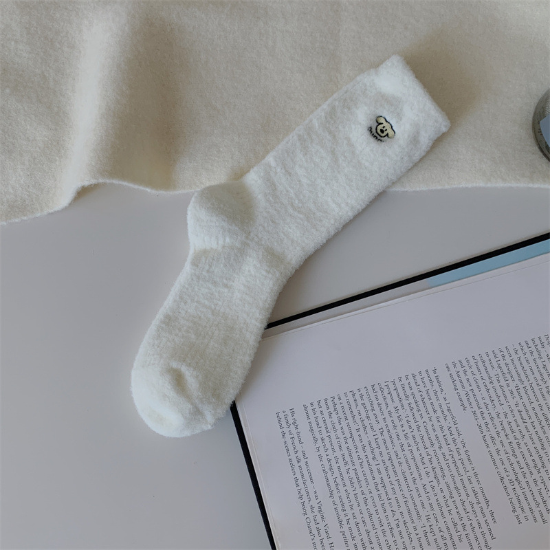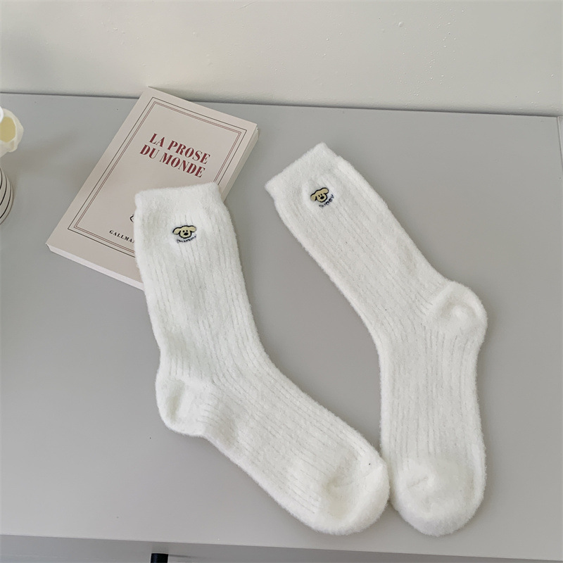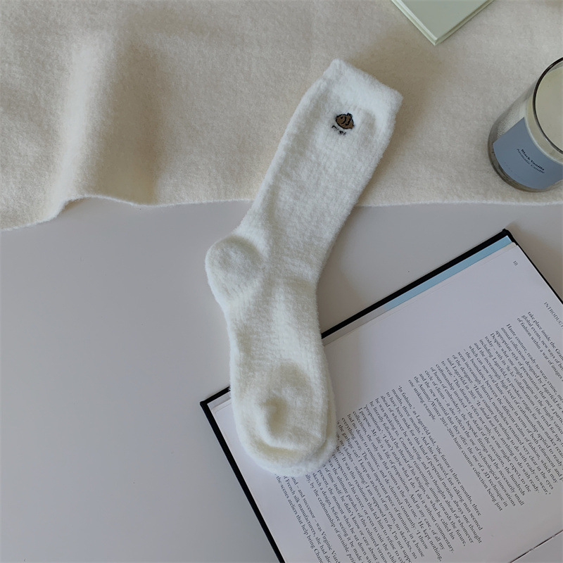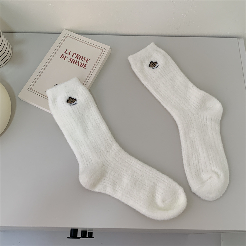 일본 단색 귀여운 두꺼운 흰색 만화 자수 중간 튜브 가을과 겨울 양말 여성용 모조 밍크 벨벳 홈 바닥 양말