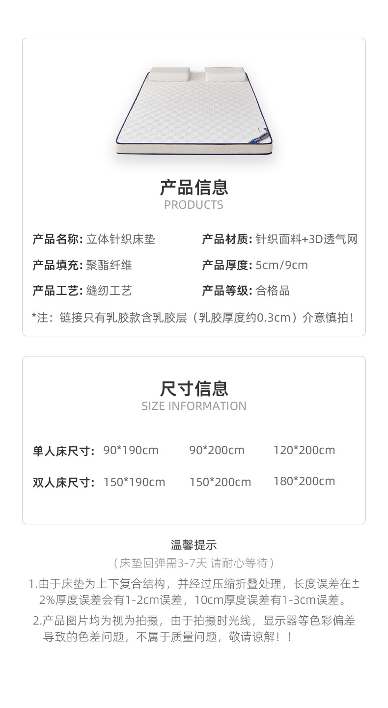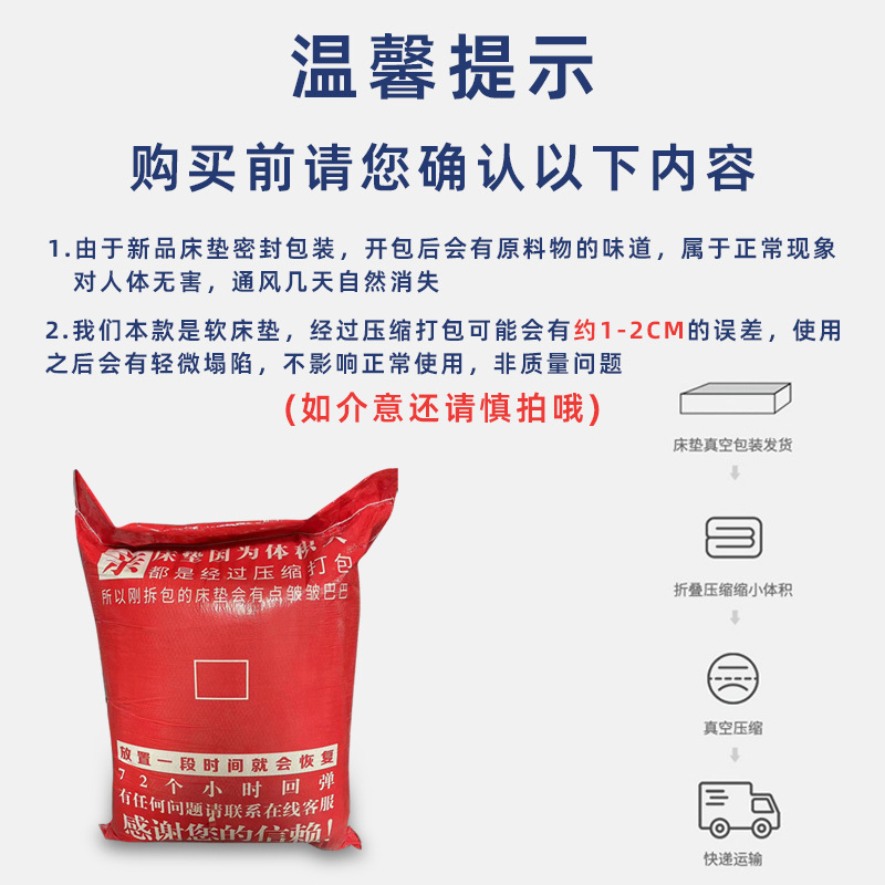 本款床垫是软垫子,折叠压缩发货可能会有1~3cm的误差,轻微折痕,属于正常反应,不属于质量问题。介意勿拍哦~
