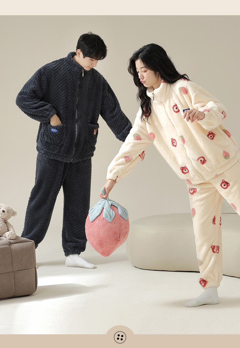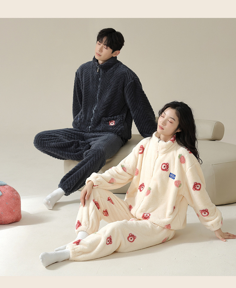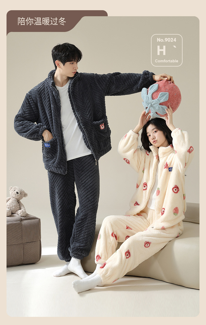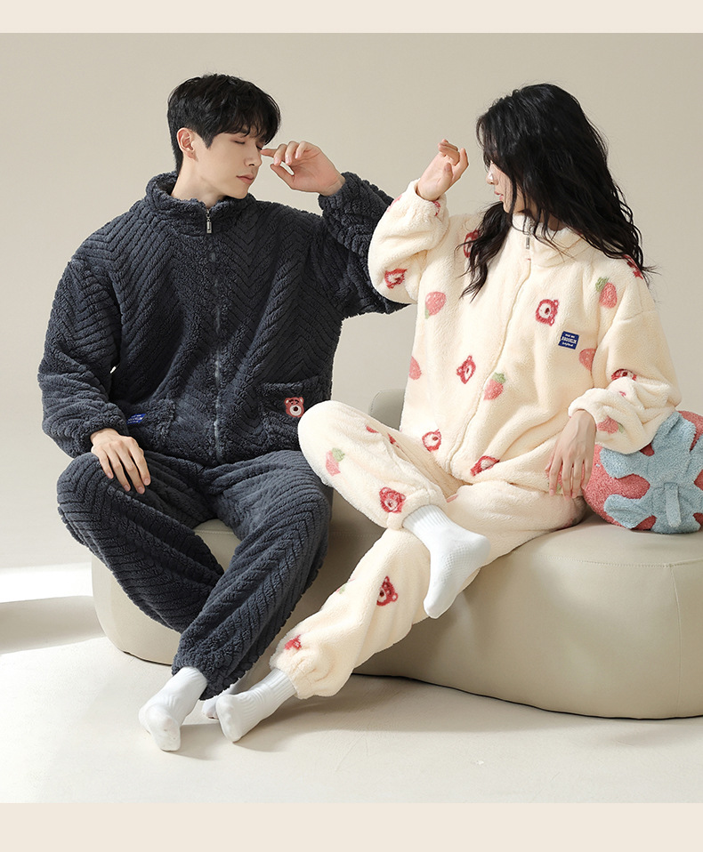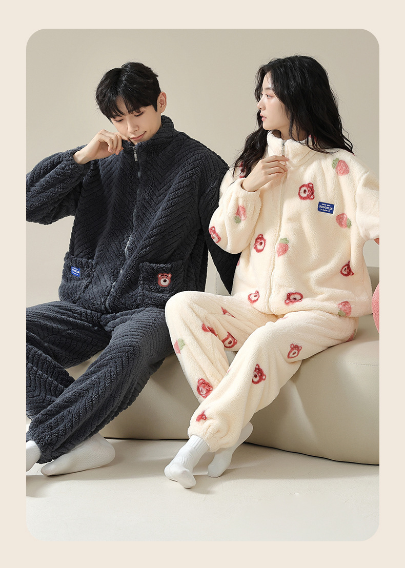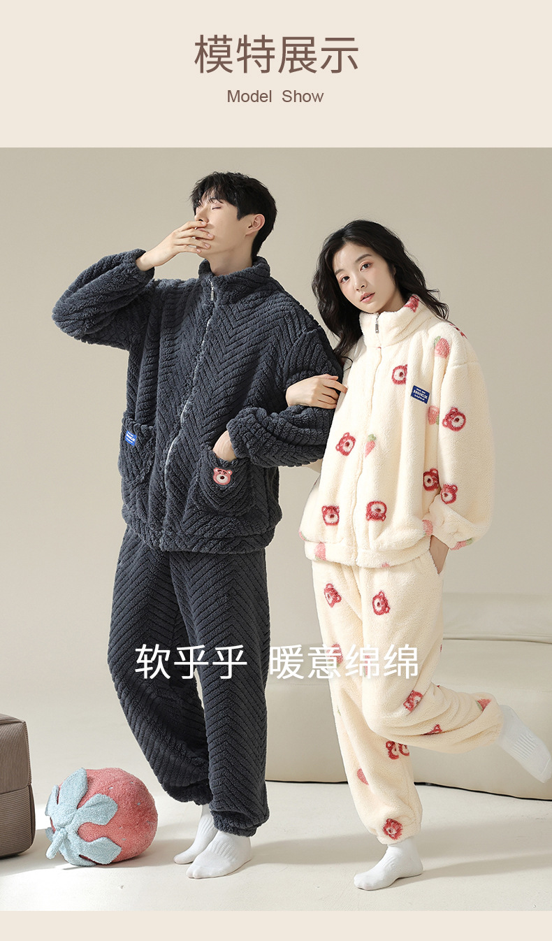 연인을위한 산호 양털 잠옷 가을과 겨울 두꺼운 양털 만화 귀여운 지퍼 가정 옷 남성과 여성 겨울 따뜻한 세트