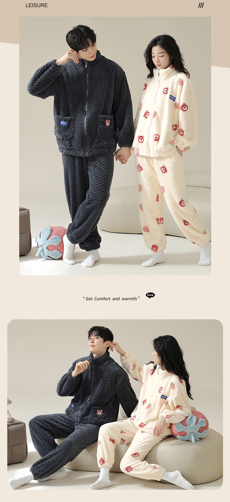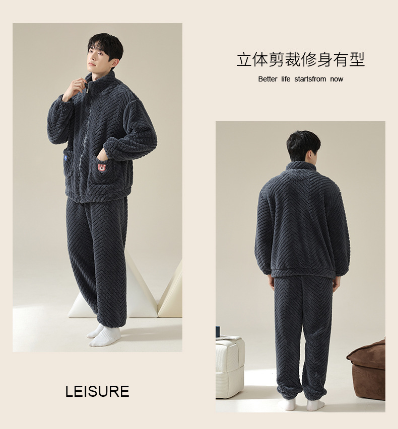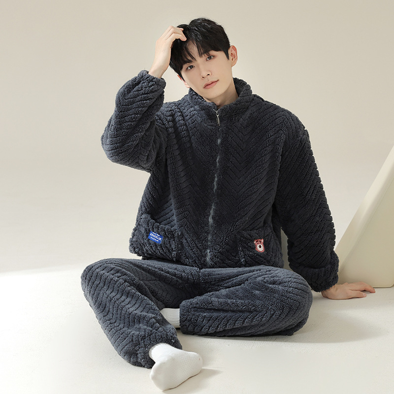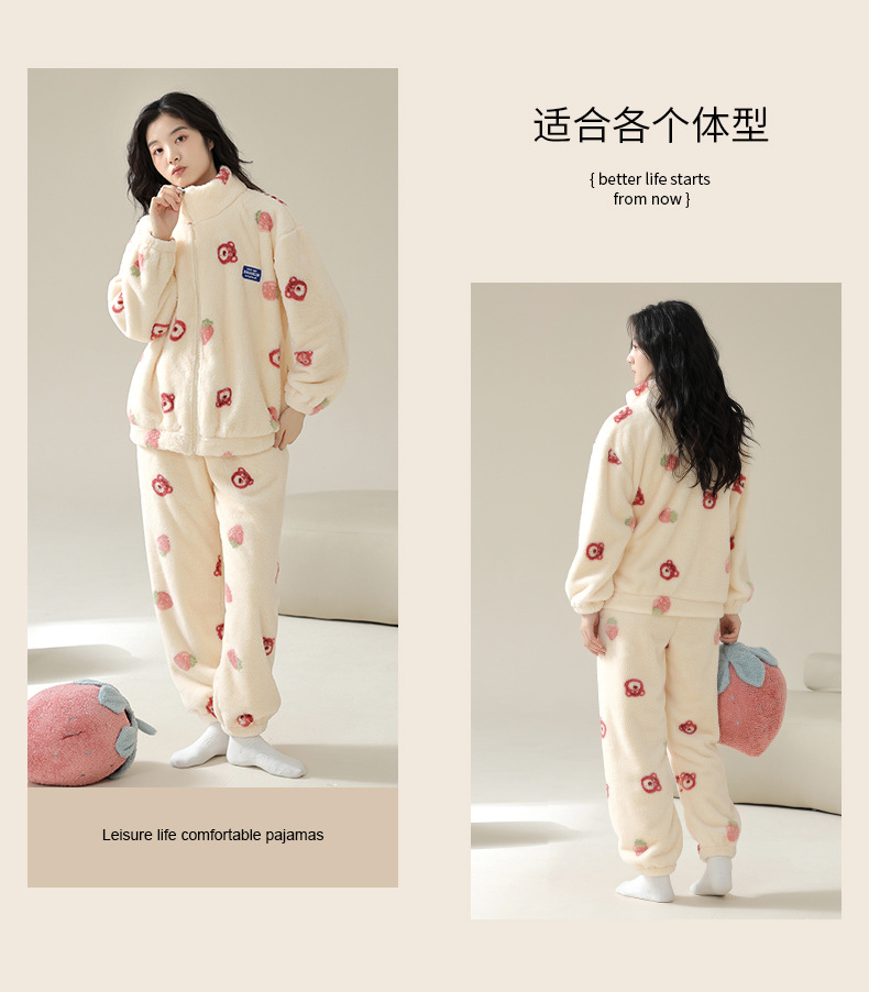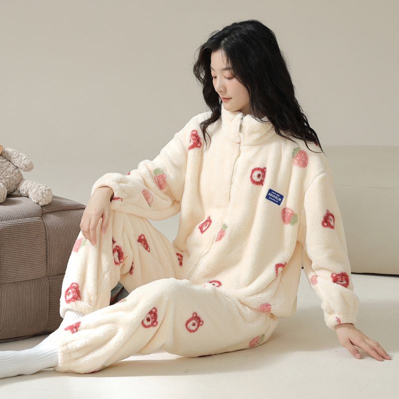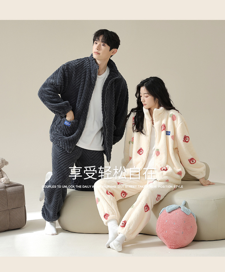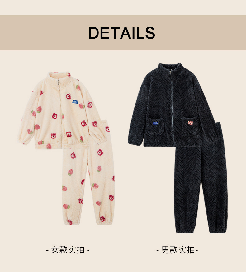 연인을위한 산호 양털 잠옷 가을과 겨울 두꺼운 양털 만화 귀여운 지퍼 가정 옷 남성과 여성 겨울 따뜻한 세트