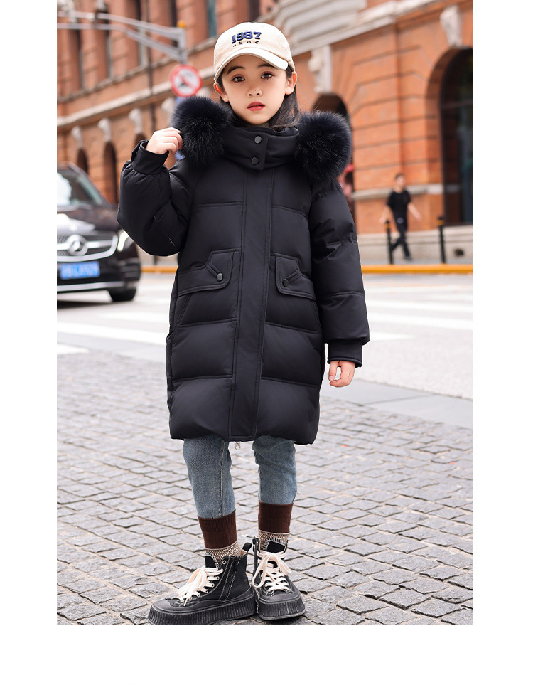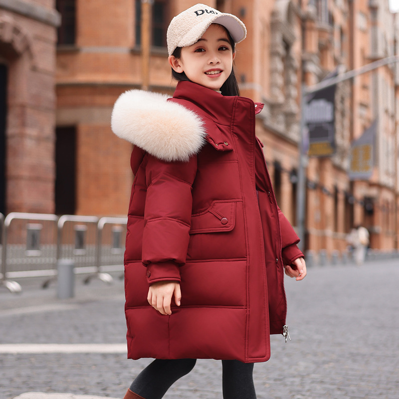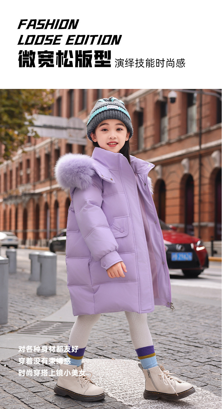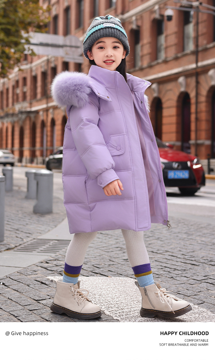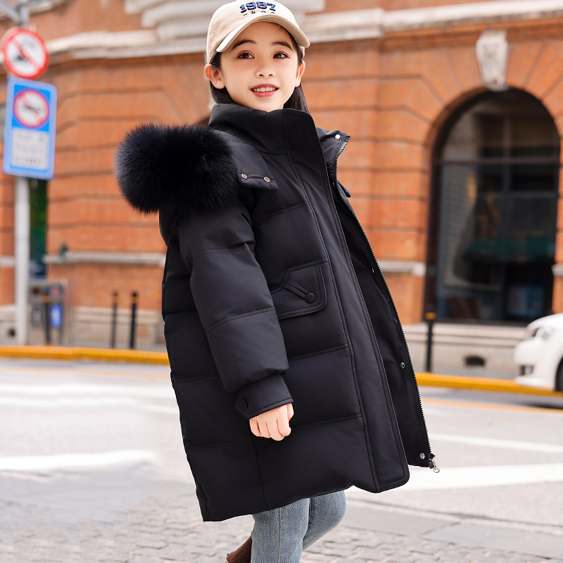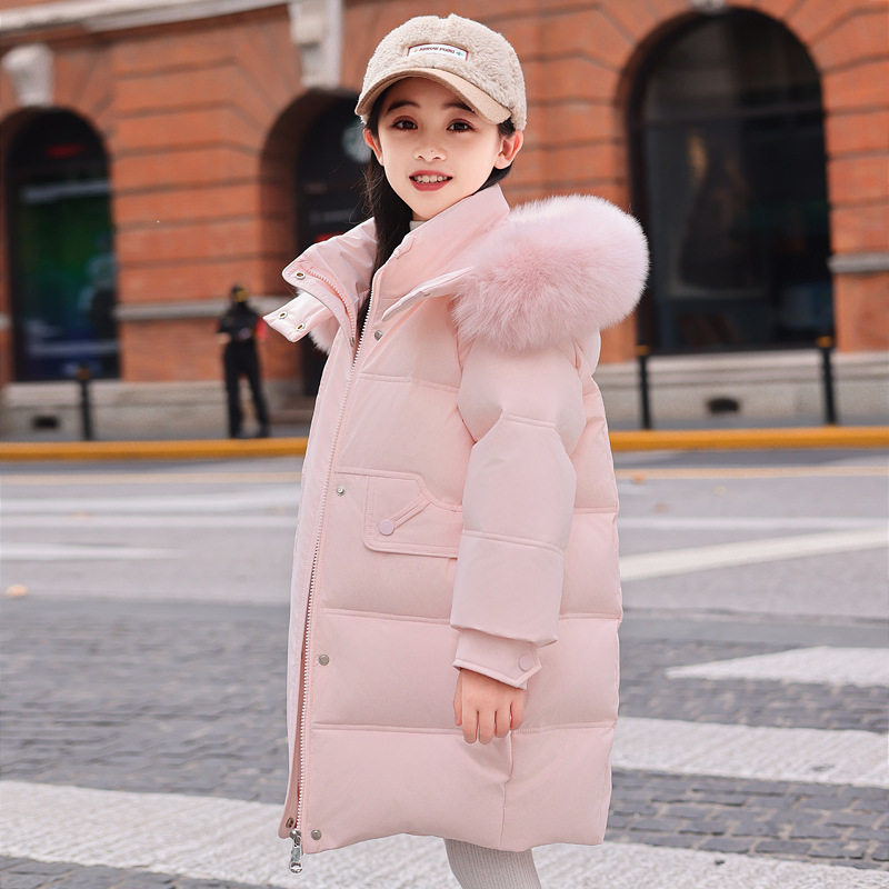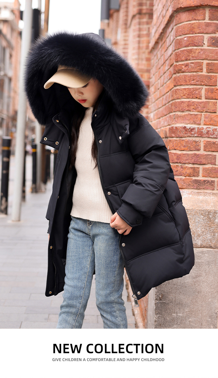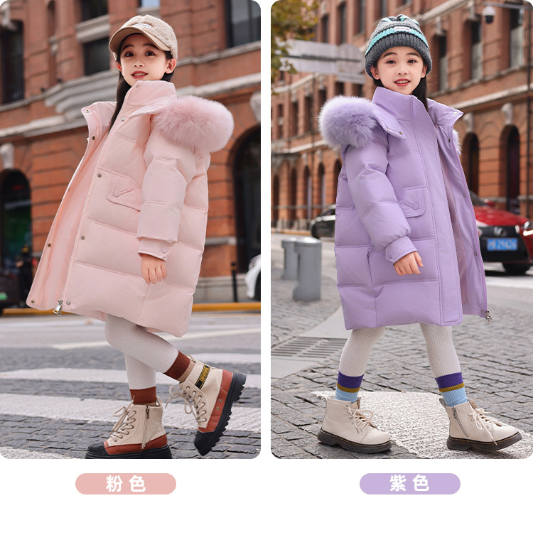 소녀를위한 한국 스타일 어린이 다운 재킷 중간 및 긴 겨울 흰색 오리 다운 후드 소녀 중간 및 큰 어린이의 두꺼운 서양 스타일 코트