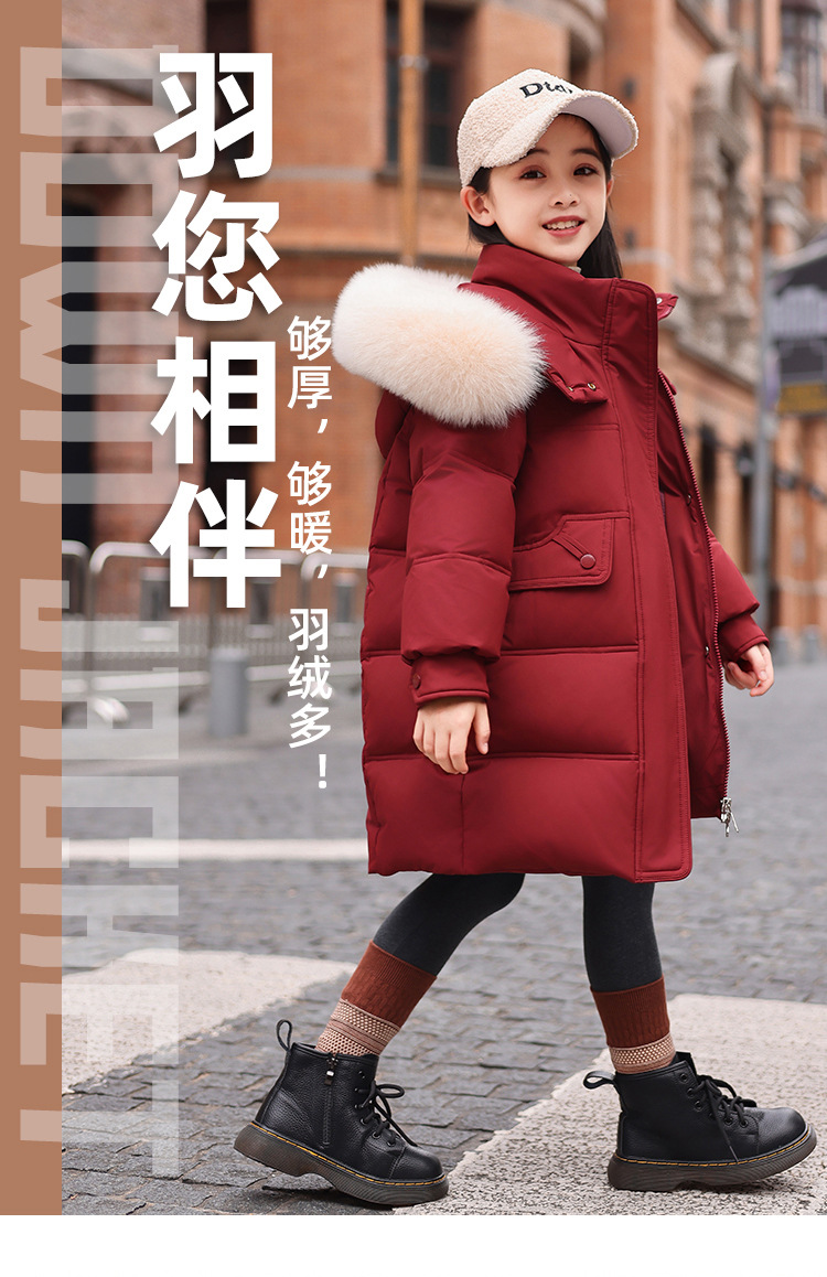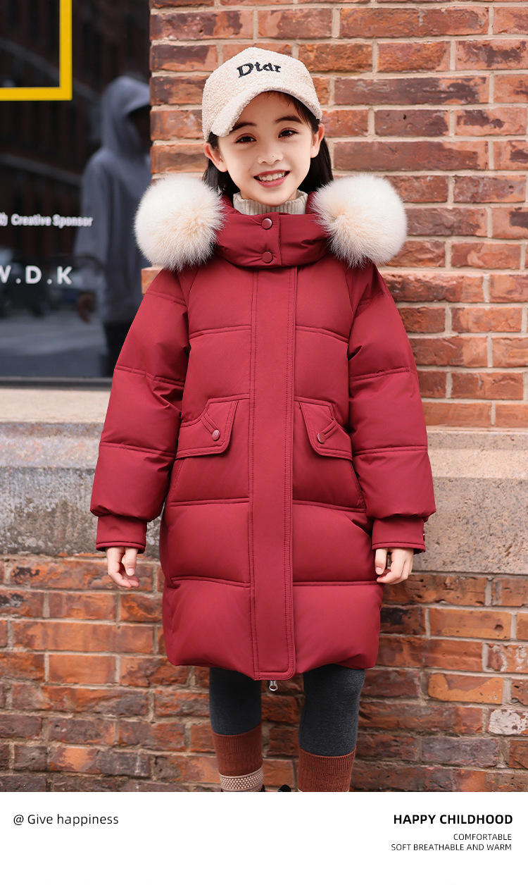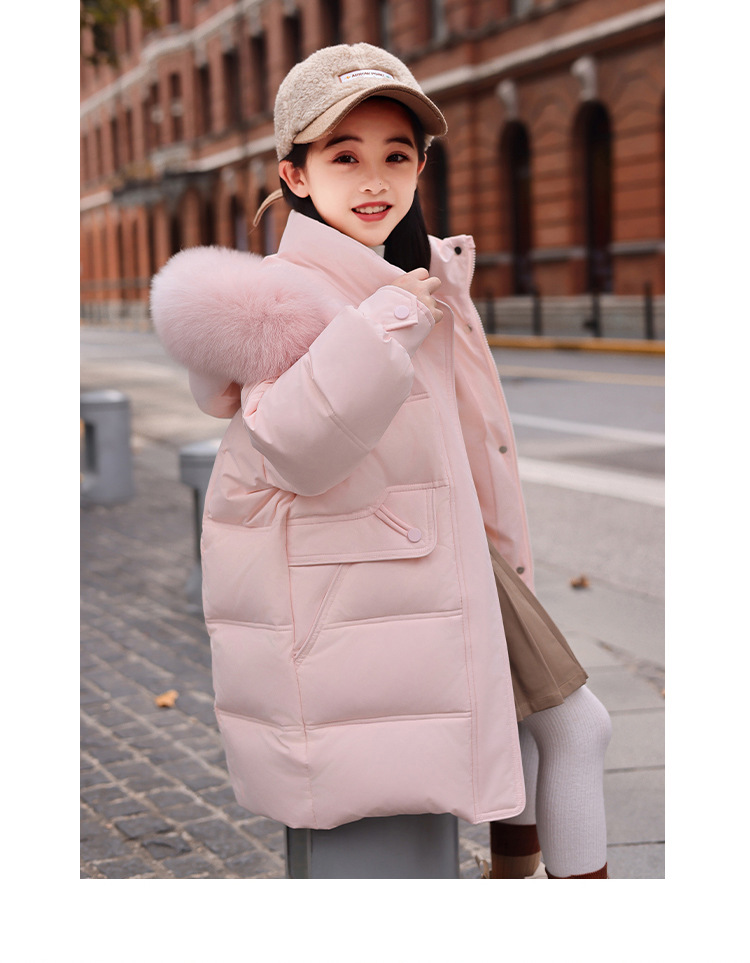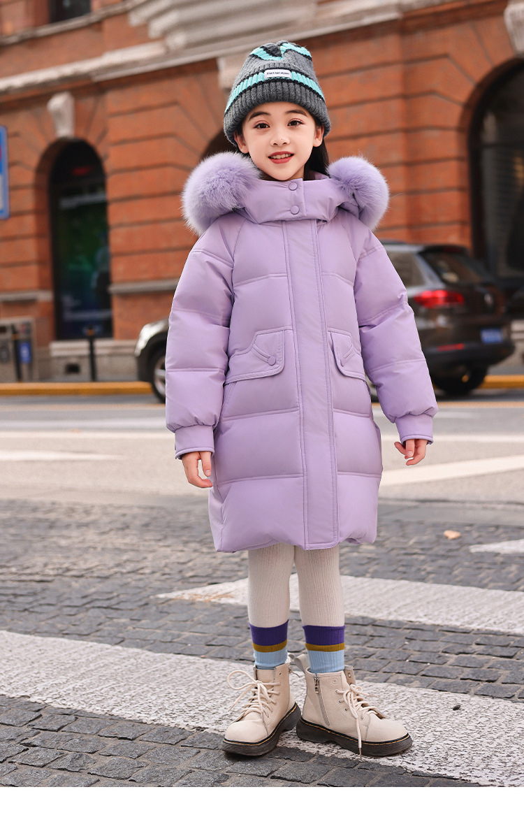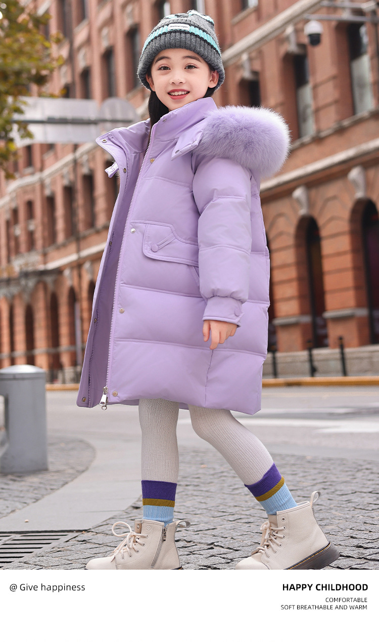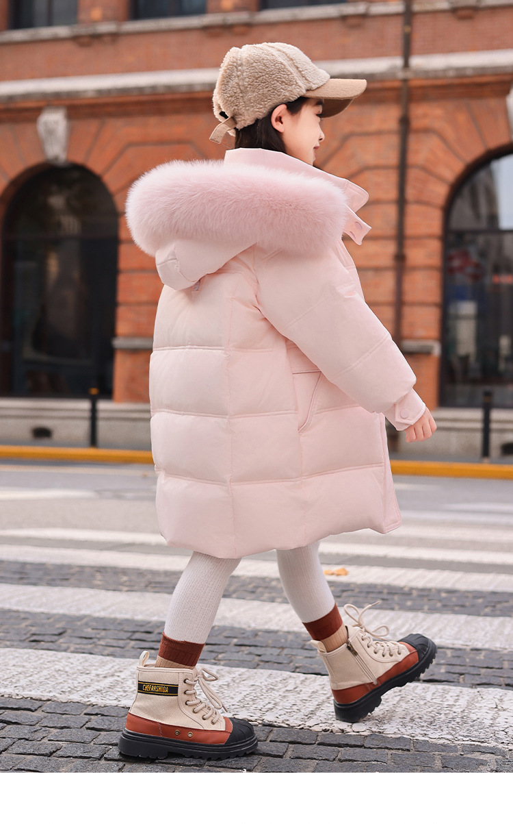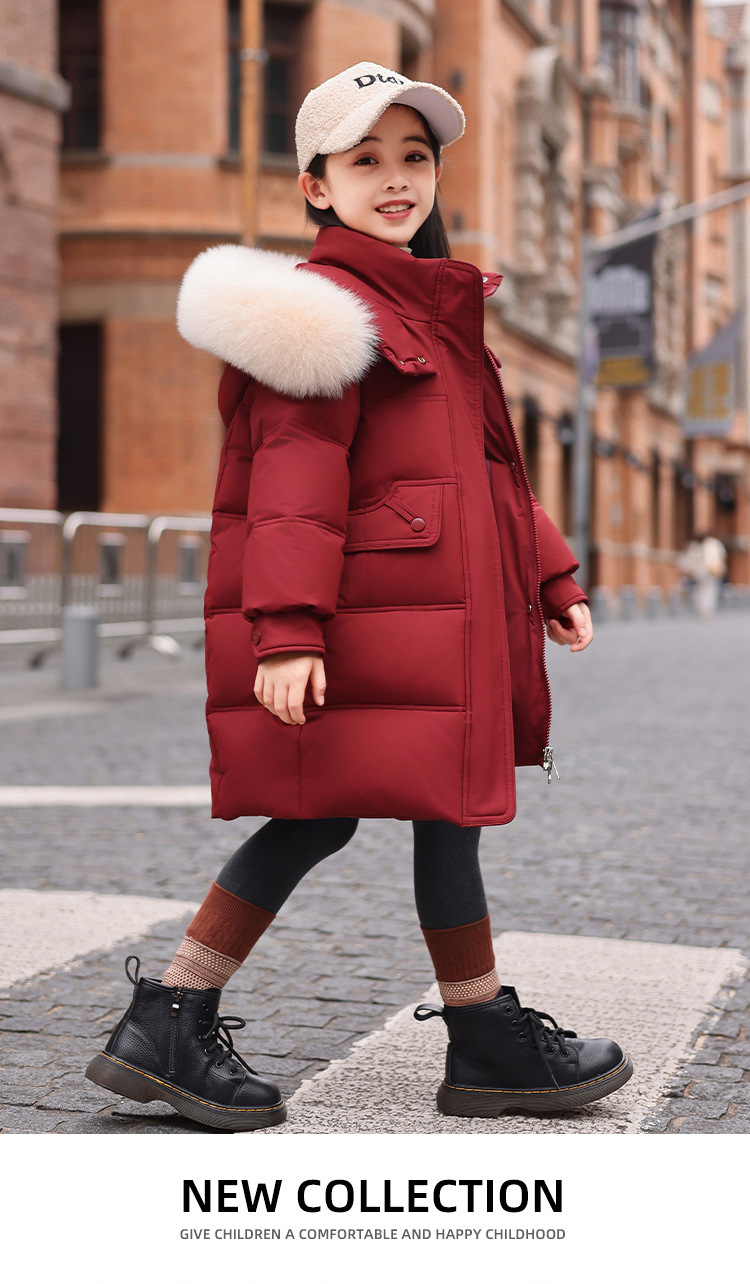 소녀를위한 한국 스타일 어린이 다운 재킷 중간 및 긴 겨울 흰색 오리 다운 후드 소녀 중간 및 큰 어린이의 두꺼운 서양 스타일 코트