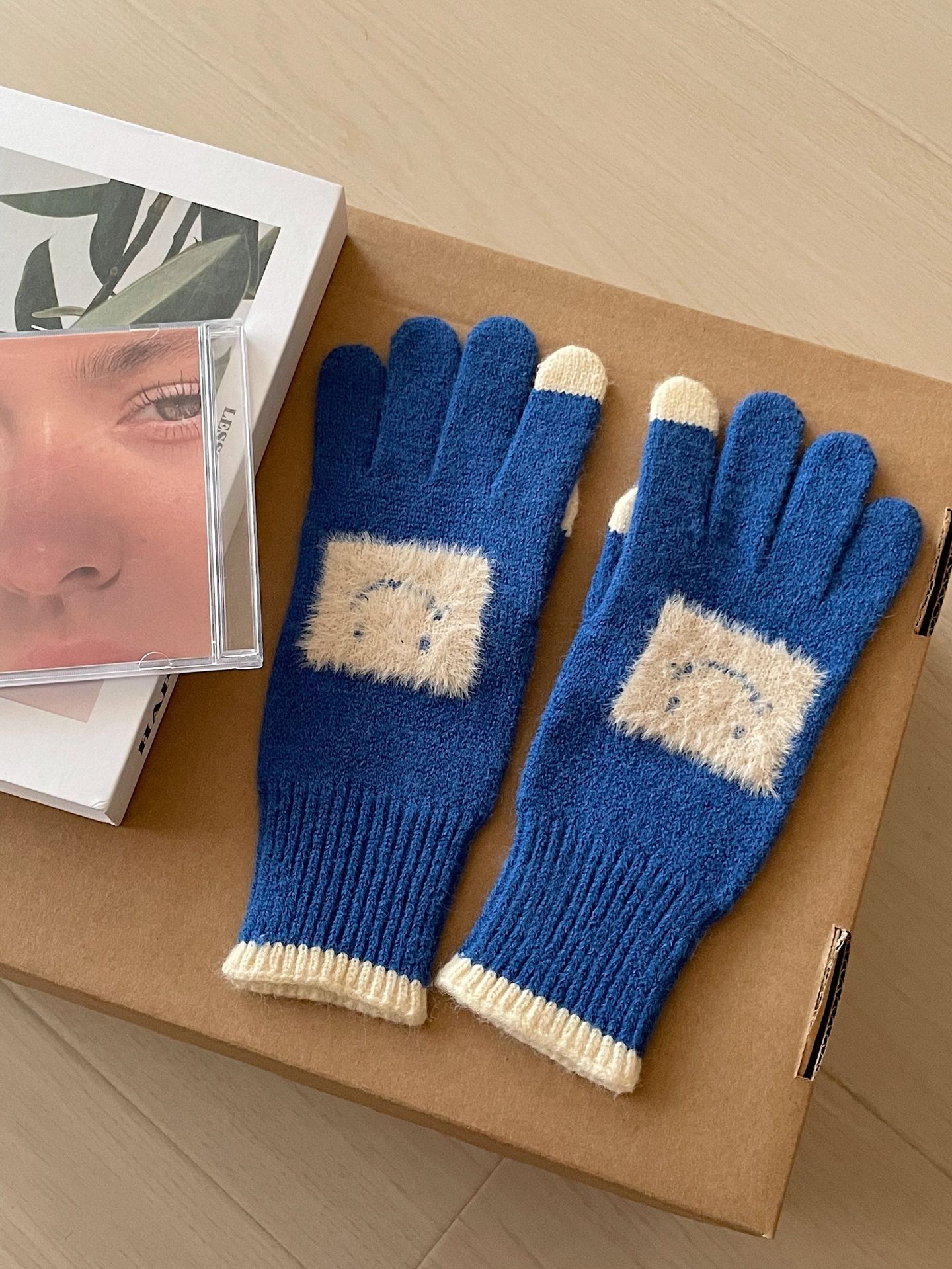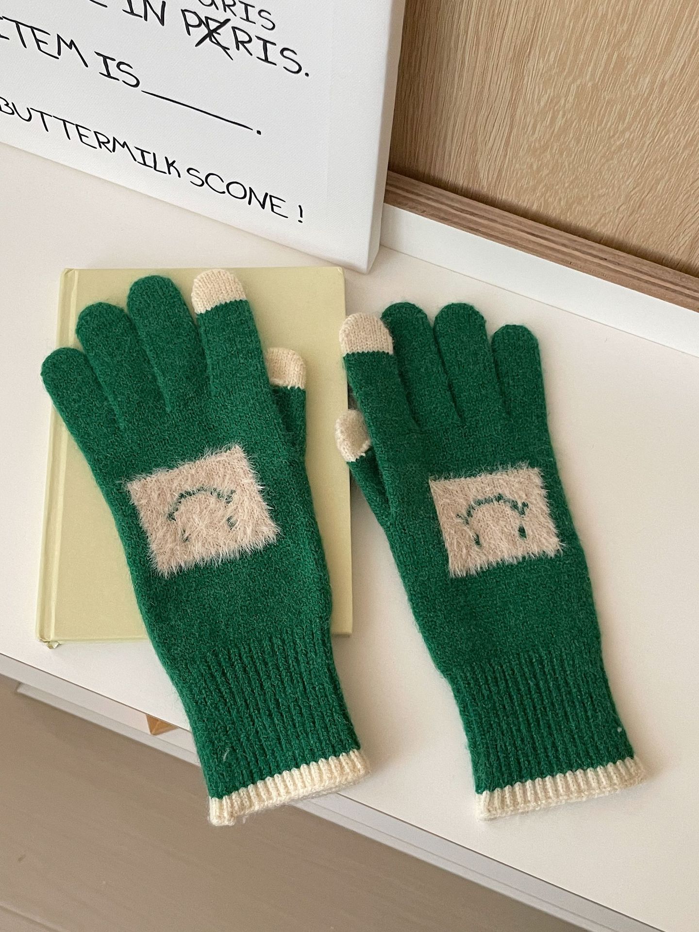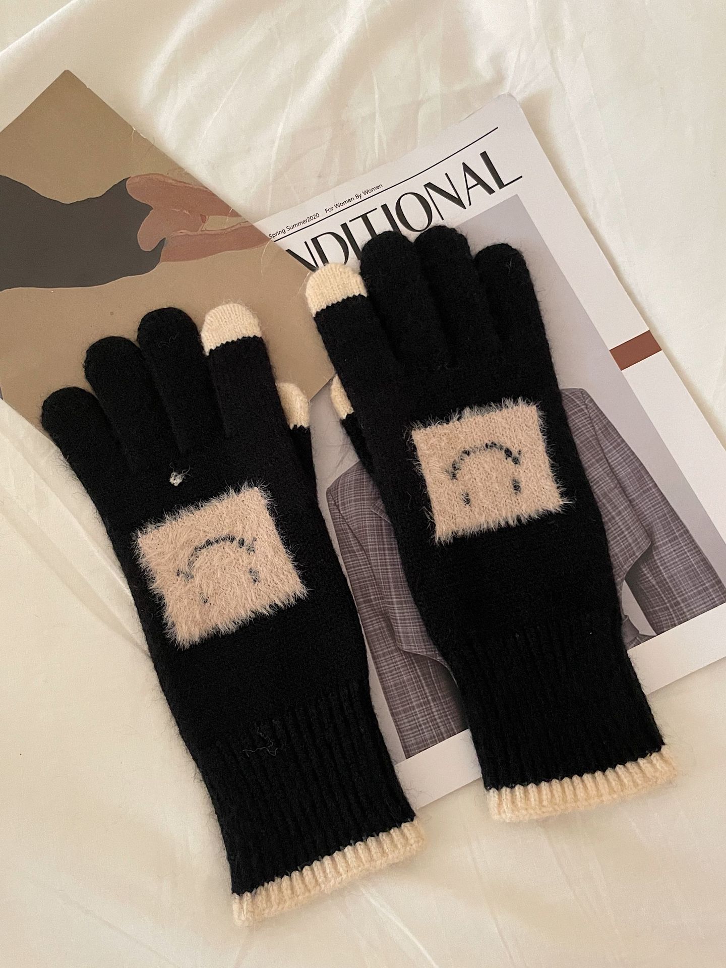 손가락 장갑 봄과 가을 따뜻한 한국의 새로운 양모 장갑 2 색 스티치 귀여운 웃는 얼굴 노출 손가락 터치 스크린 장갑