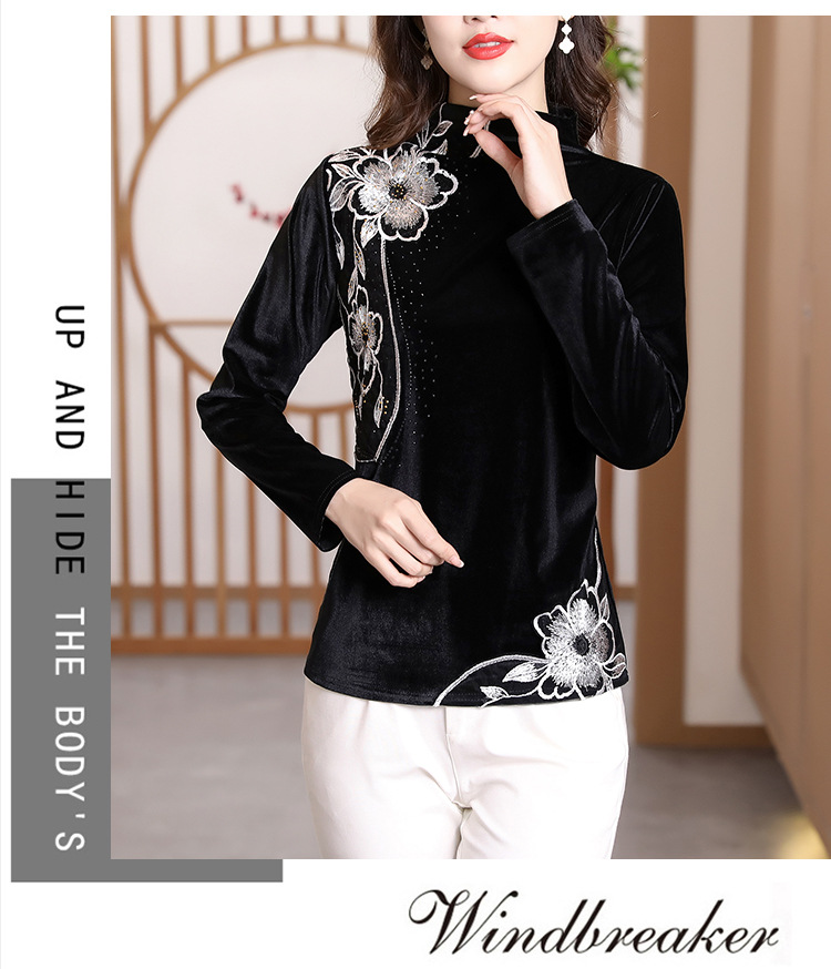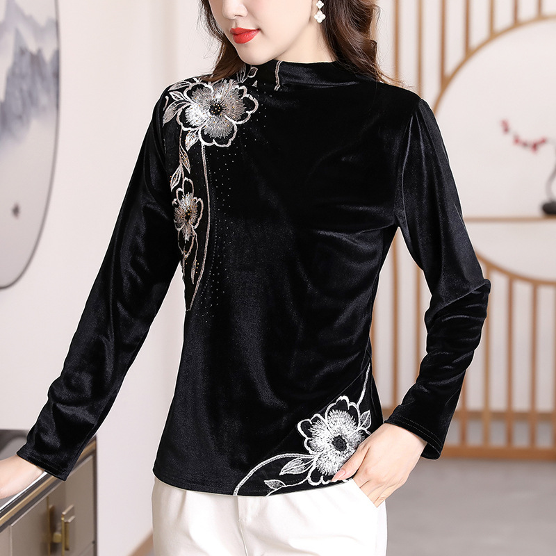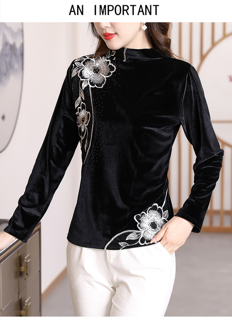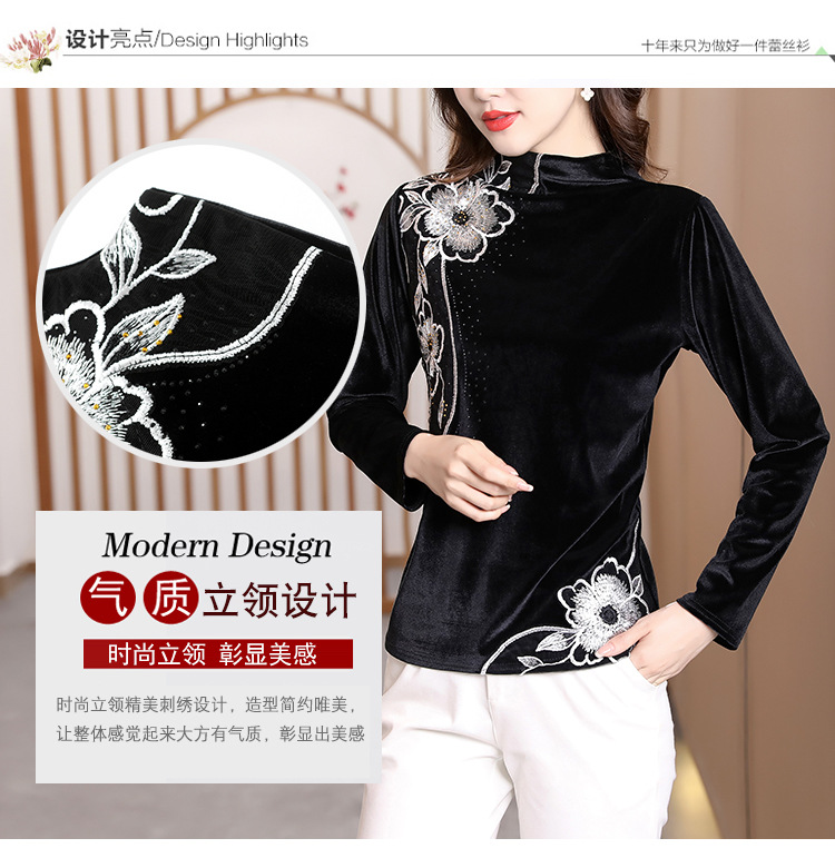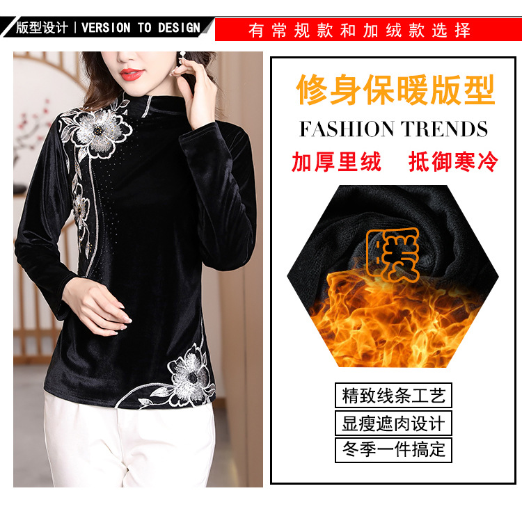 2023 가을과 겨울 새로운 하이넥 자수 베이스 셔츠 한국 슬림핏 따뜻한 내부 벨벳 웨스턴 스타일 티셔츠 탑스토어 가기
