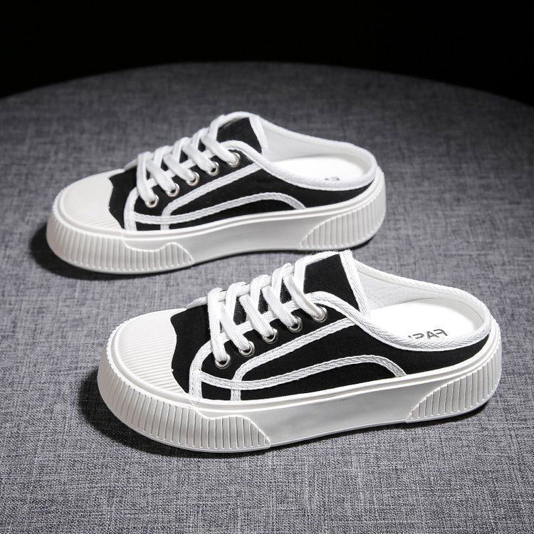 봄과 여름 2023 여성을위한 닫힌 발가락 하프 슬리퍼 새로운 레이스 업 여성 신발 비스킷 단독 색상과 부드러운 바닥 여성용 캔버스 신발