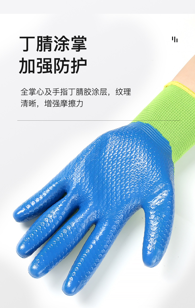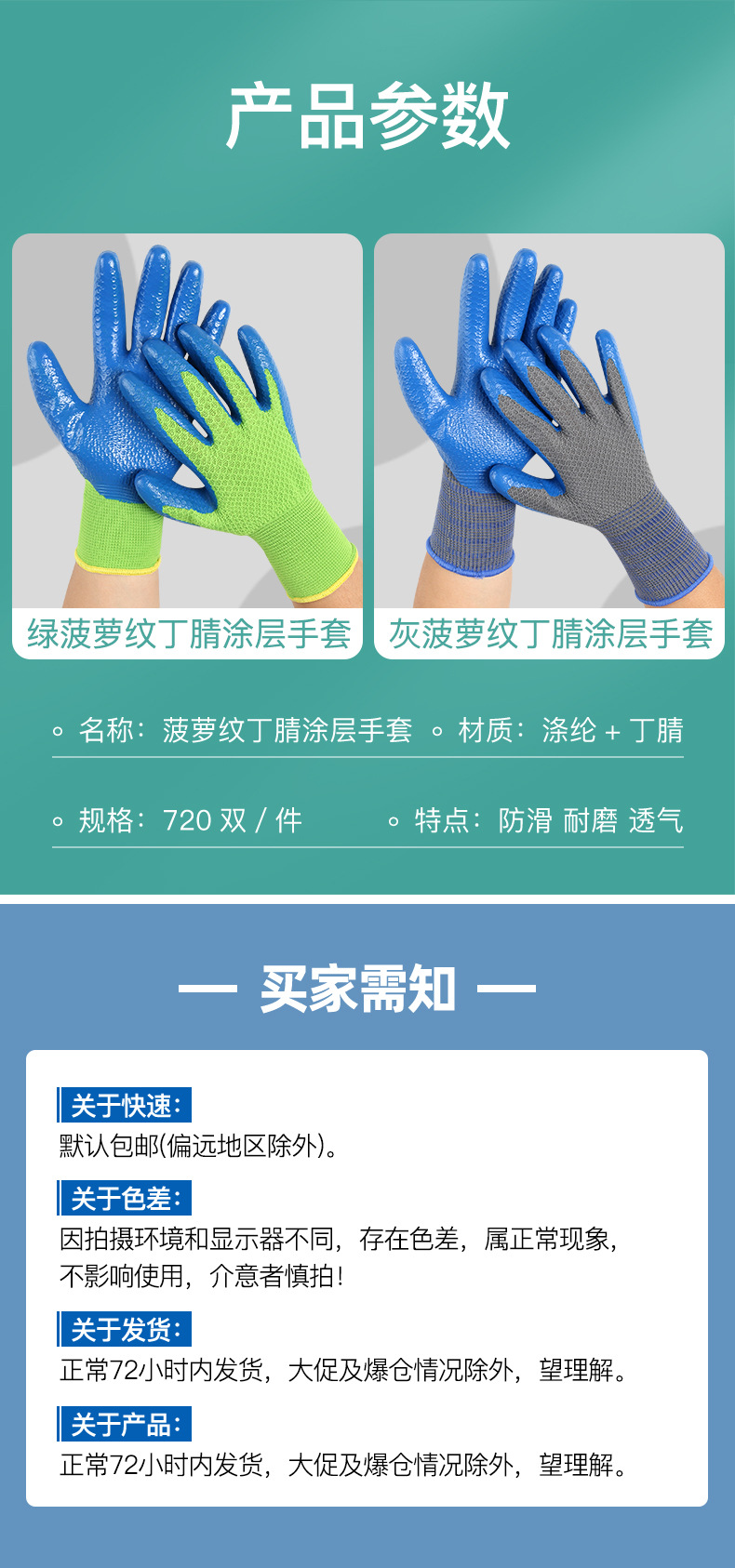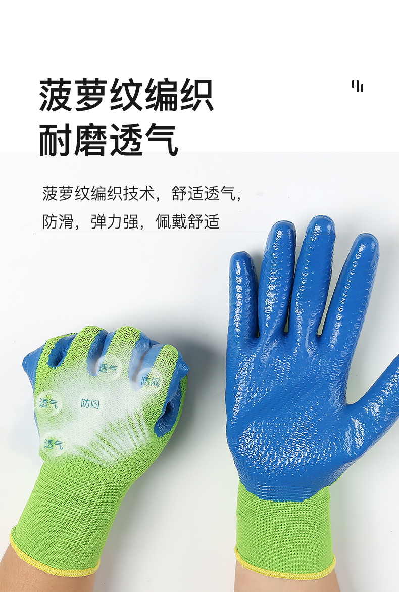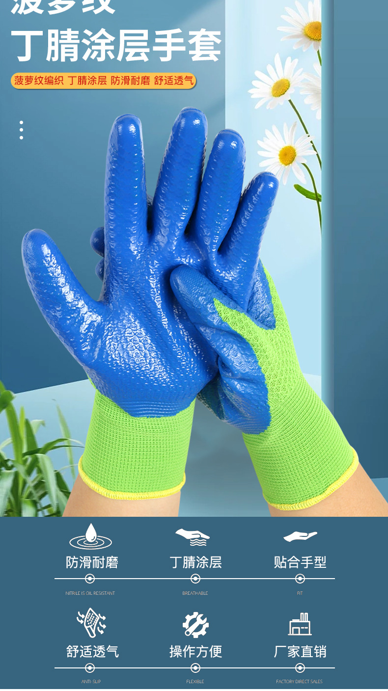 노동 장갑 통기성 내마모성 미끄럼 방지 파인애플 패턴 니트릴 코팅 교수형 접착제 디핑 사이트 취급 작업 장갑스토어 가기