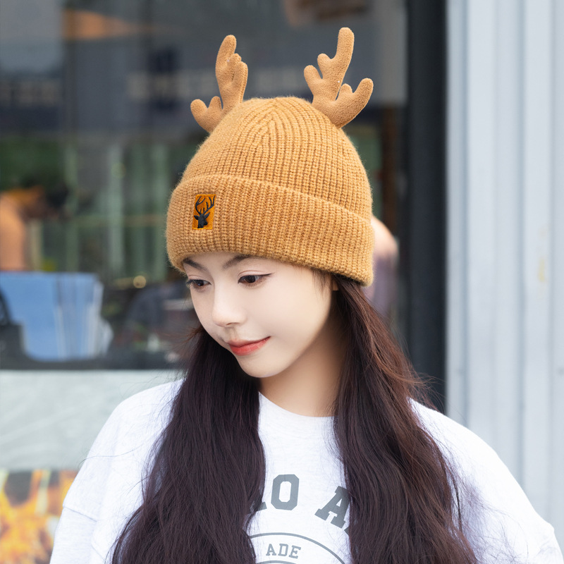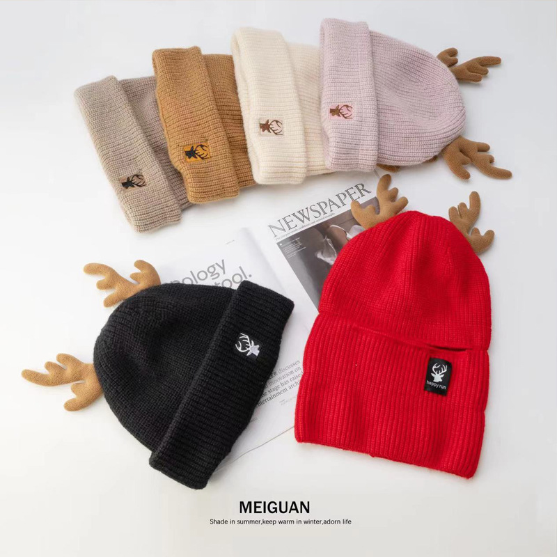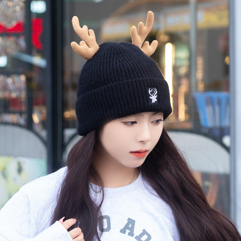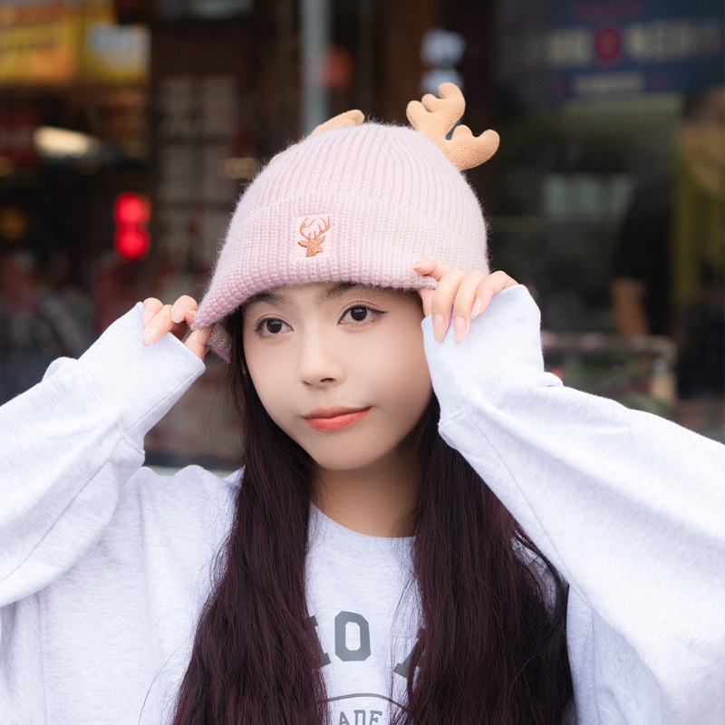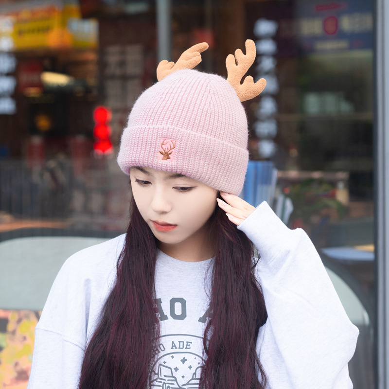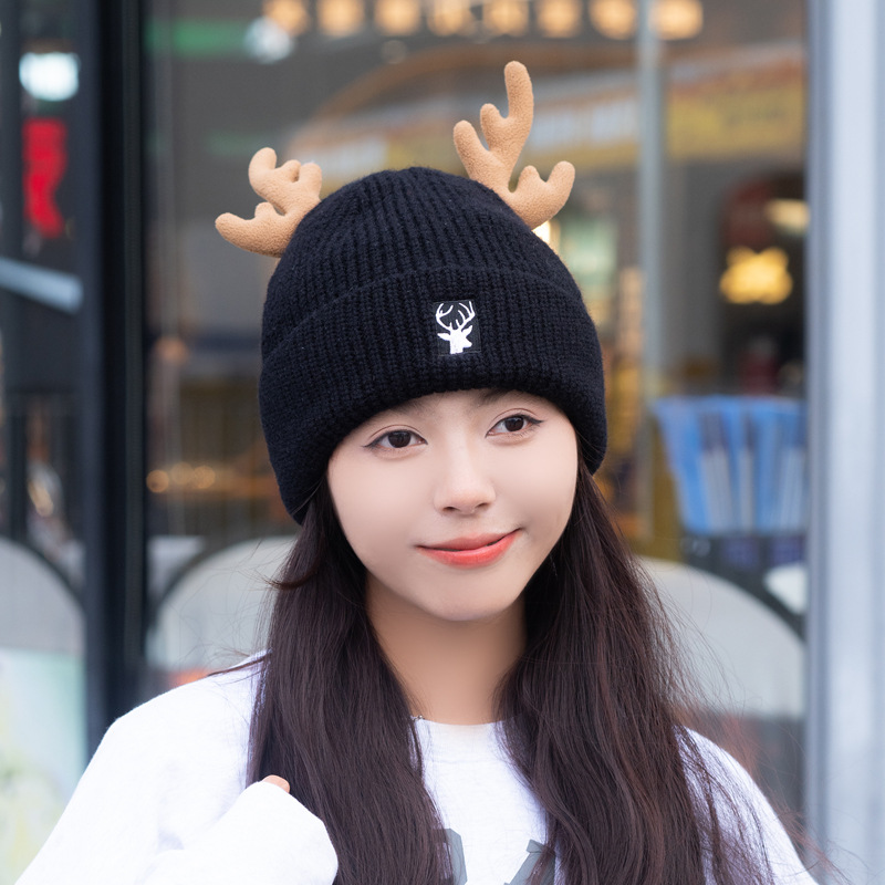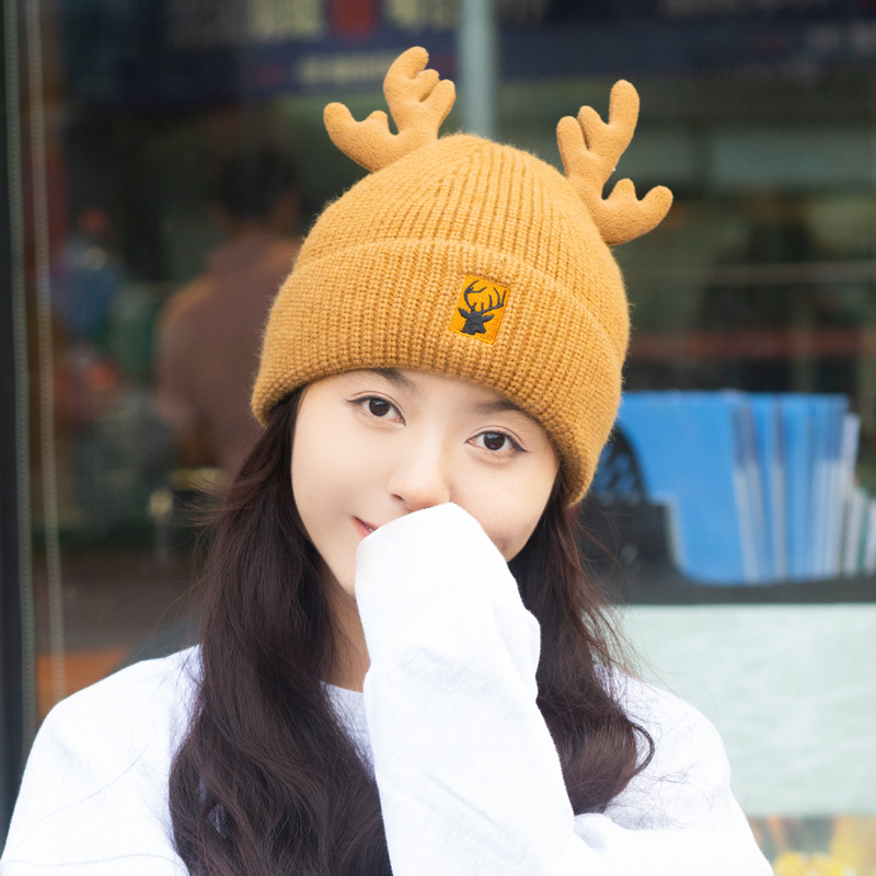 새로운 크리스마스 뿔 모직 모자 스카프 이중 목적 풀오버 캡 여성 가을과 겨울 따뜻한 니트 모자 귀여운 귀 보호스토어 가기