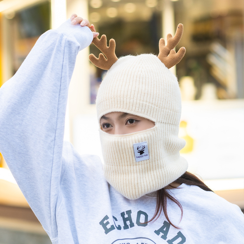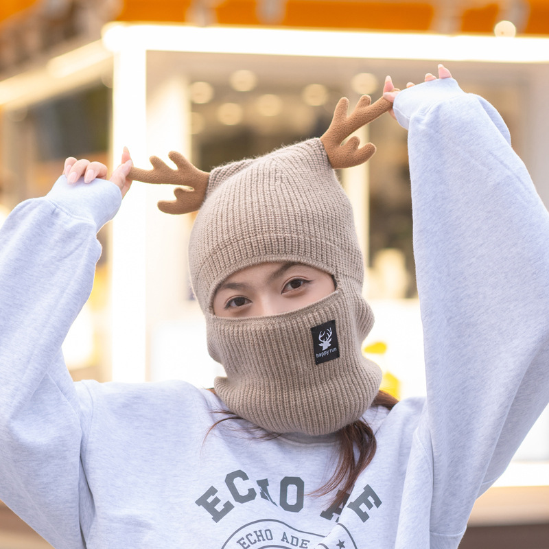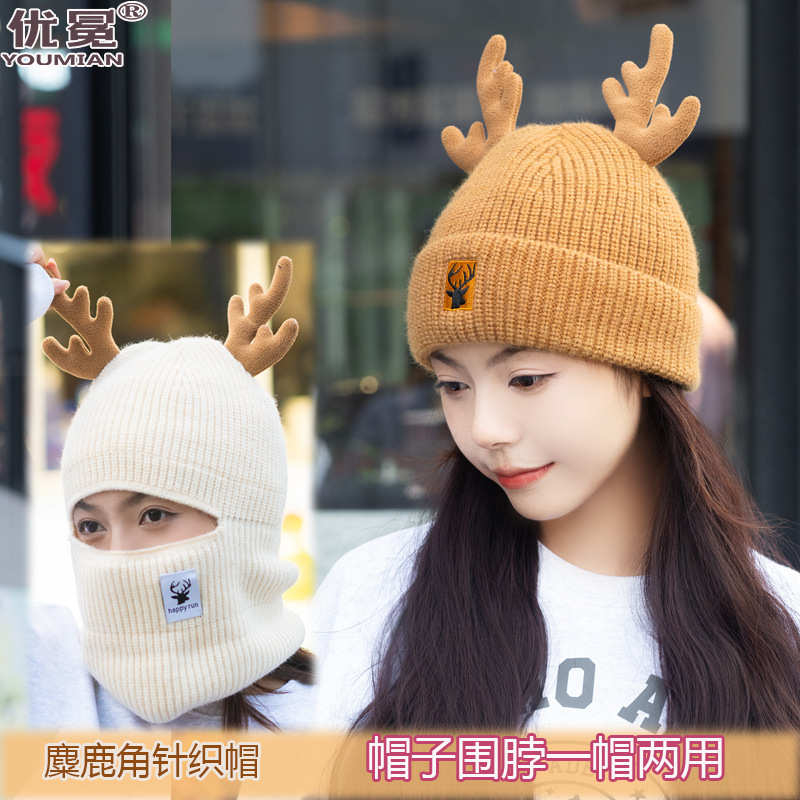 새로운 크리스마스 뿔 모직 모자 스카프 이중 목적 풀오버 캡 여성 가을과 겨울 따뜻한 니트 모자 귀여운 귀 보호