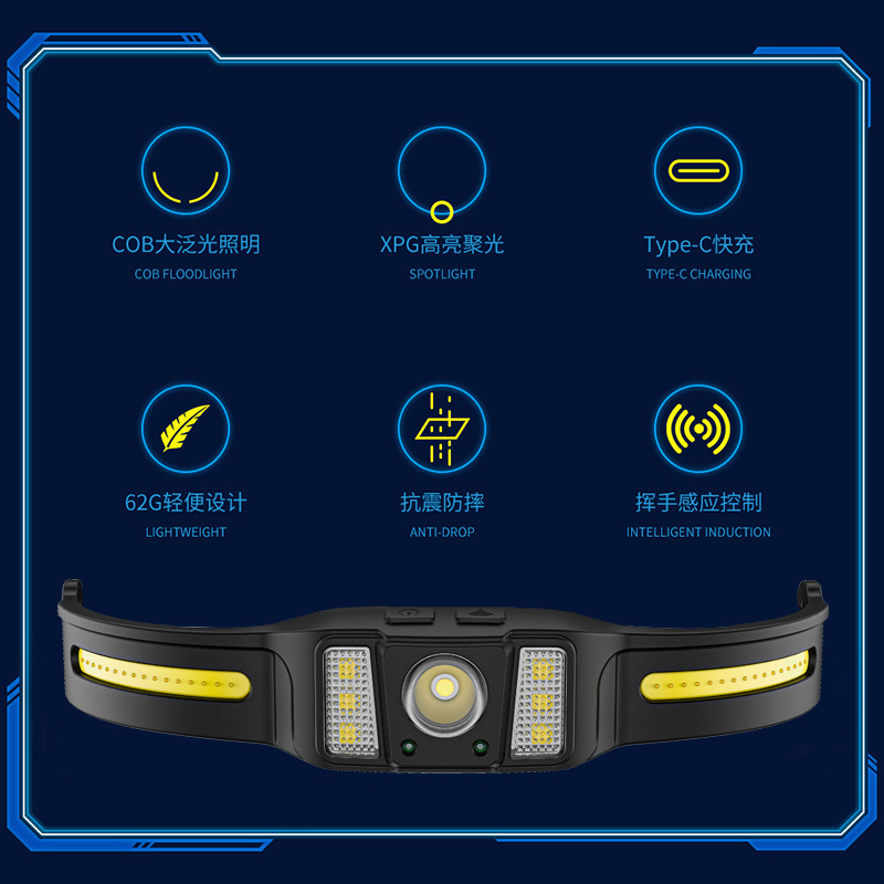 야외용 스마트 센서 헤드램프, 긴 배터리 수명의 실리콘 헤드램프, 가볍고 강한 빛의 초고휘도 헤드램프, 머리 장착형 광부용 램프스토어 가기