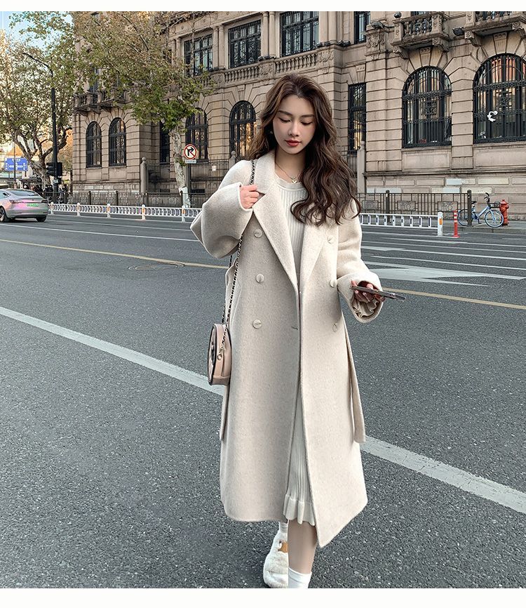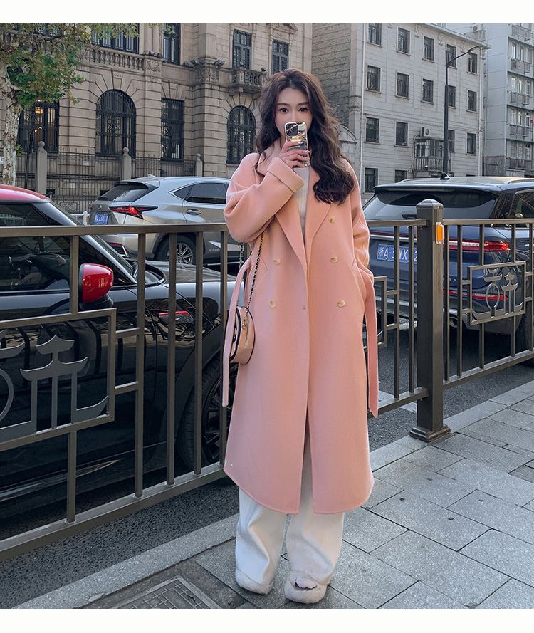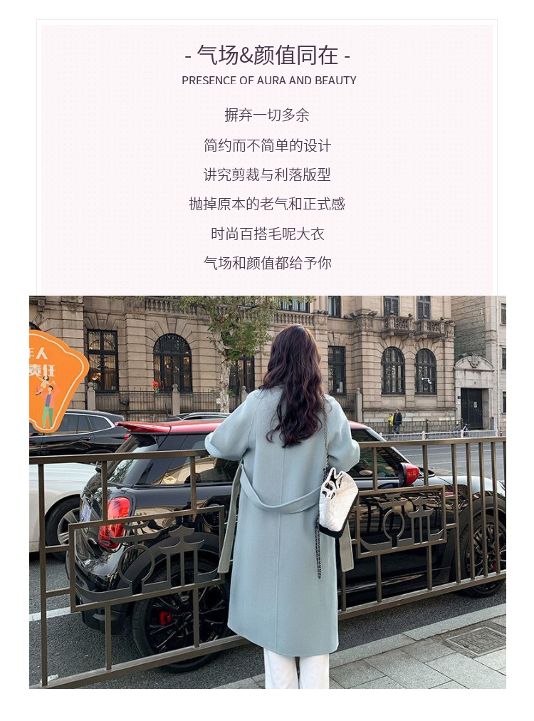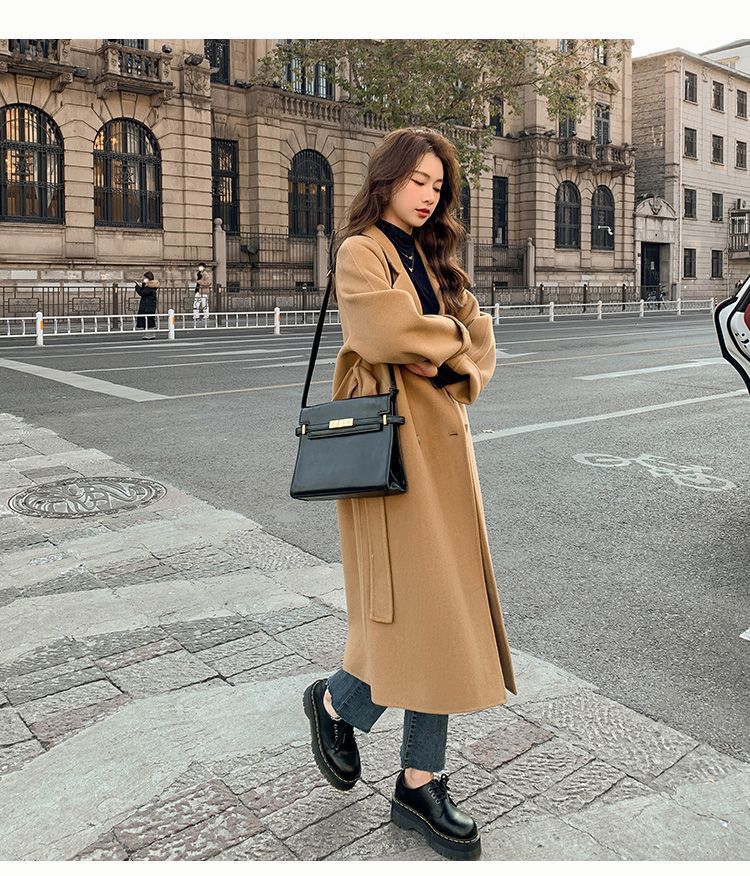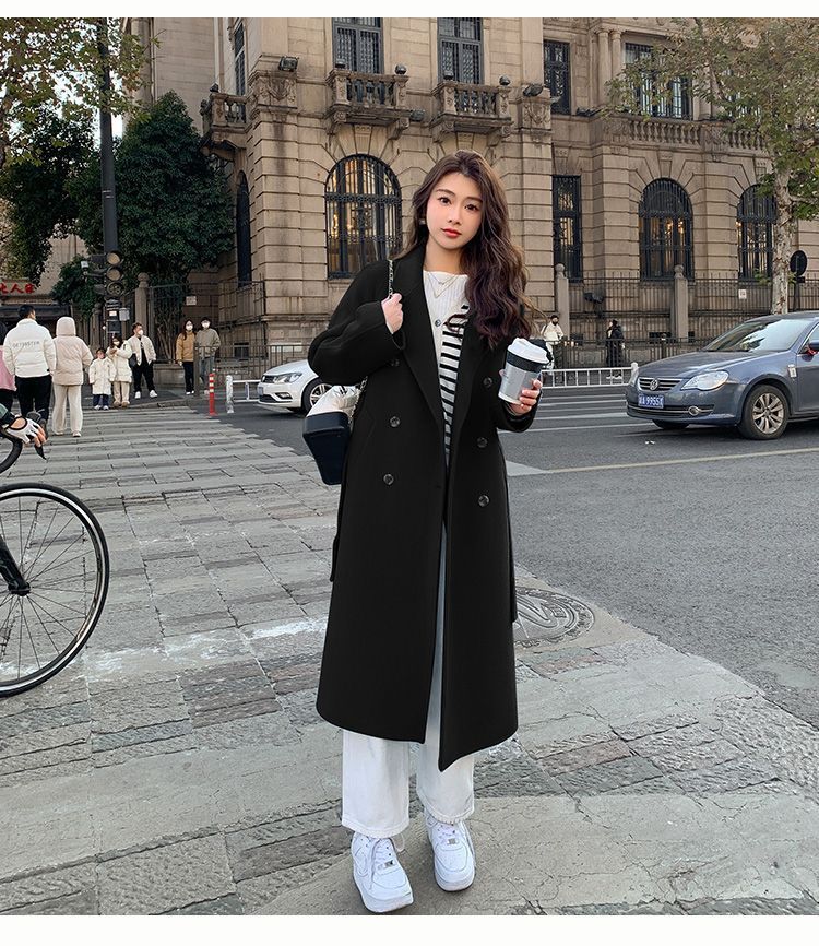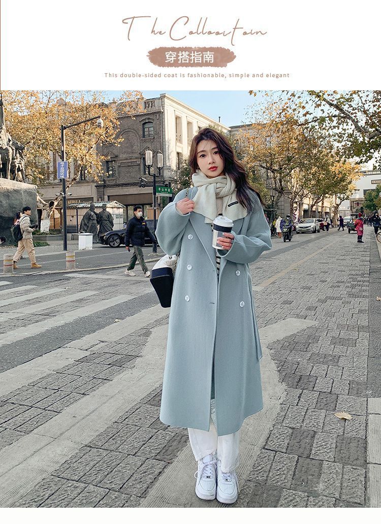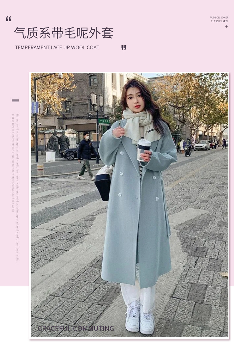 블루 한국 스타일 통근용 모직 코트 2025 가을 겨울 신상 한국 스타일 루즈핏 중간 길이 레이스업 모직 코트 여성용스토어 가기