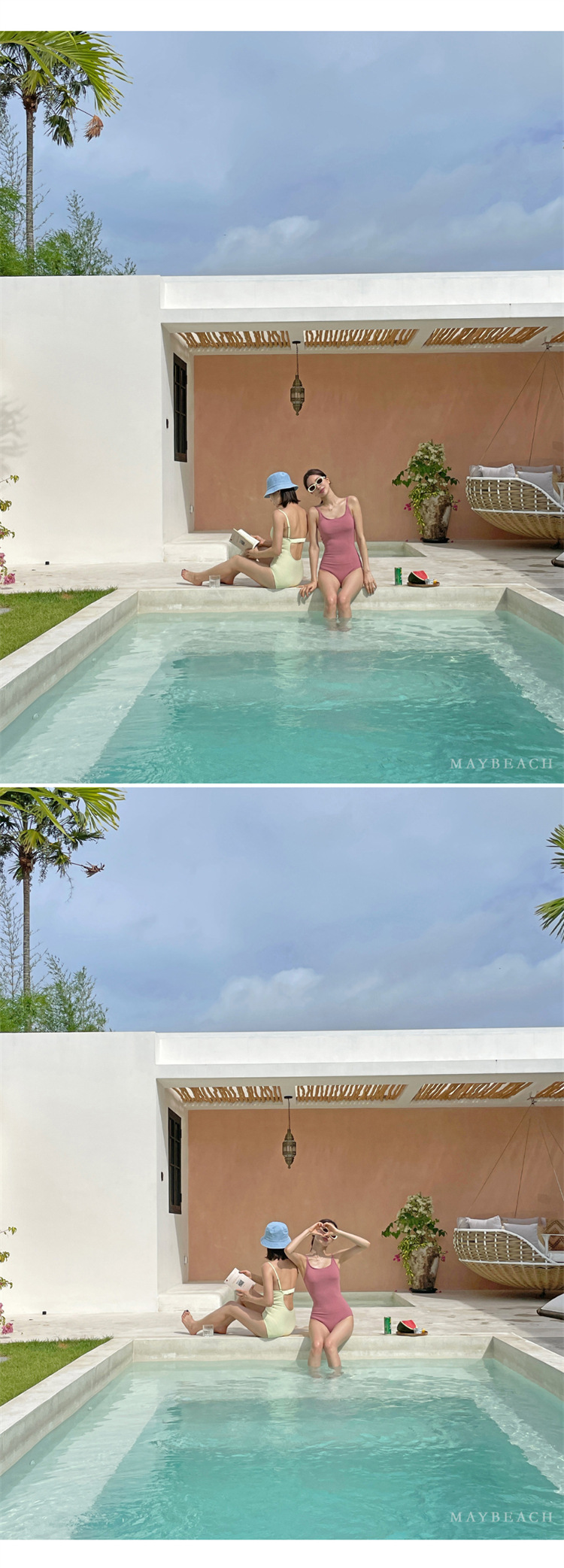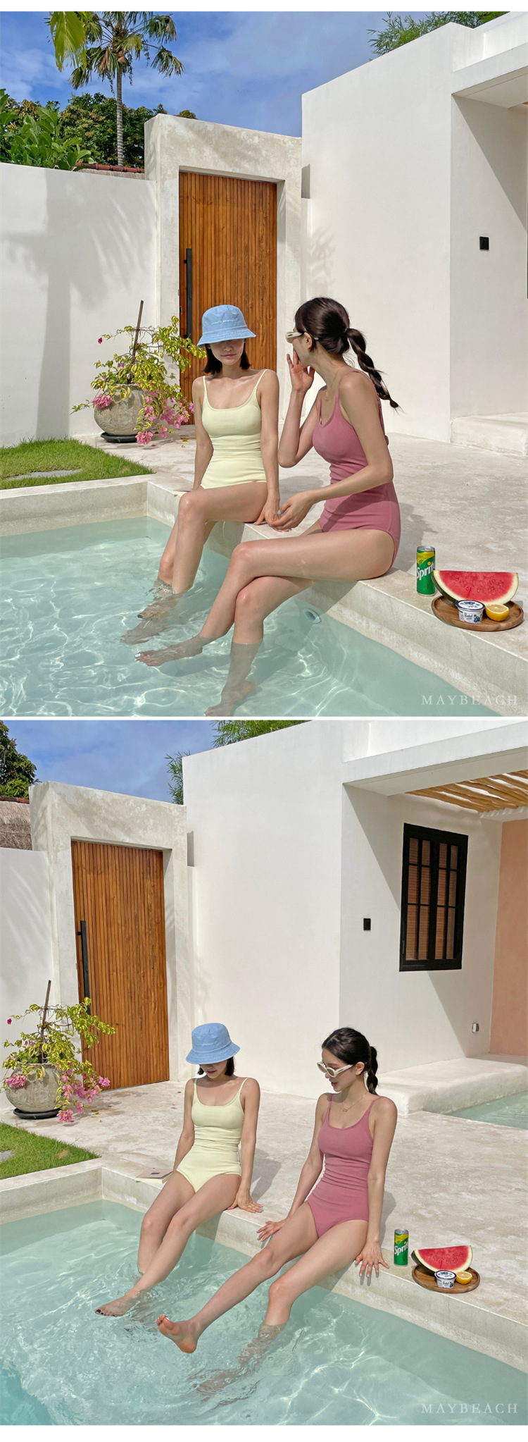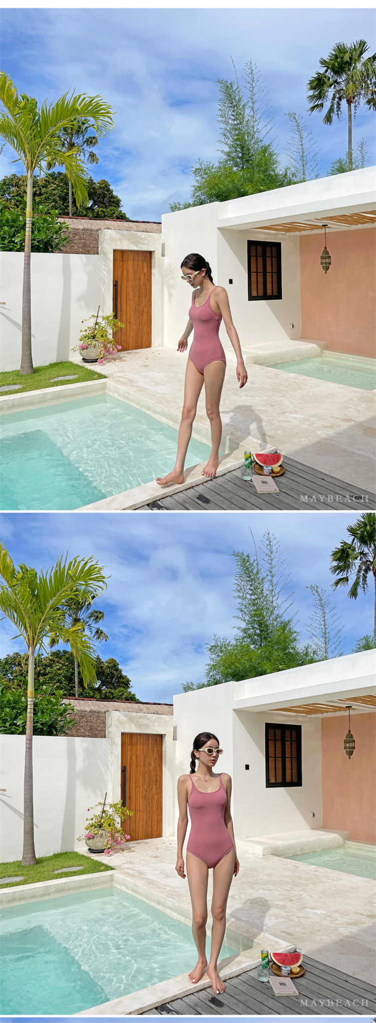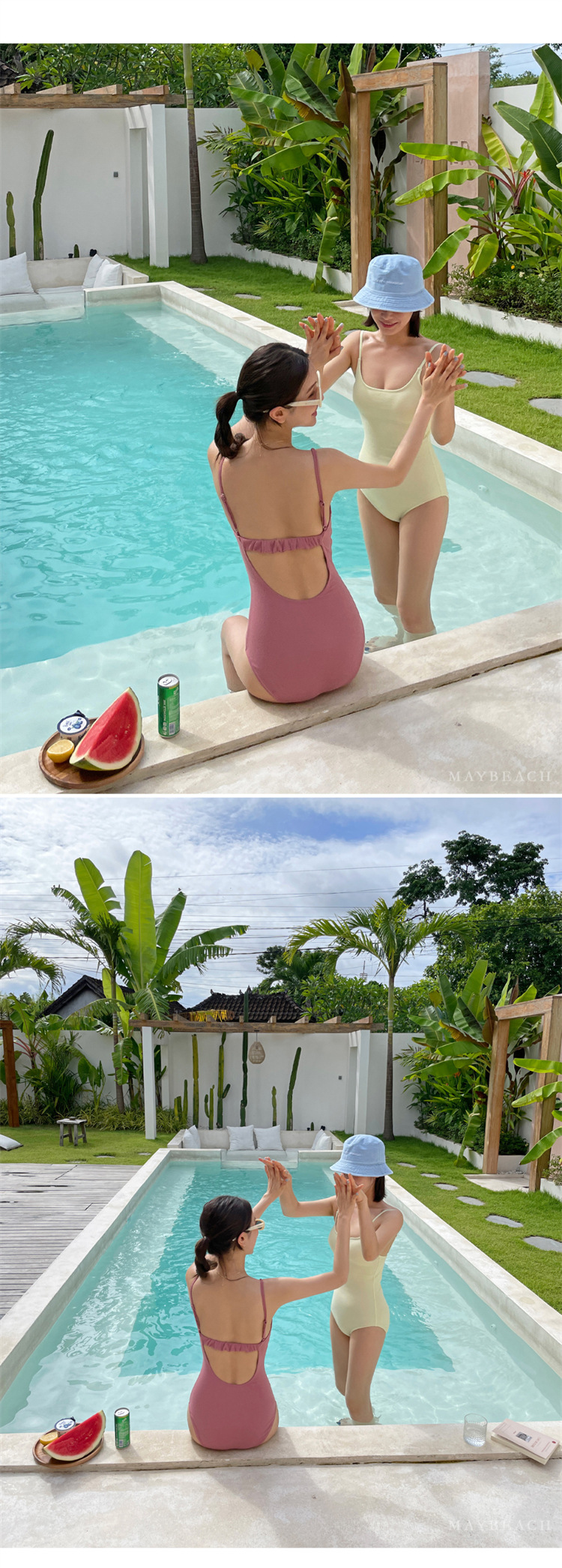2023 새로운 심플한 솔리드 컬러 스타일 소녀의 등이없는 스트랩 원피스 온천 휴가 수영복 여성용스토어 가기