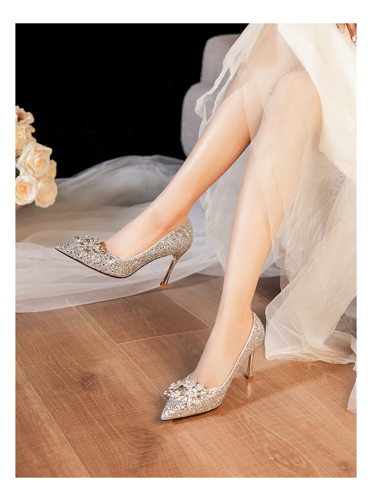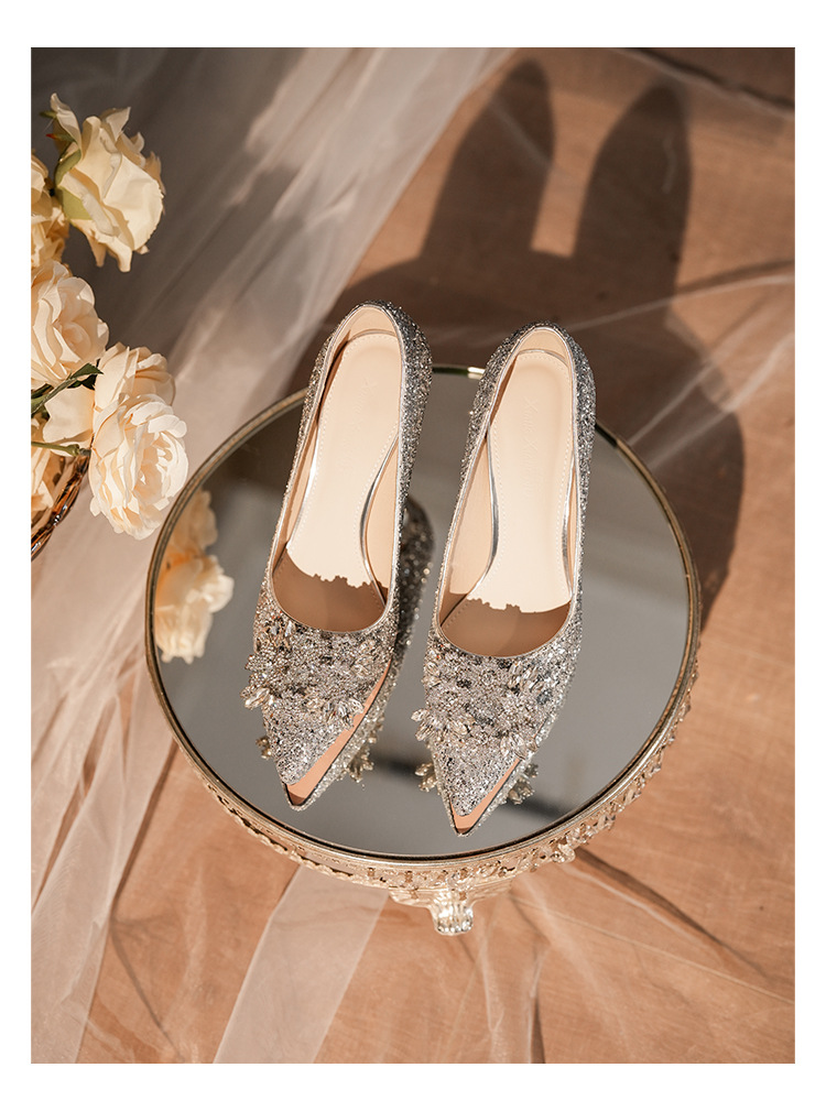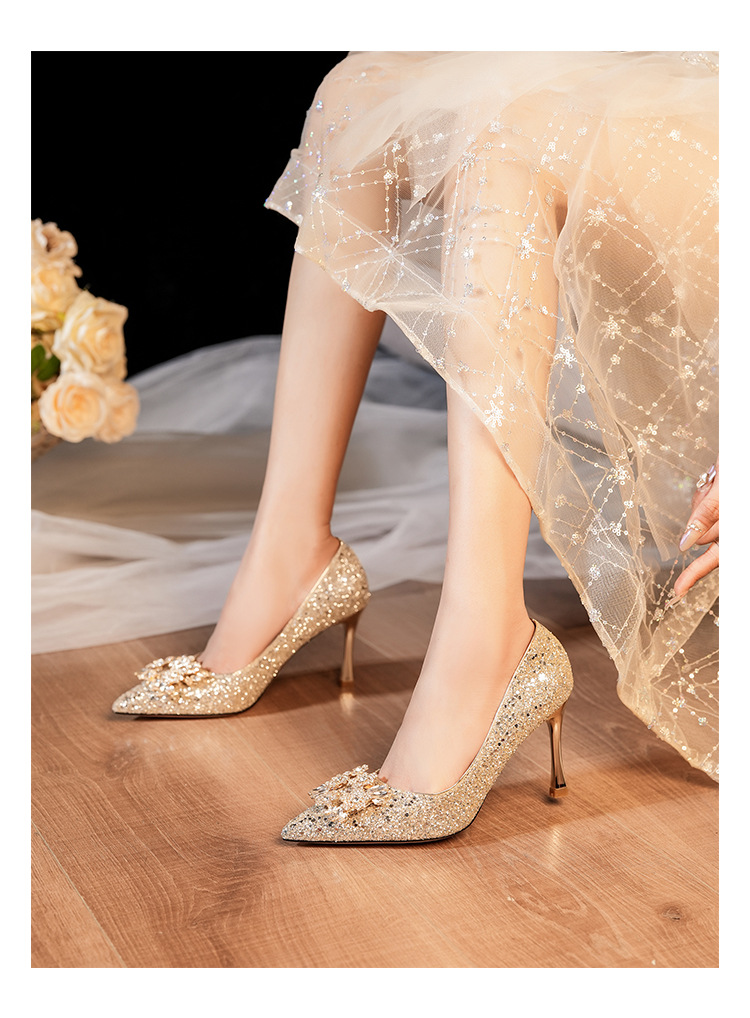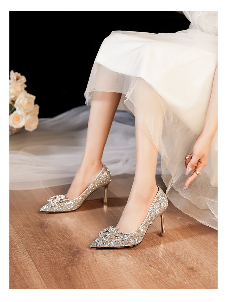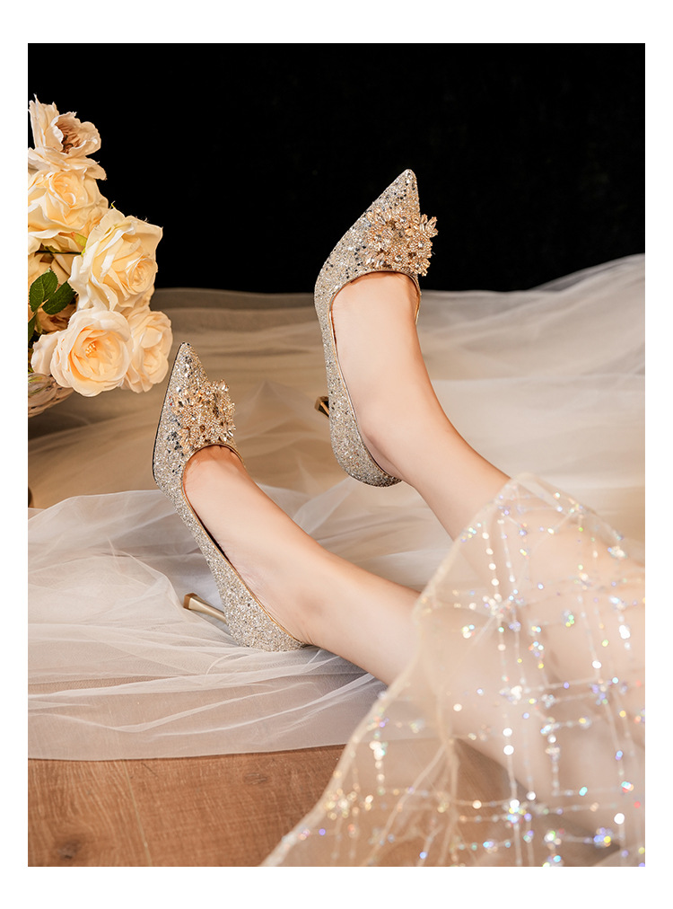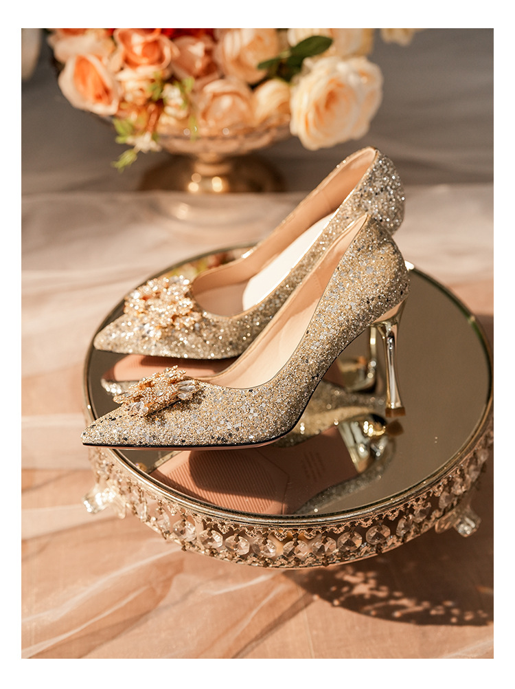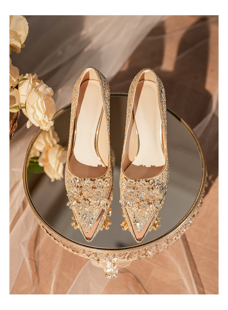 황금 웨딩 슈즈 Xiuhe 웨딩 원피스 2 착용 신부 신발 고급 라인 석 프랑스 하이힐 여성 사이즈 들러리 신발스토어 가기