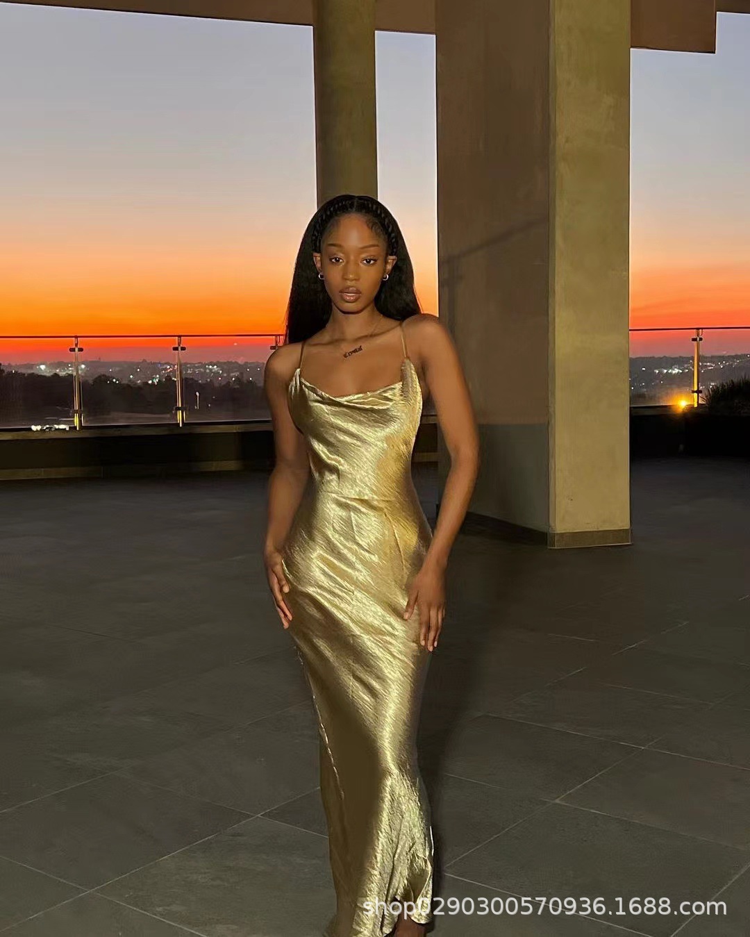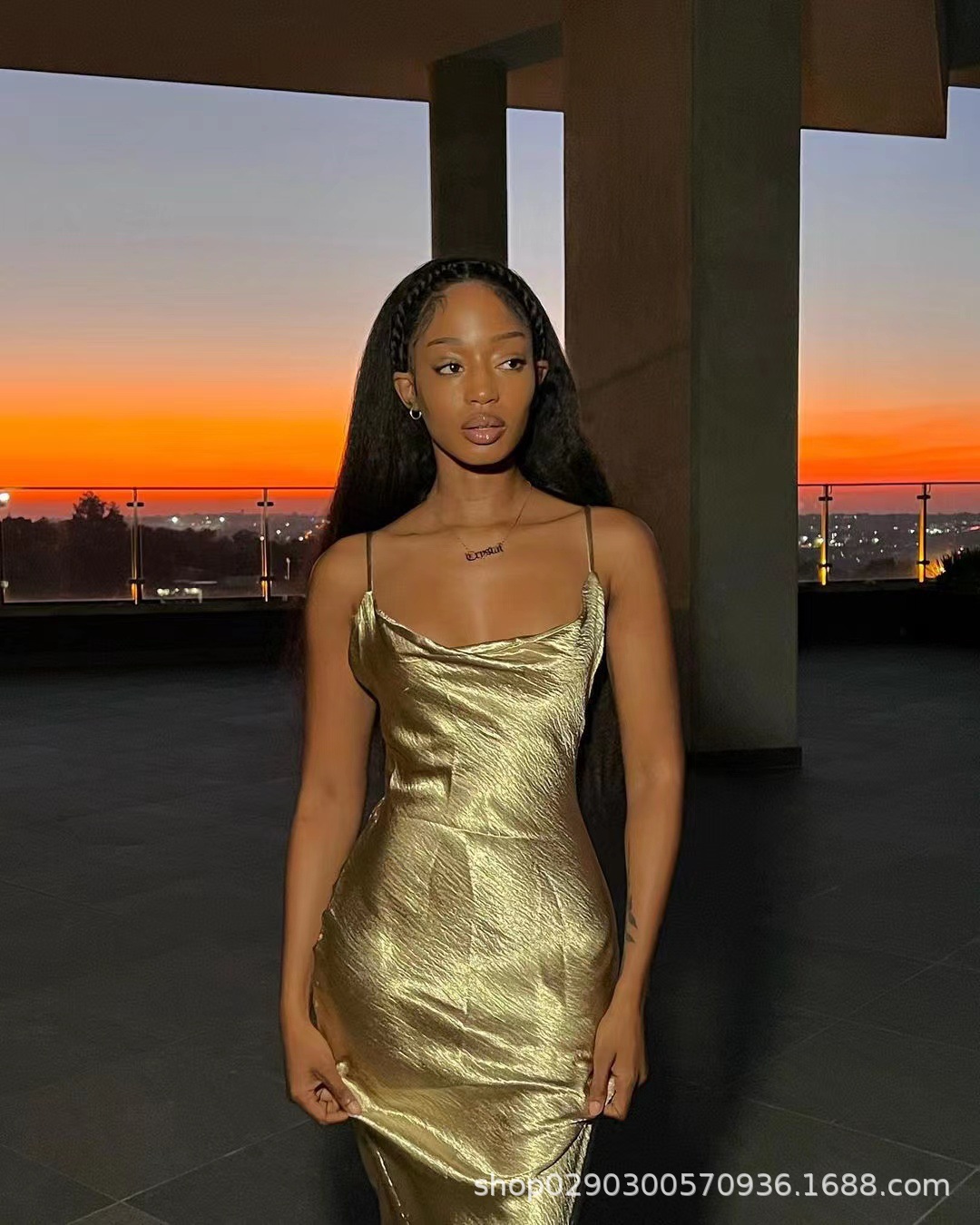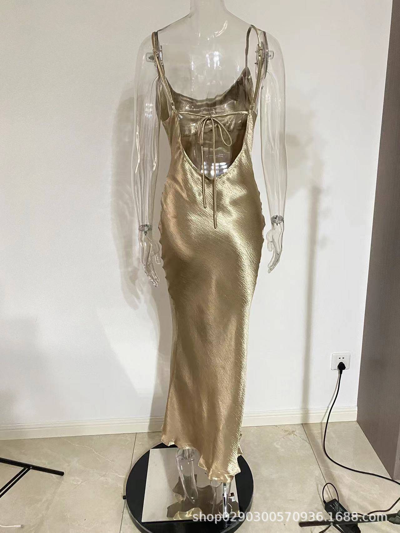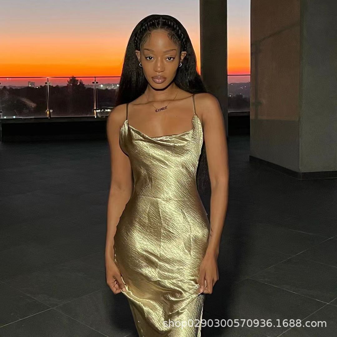 아마존 폭발 기질 등이없는 멜빵 피쉬 테일 골드 원피스 대외 무역 도매 스윙 칼라 헤어 원피스 세대
