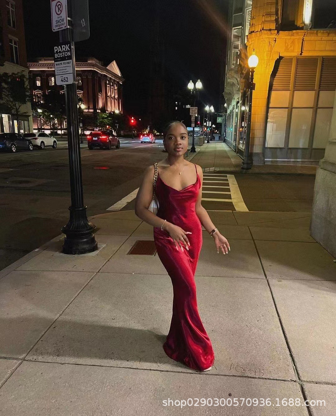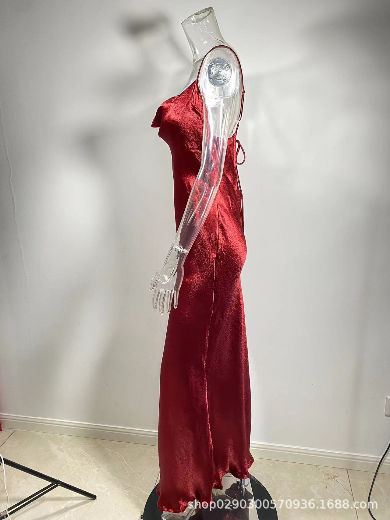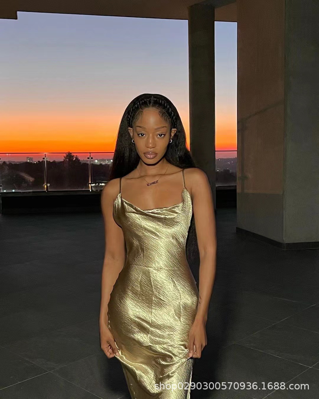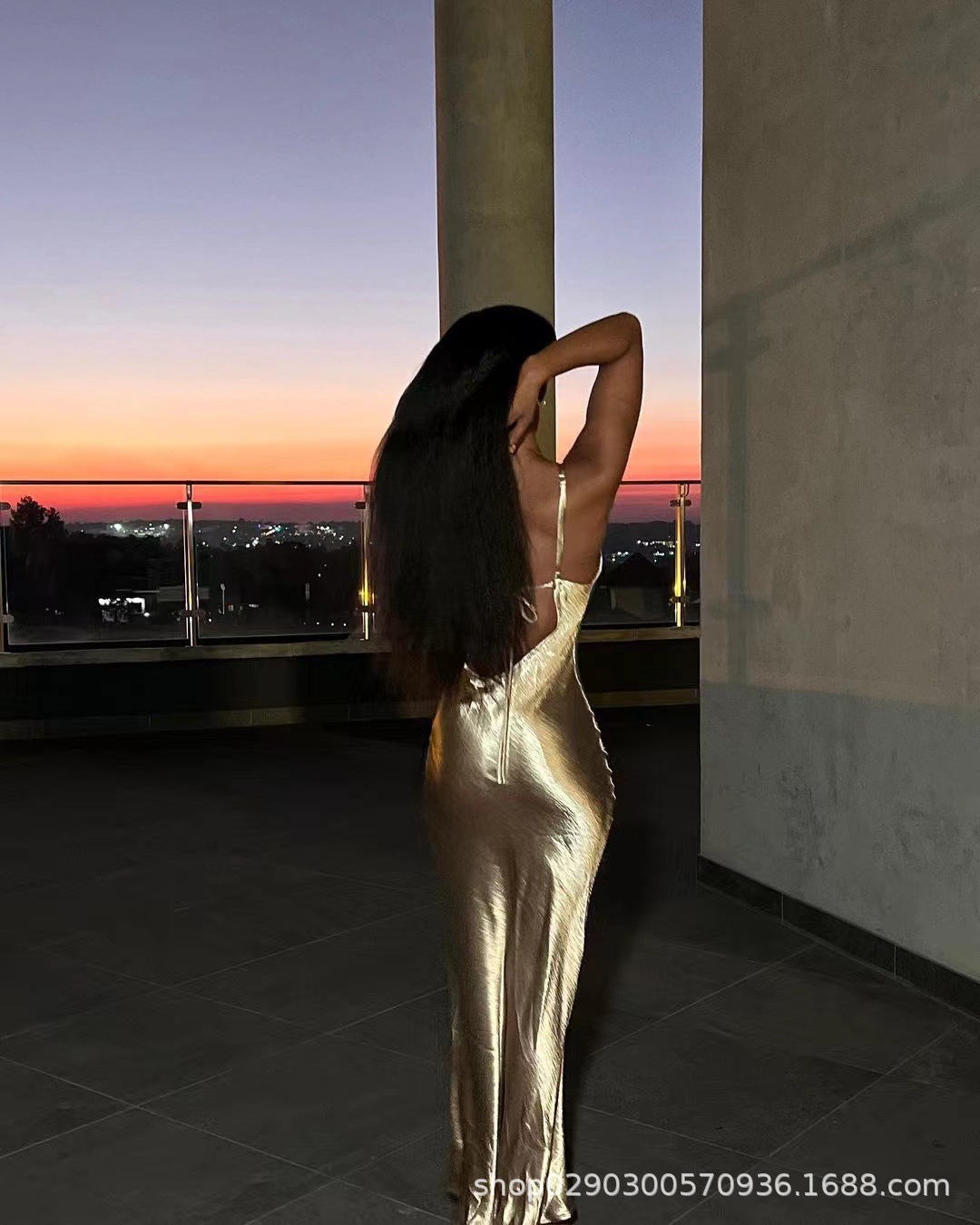 아마존 폭발 기질 등이없는 멜빵 피쉬 테일 골드 원피스 대외 무역 도매 스윙 칼라 헤어 원피스 세대