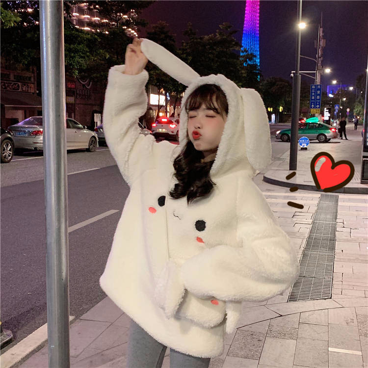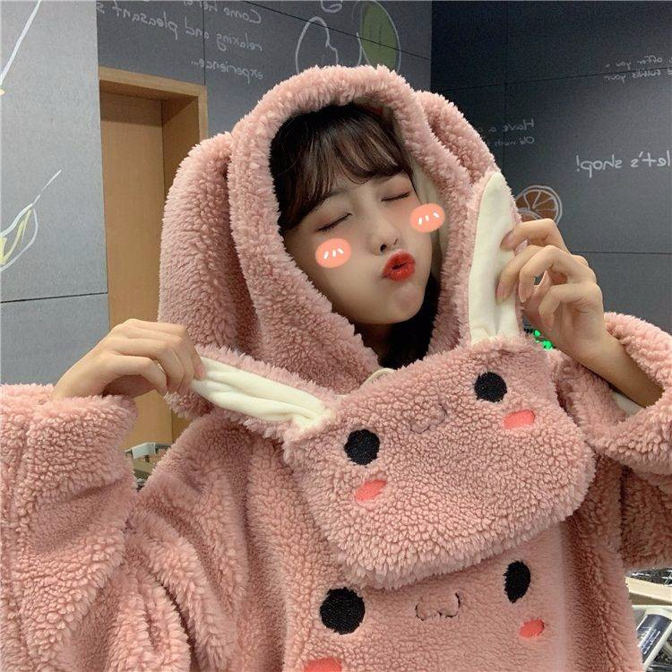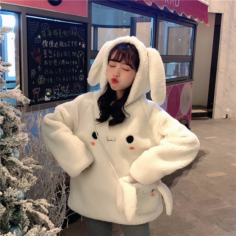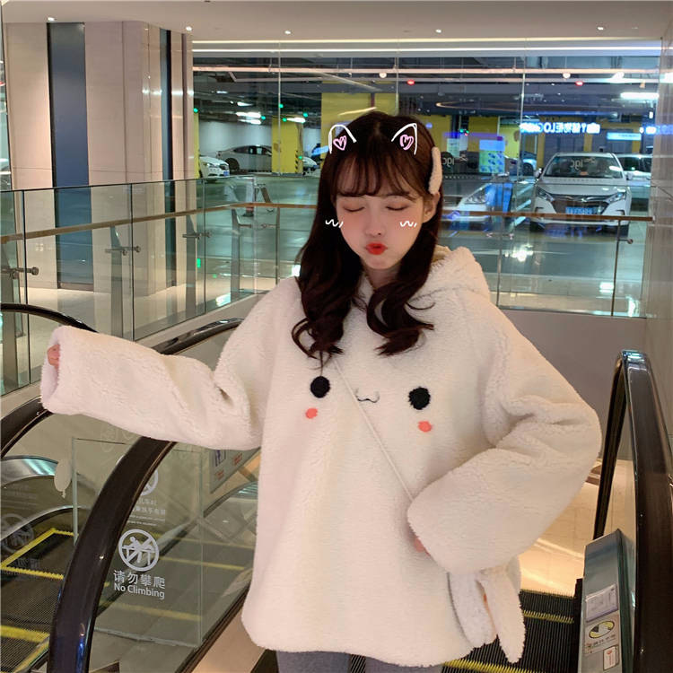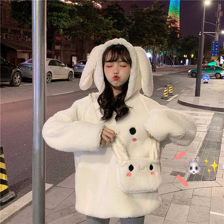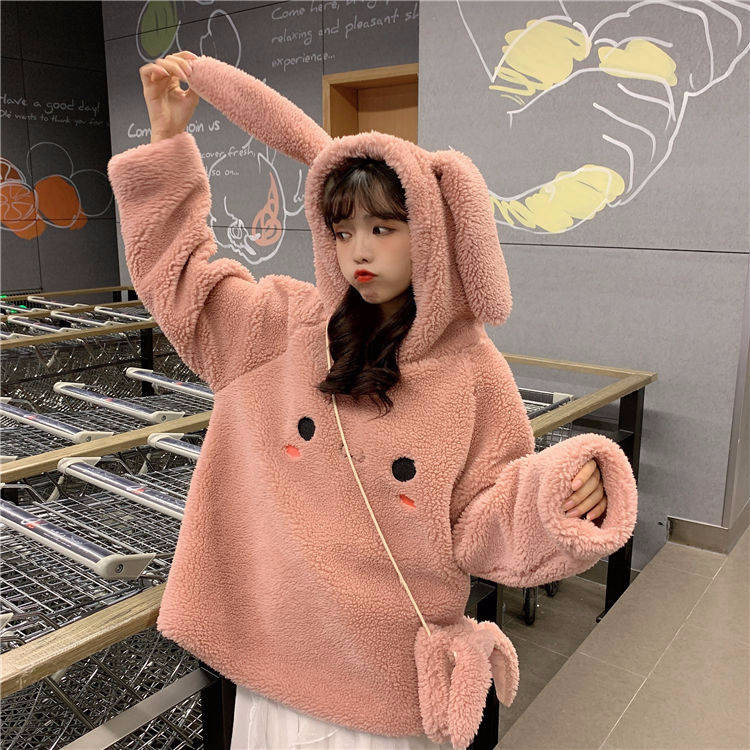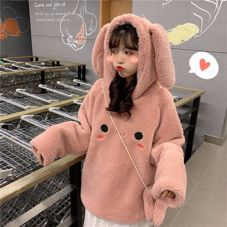 [같은 가방 보내기] 가을과 겨울 모조 양고기 플러시 스웨터 두꺼운 긴 귀 후드 코트의 한국 버전스토어 가기