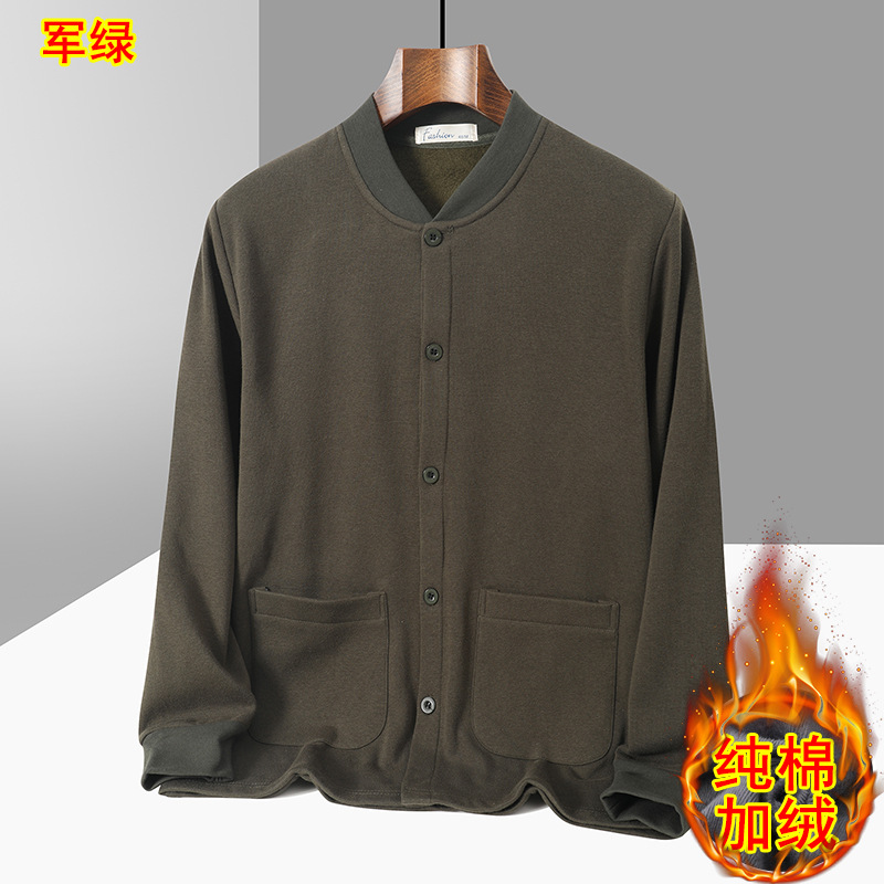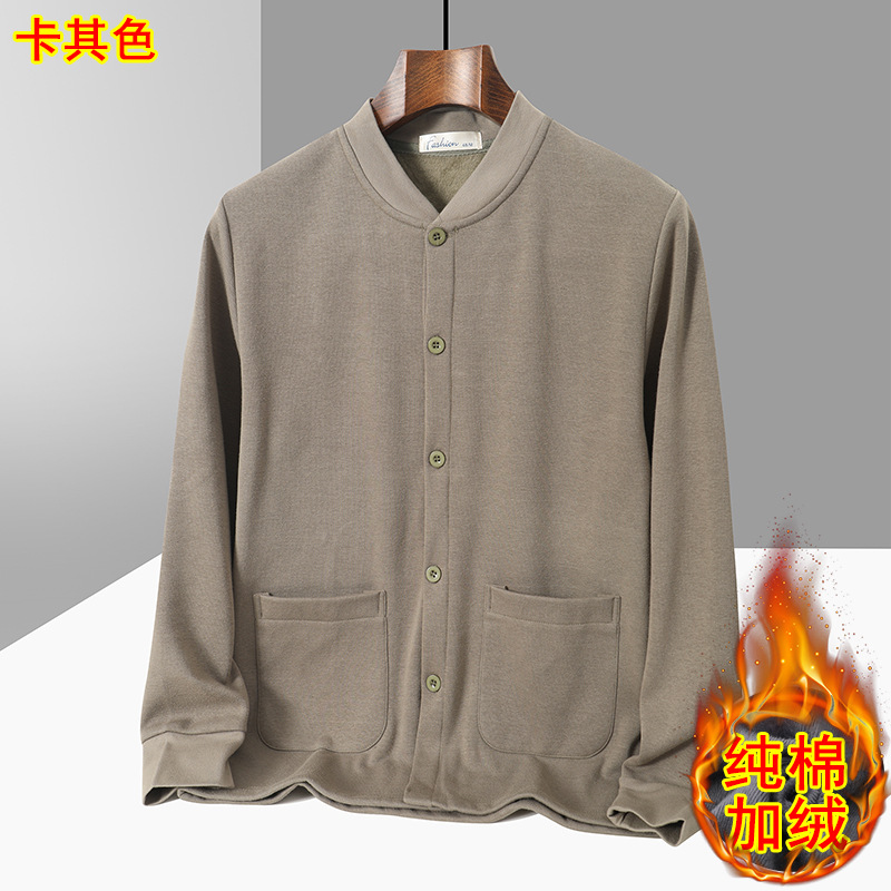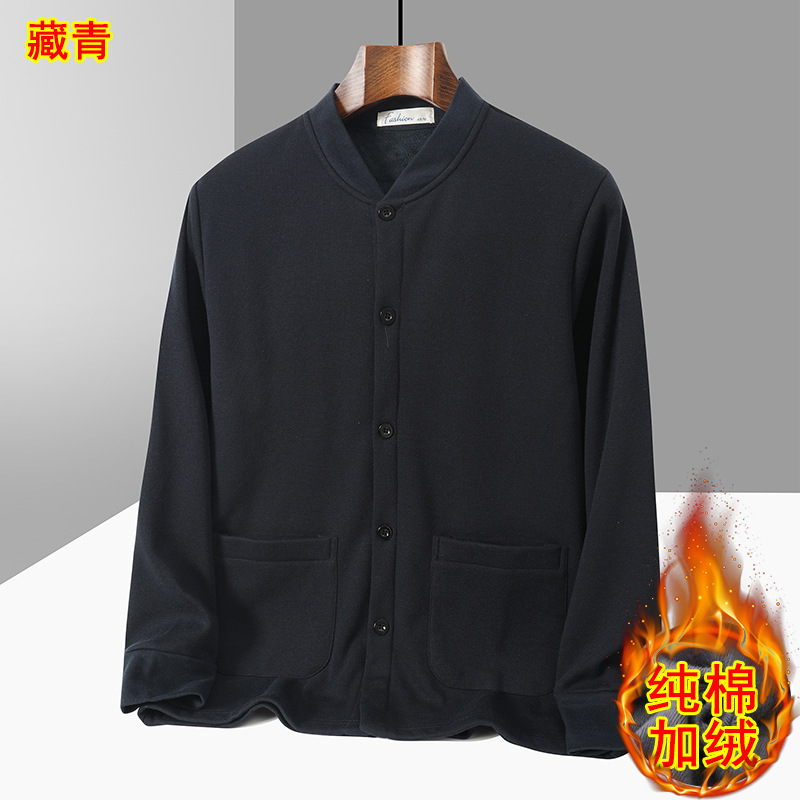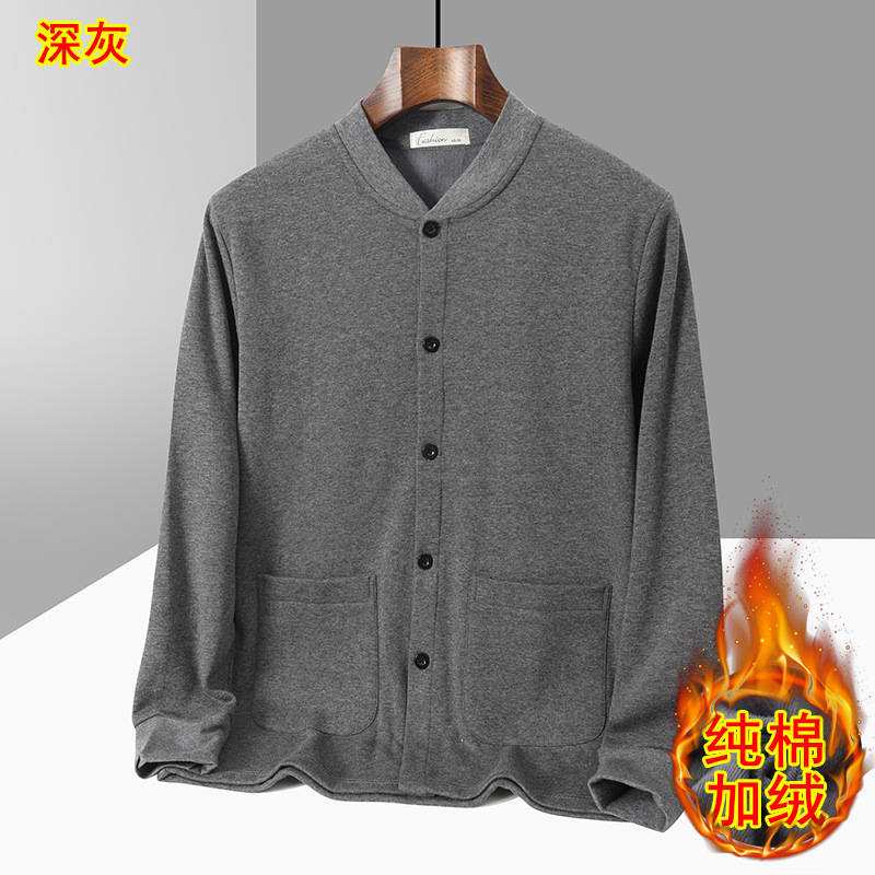 아빠의 카디건 면 기모 긴팔 티셔츠 가을과 겨울 중년 및 노인 남성의 따뜻한 탑 할아버지 두꺼운베이스 셔츠