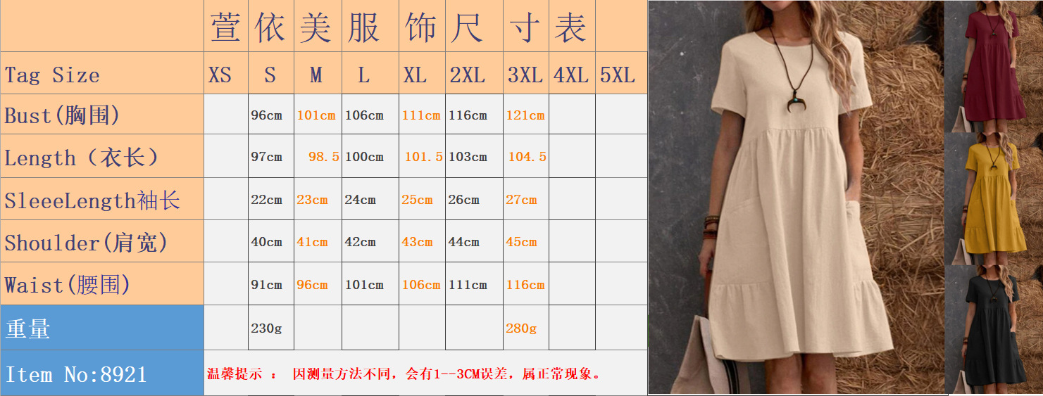 2025 여름 유럽과 미국의 국경 TEMU 독립 스테이션 레트로 루즈 포켓 솔리드 컬러 라운드 넥 여성 코튼과 린넨 드레스