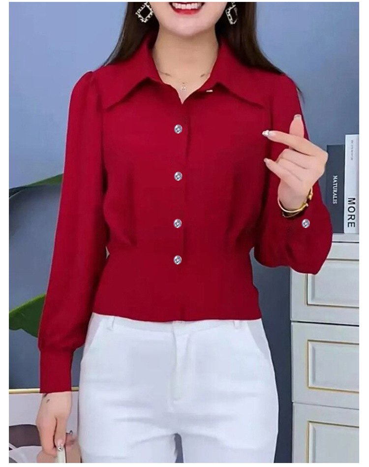 여성용 레드 새 셔츠 쉬폰 긴팔 탑 봄과 가을 카운터 패션 우아한 한국식 올매치 솔리드 컬러 스몰 셔츠