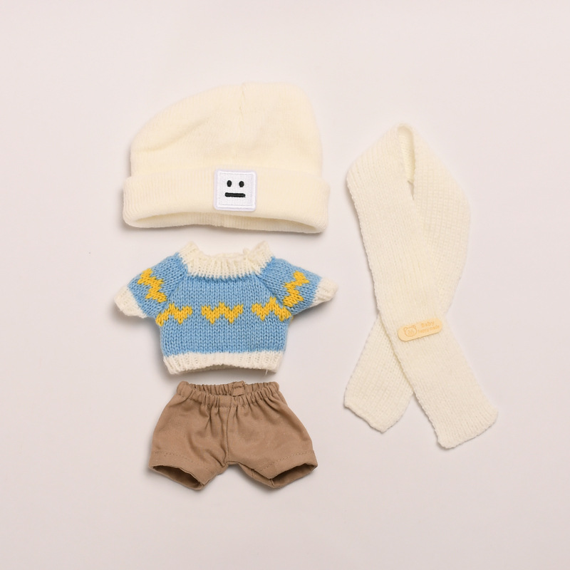 • 블루 스웨터 + 스카프 + 바지 + 모자 (인형 제외)