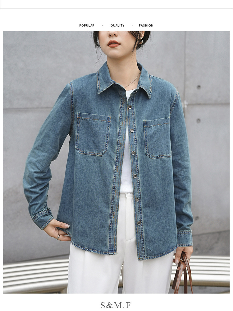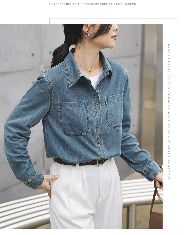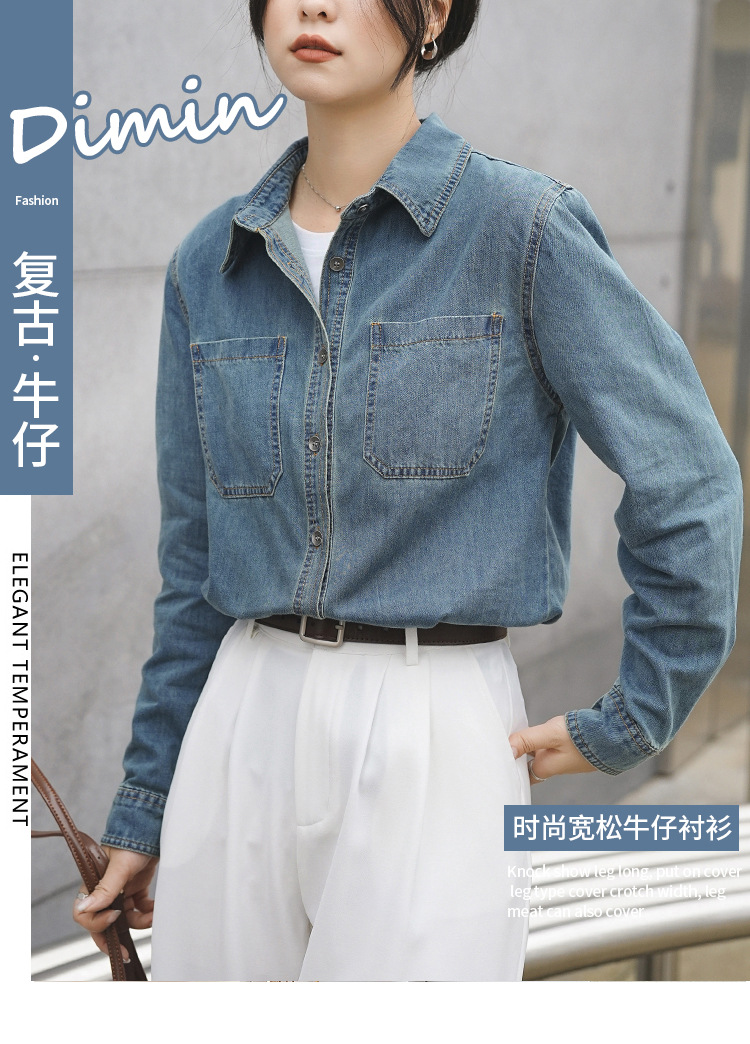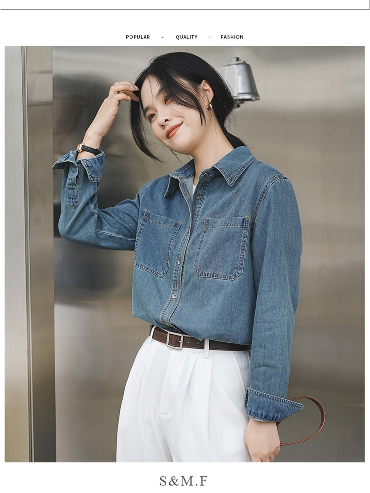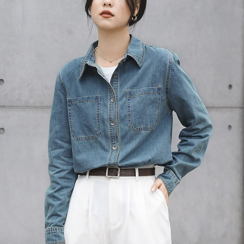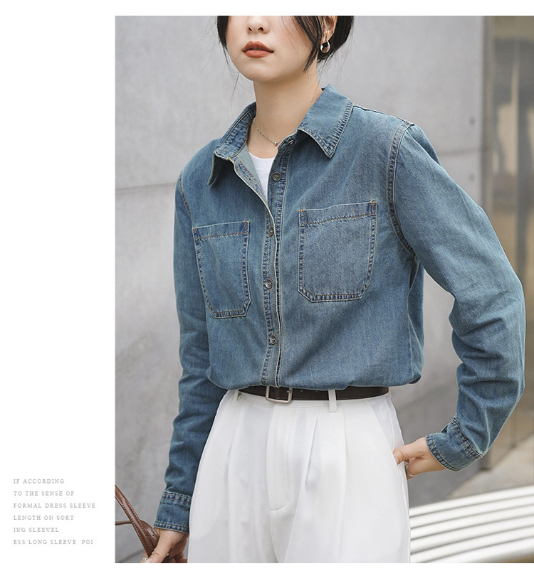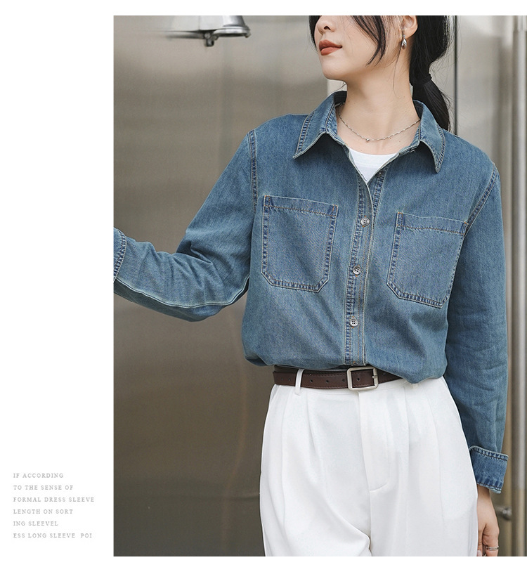 빈티지 데님 고뇌 블루 소프트 데님 셔츠 여자의 가을 2023 새로운 모든 경기 앞 어깨 접힌 긴 소매 셔츠스토어 가기
