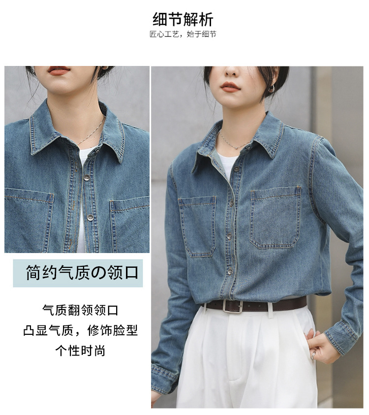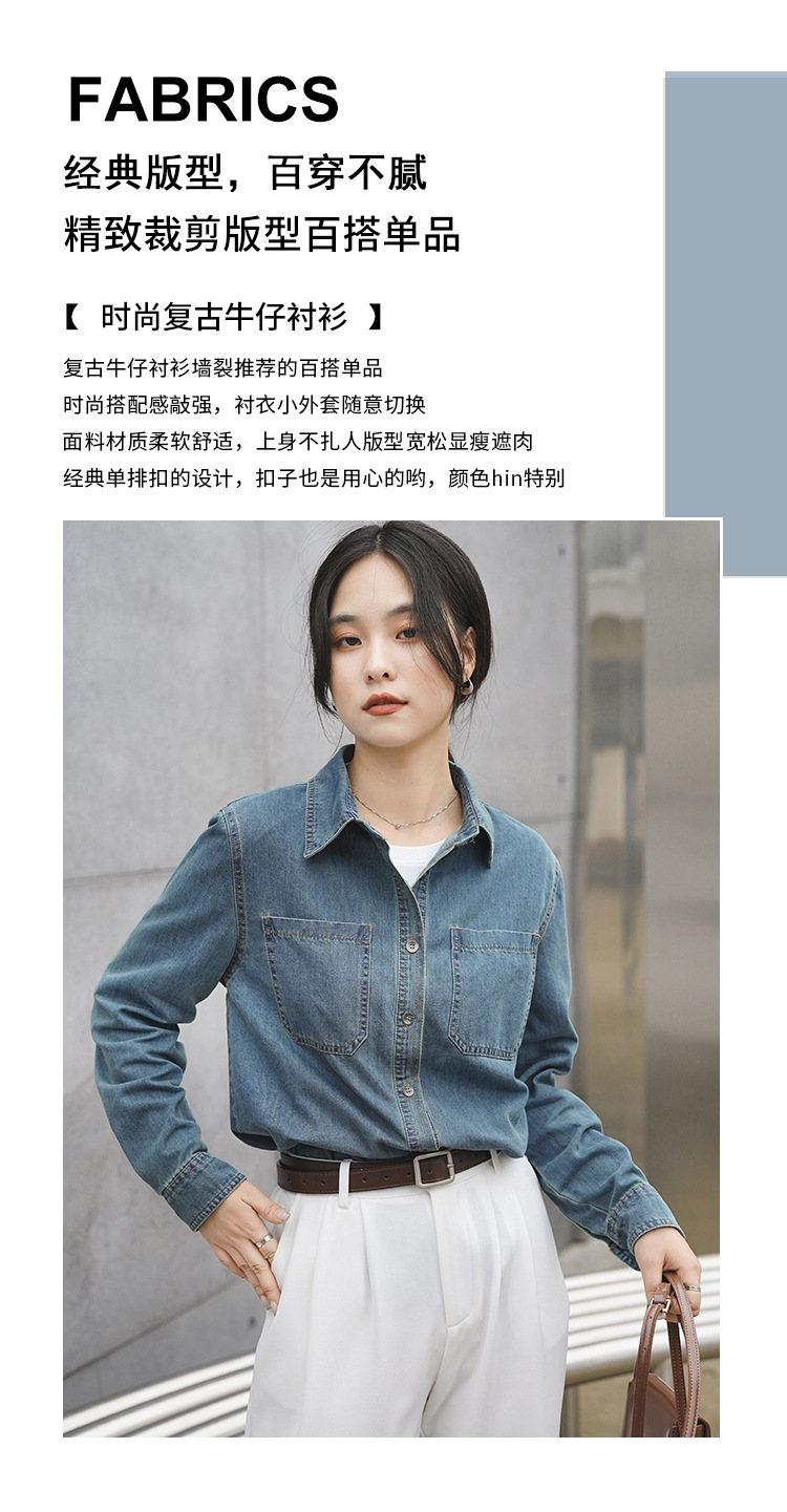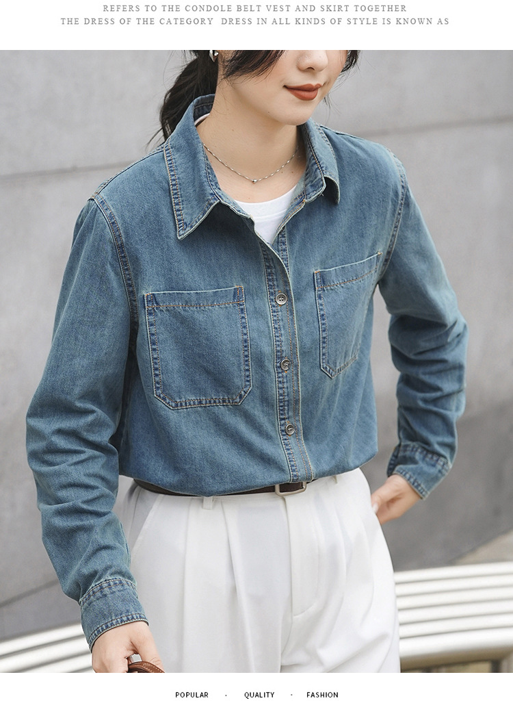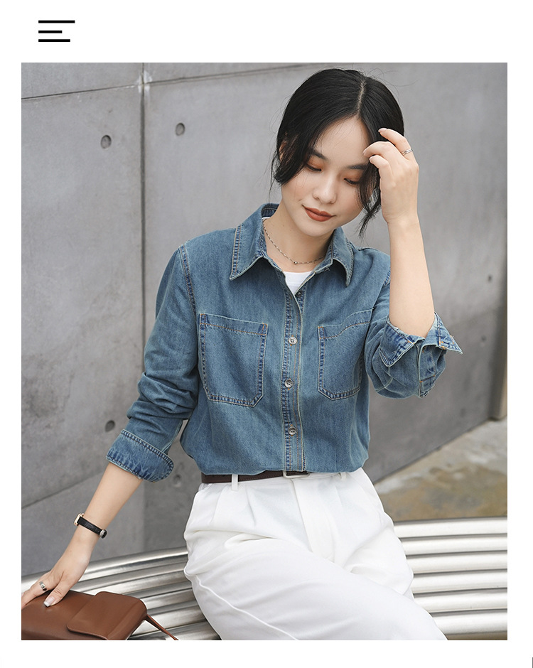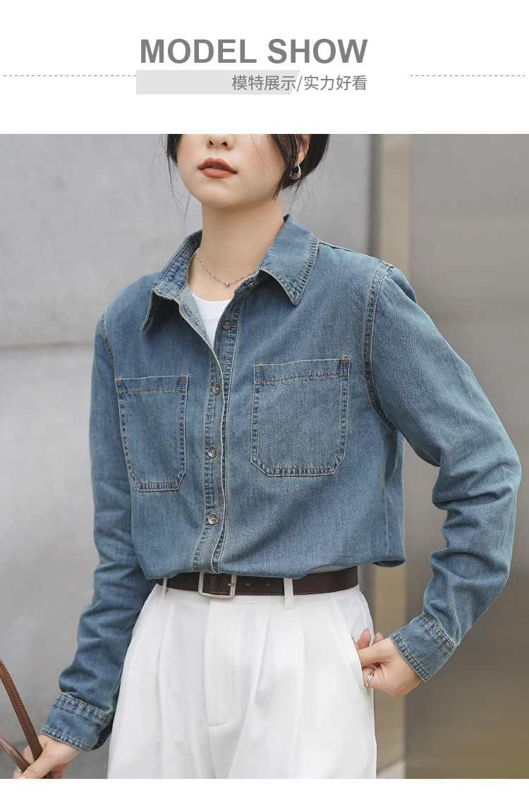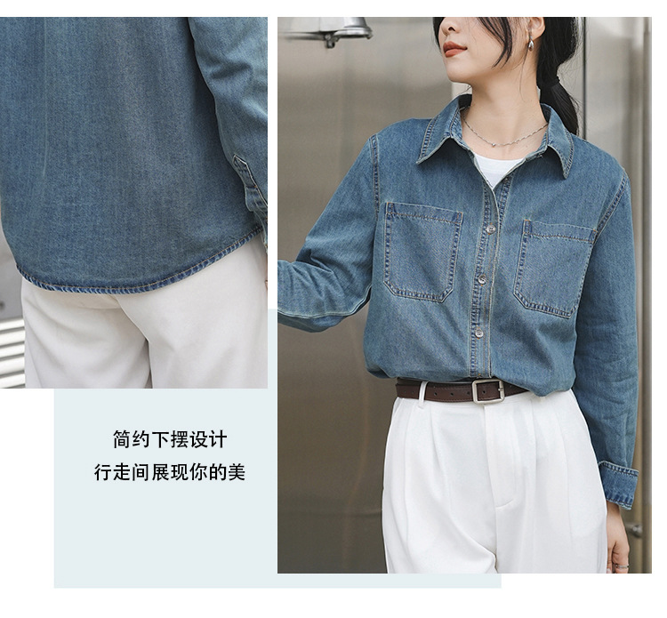 빈티지 데님 고뇌 블루 소프트 데님 셔츠 여자의 가을 2023 새로운 모든 경기 앞 어깨 접힌 긴 소매 셔츠스토어 가기