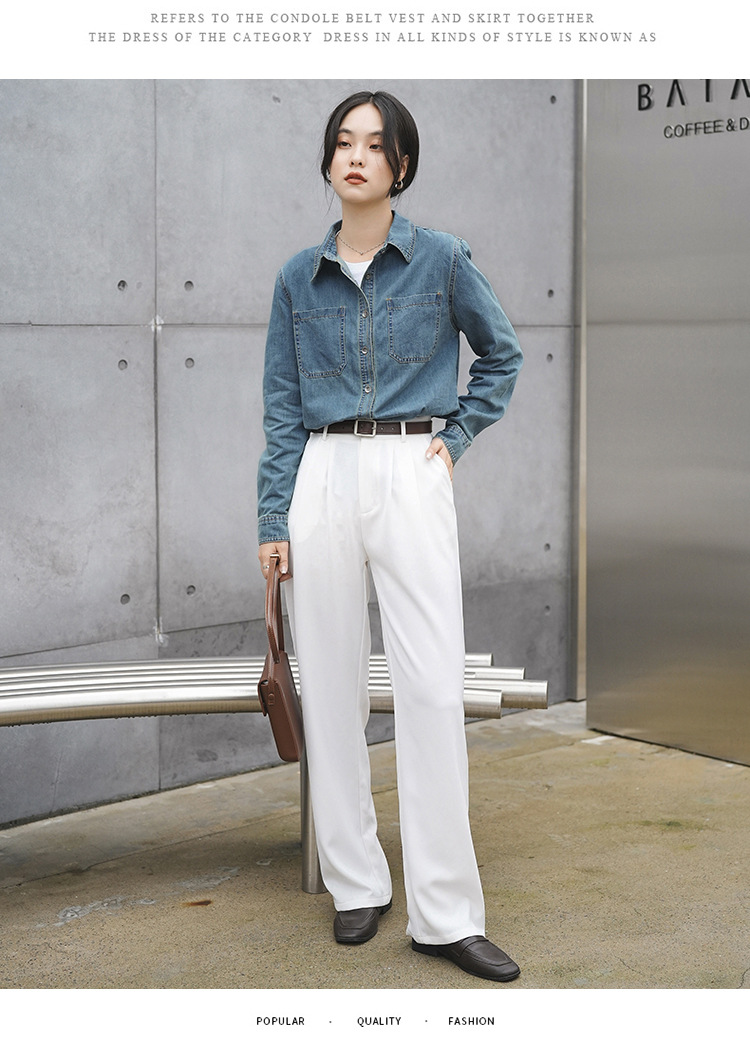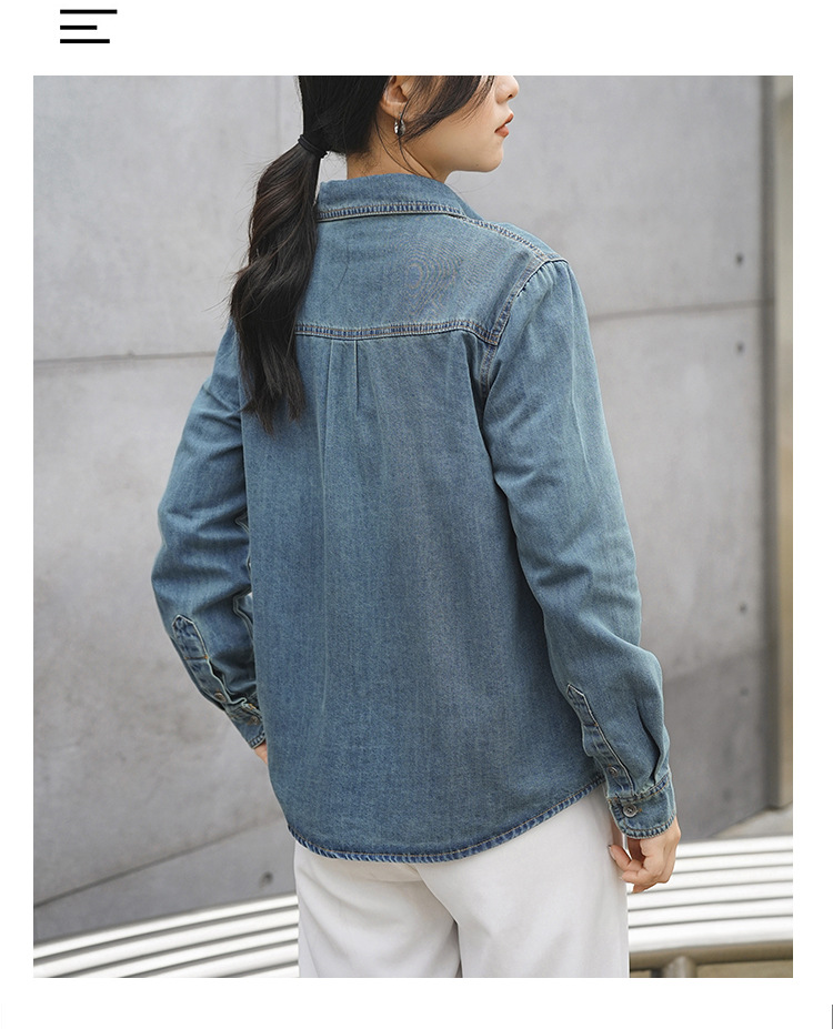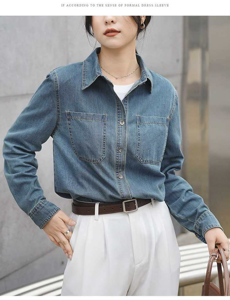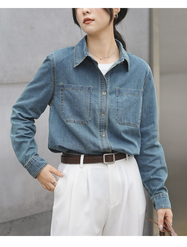 빈티지 데님 고뇌 블루 소프트 데님 셔츠 여자의 가을 2023 새로운 모든 경기 앞 어깨 접힌 긴 소매 셔츠