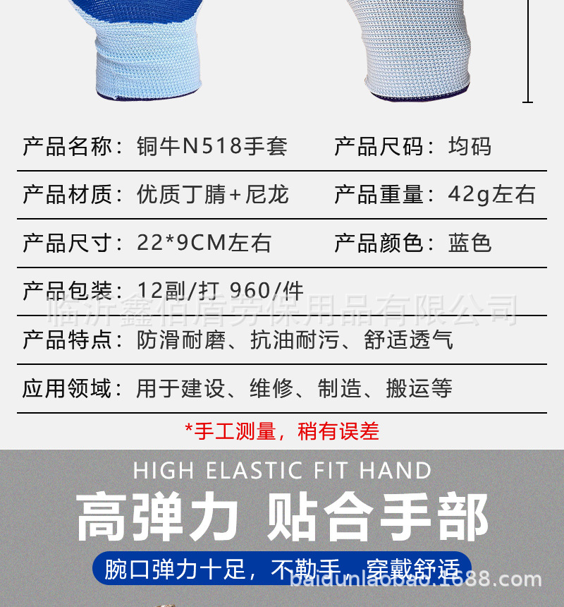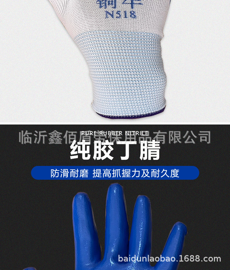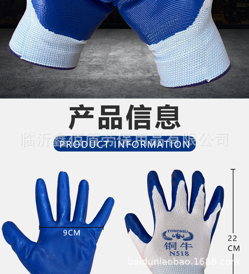 구리 암소 N518 흰색 원사 블루 니트릴 장갑 13 핀 담근 미끄럼 방지 내마모성 노동 보호 현장 작업을위한 접착 장갑스토어 가기