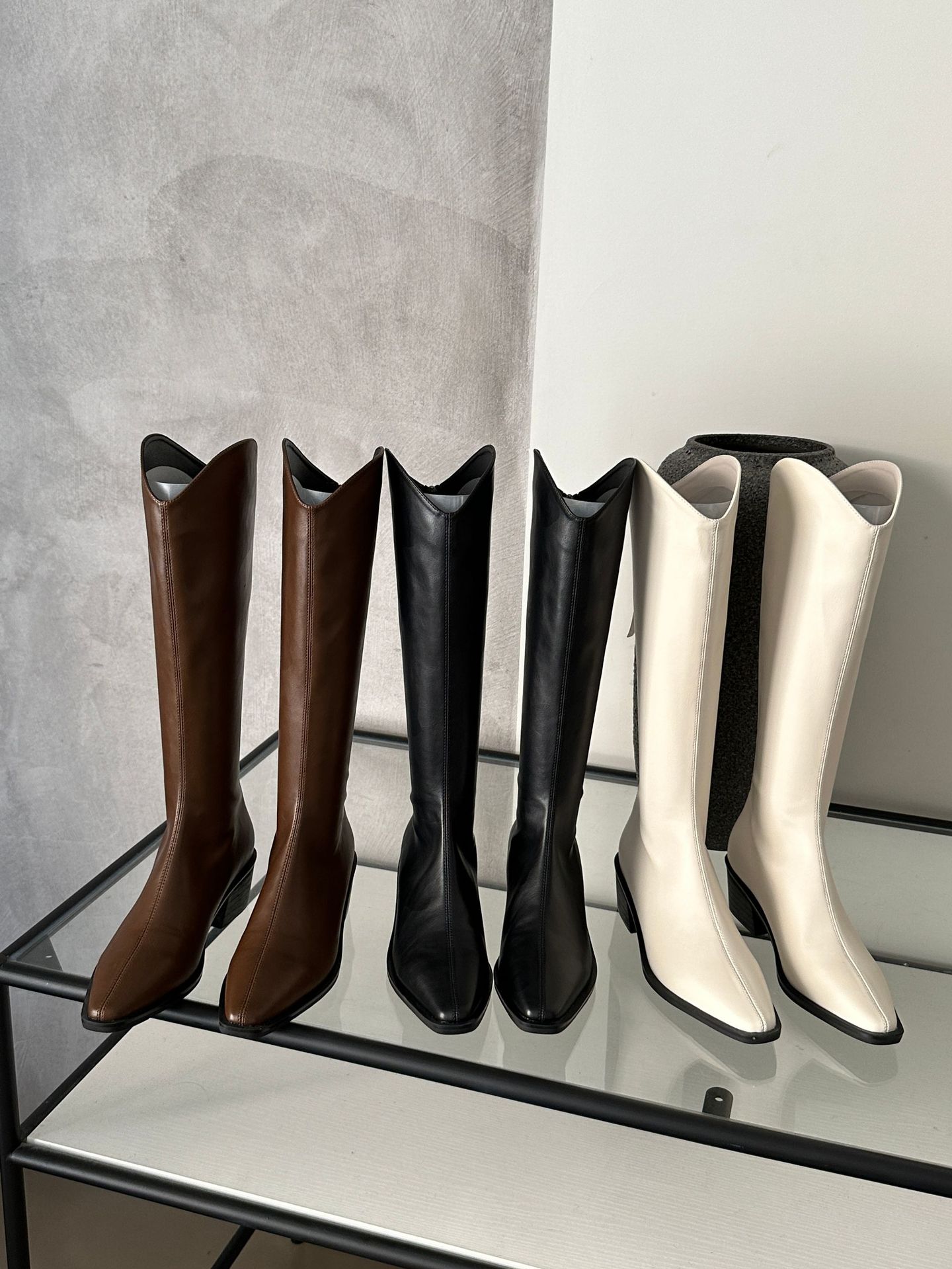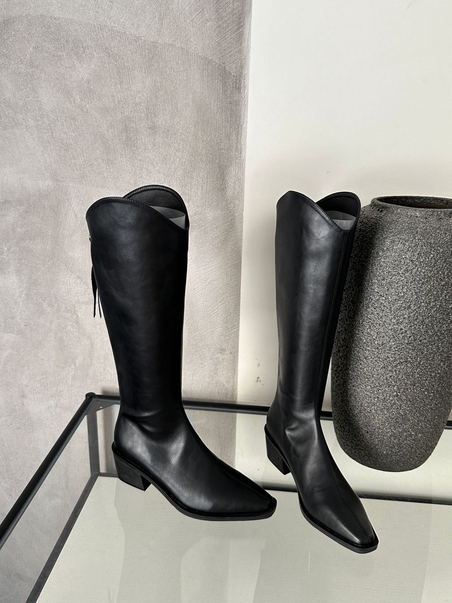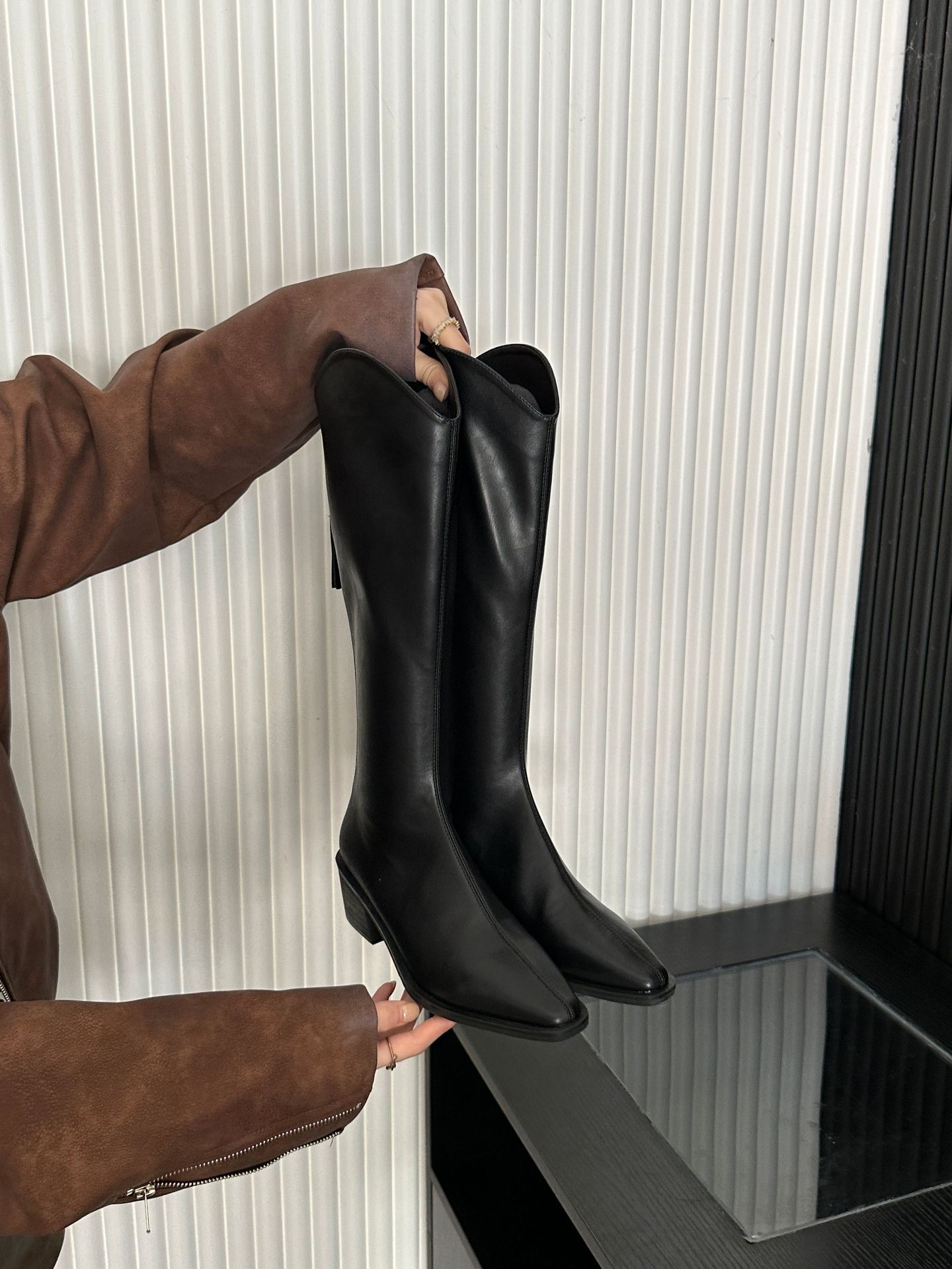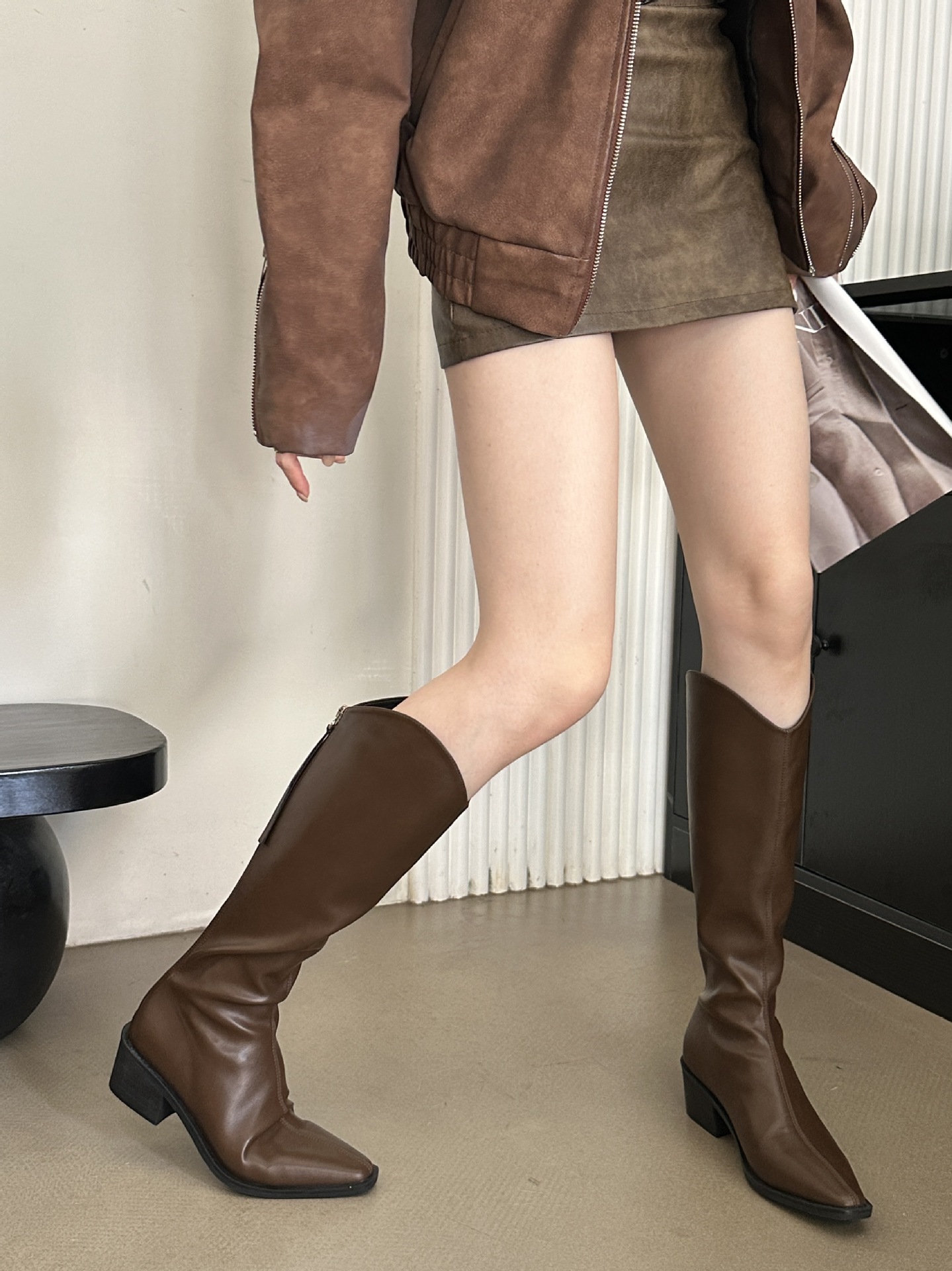 높은 굽 뾰족한 미국 스타일 레트로 롱 부츠 여성 신발 2023 새로운 가을과 겨울 다크 브라운 데님 긴 기사 부츠