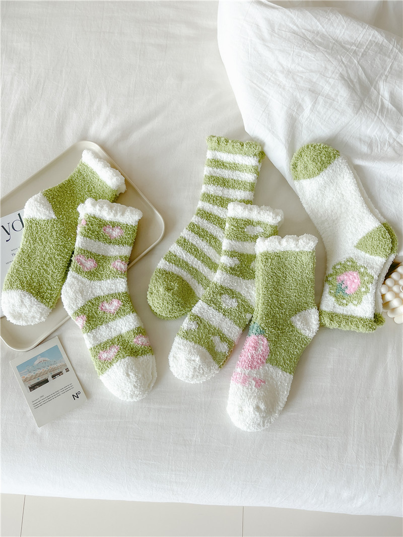 양말 여성용 겨울 산호 양털 기모 두꺼운 따뜻한 중간 튜브 양말 작은 신선한 녹색 스타일 바닥 양말 수면 여성 양말