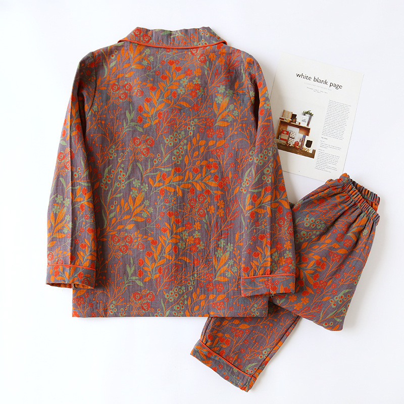 면사 염색 자카드 빈티지 잎 잠옷 세트 여성용 사계절 얇은 긴팔 바지 엄마의 가정복