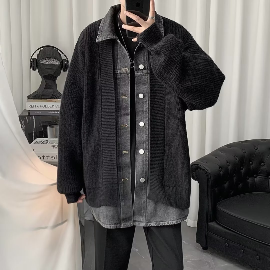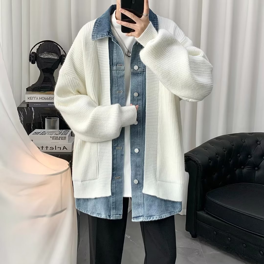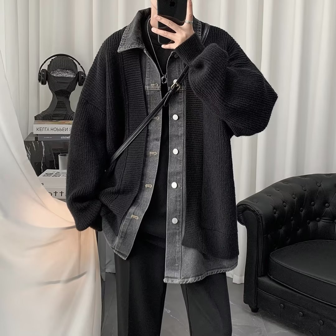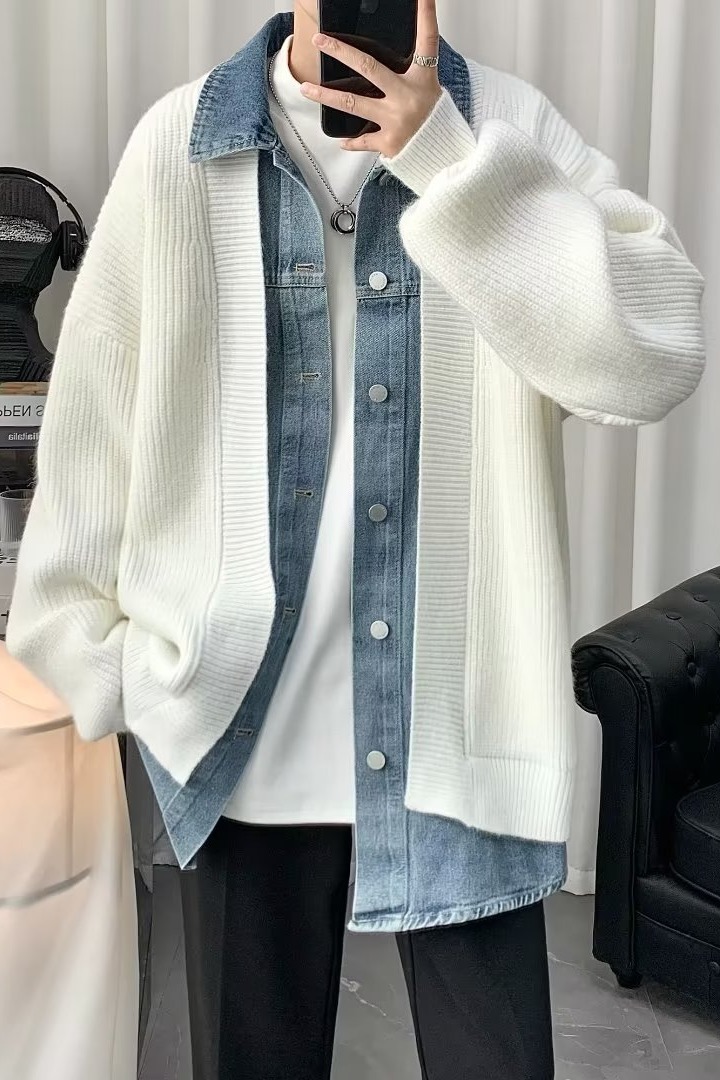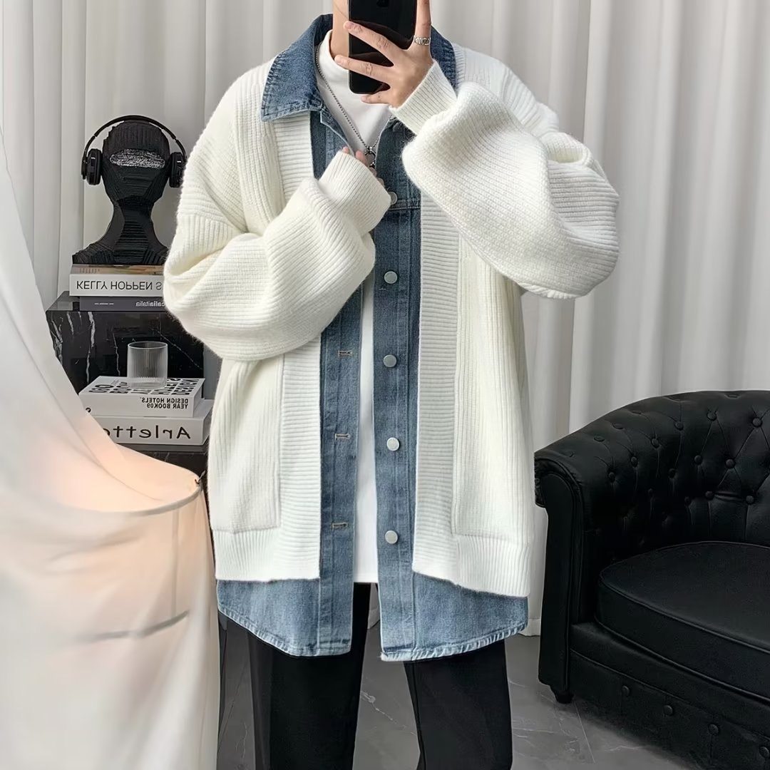 재킷 남성 2023 가을 겨울 새로운 남성 니트 가디건 재킷 가짜 투피스 컬러 매칭 의류 남성용 스웨터스토어 가기
