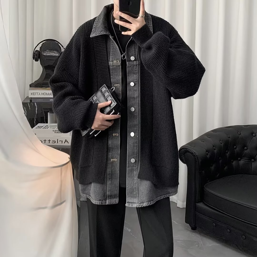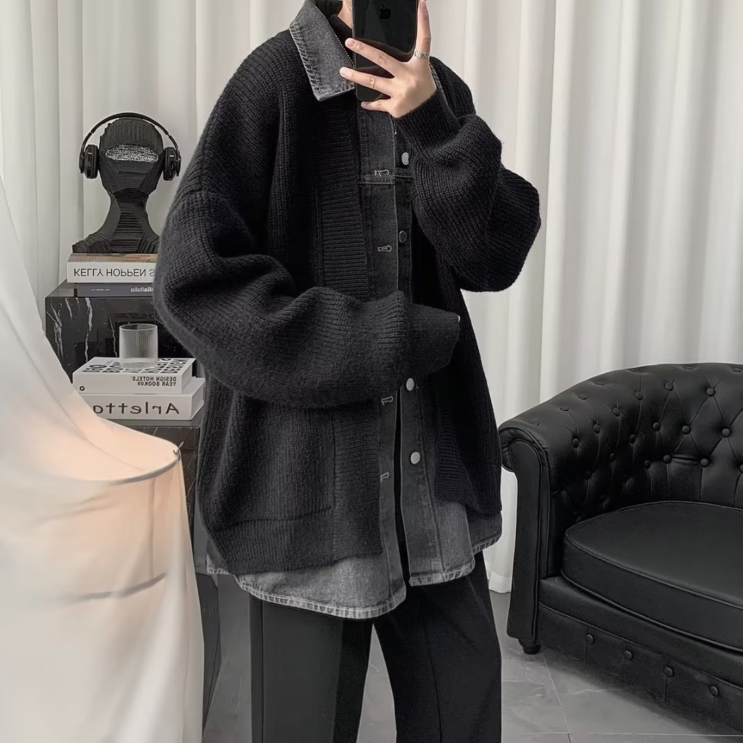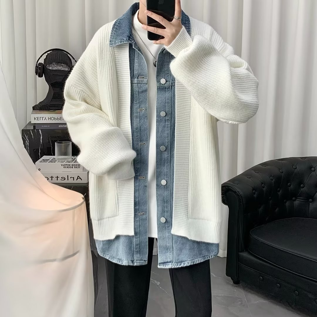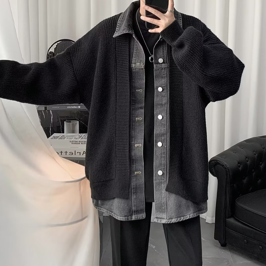 재킷 남성 2023 가을 겨울 새로운 남성 니트 가디건 재킷 가짜 투피스 컬러 매칭 의류 남성용 스웨터스토어 가기