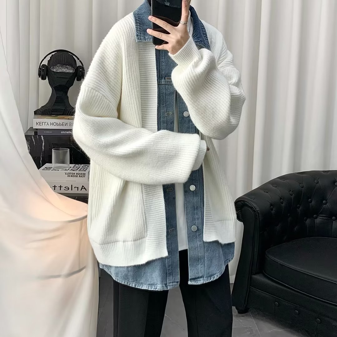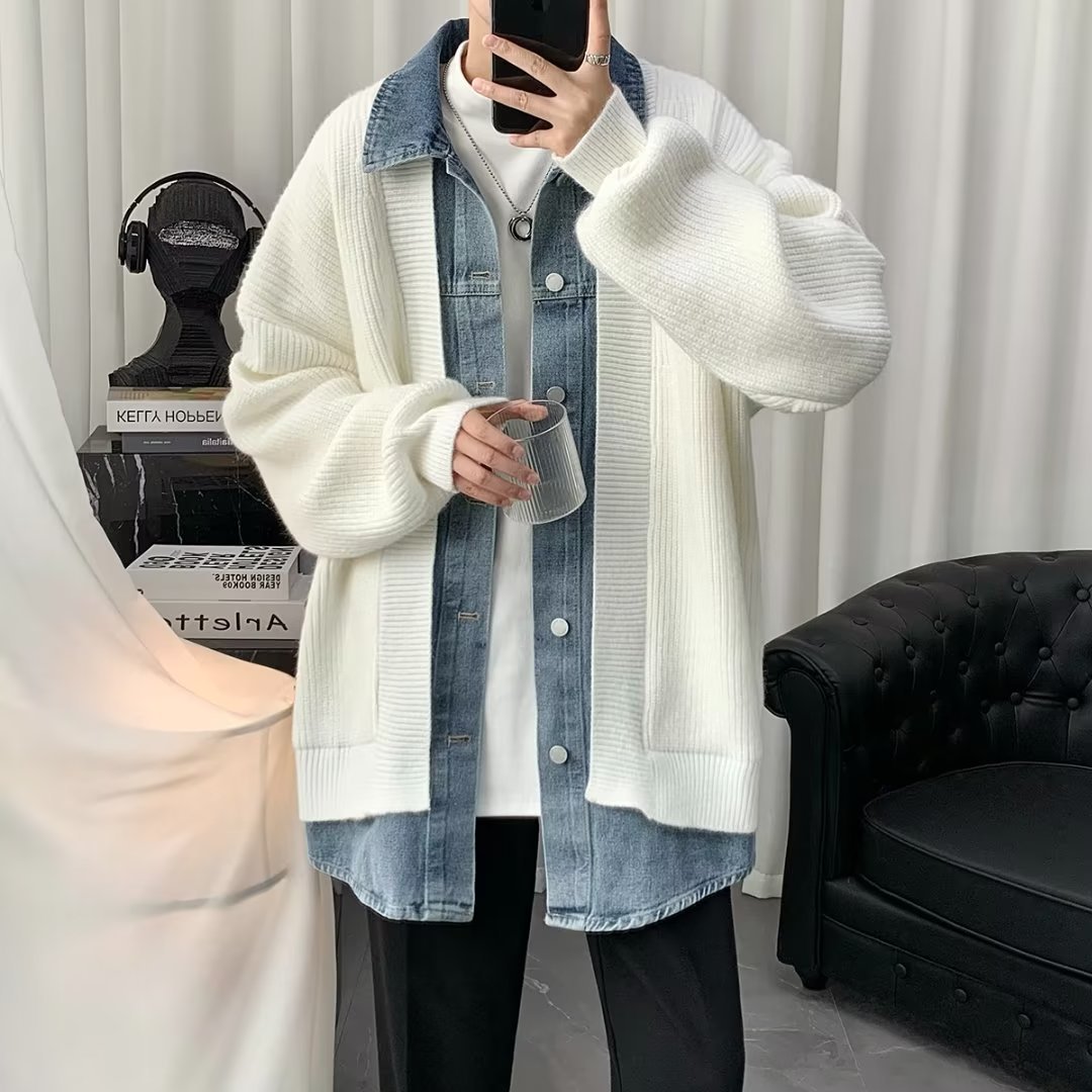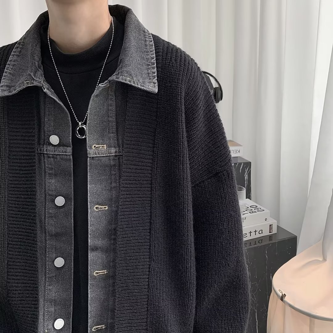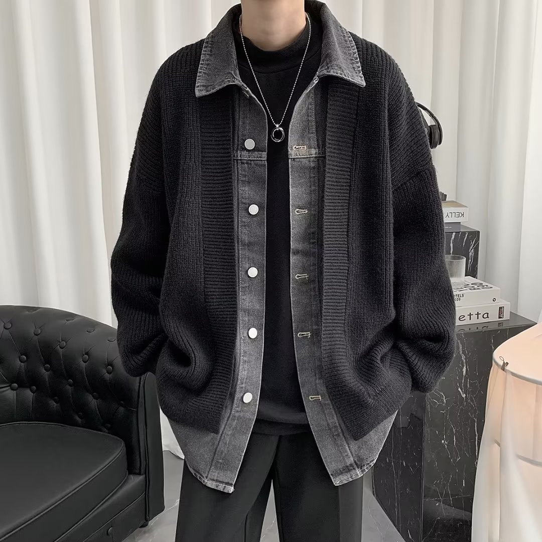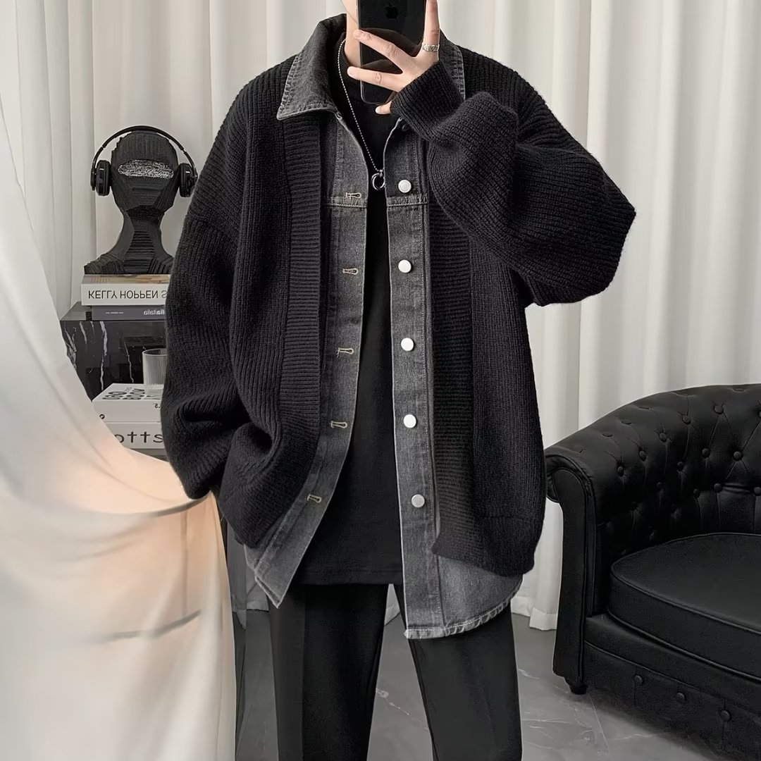 재킷 남성 2023 가을 겨울 새로운 남성 니트 가디건 재킷 가짜 투피스 컬러 매칭 의류 남성용 스웨터스토어 가기