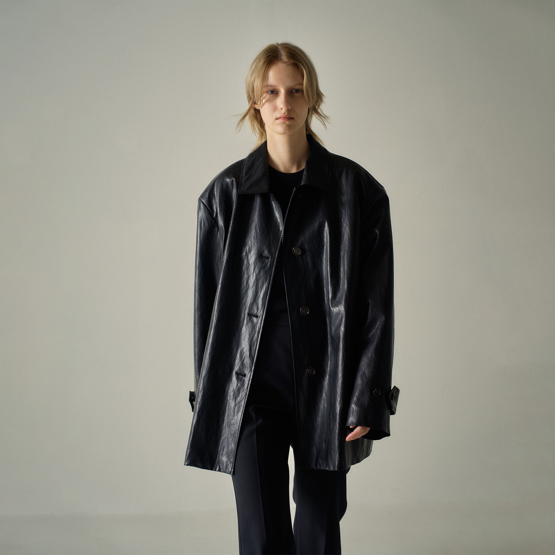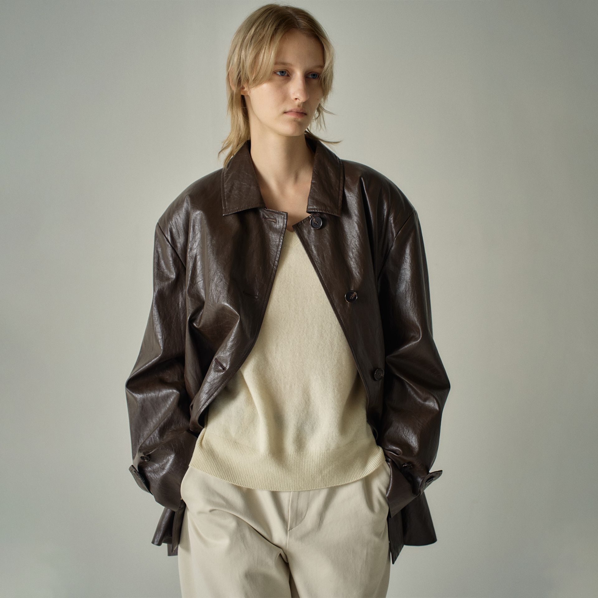 란미 와이드 숄더 가죽 여성 싱글 브레스트 매우 간단한 고급 중간 길이의 봄 및 가을 빈티지 재킷 코트