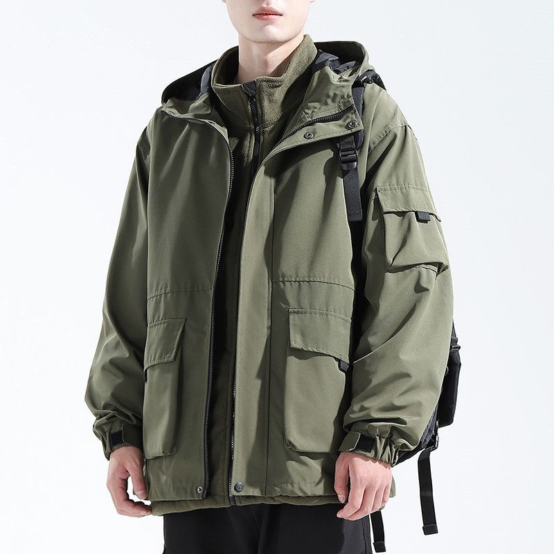 재킷 코트 남자의 가을과 겨울 방풍 방수 충전 옷 야외 등산 후드 멀티 포켓 툴링 단색 트렌디 트렌치 코트